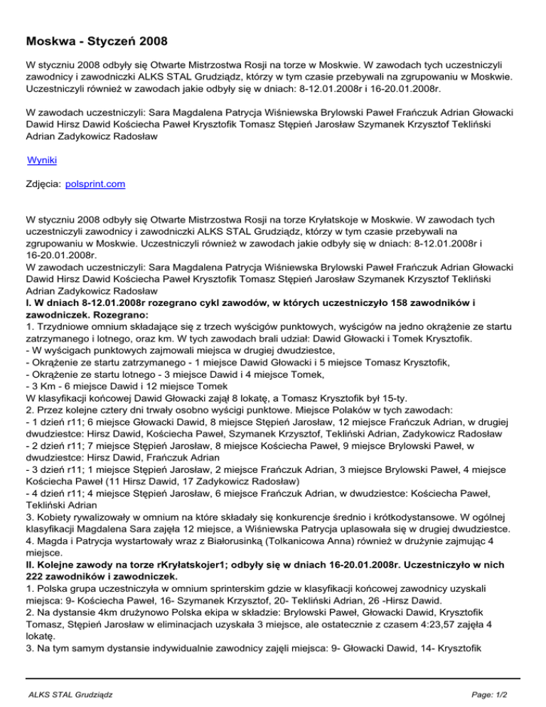Moskwa - Styczeń 2008 W styczniu 2008 odbyły się Otwarte Mistrzostwa Rosji na torze w Moskwie. W zawodach tych uczestniczyli zawodnicy i zawodniczki ALKS STAL Grudziądz, którzy w tym czasie przebywali na zgrupowaniu w Moskwie. Uczestniczyli również w zawodach jakie odbyły się w dniach: 8-12.01.2008r i 16-20.01.2008r. W zawodach uczestniczyli: Sara Magdalena Patrycja Wiśniewska Brylowski Paweł Frańczuk Adrian Głowacki Dawid Hirsz Dawid Kościecha Paweł Krysztofik Tomasz Stępień Jarosław Szymanek Krzysztof Tekliński Adrian Zadykowicz Radosław Wyniki Zdjęcia: polsprint.com W styczniu 2008 odbyły się Otwarte Mistrzostwa Rosji na torze Kryłatskoje w Moskwie. W zawodach tych uczestniczyli zawodnicy i zawodniczki ALKS STAL Grudziądz, którzy w tym czasie przebywali na zgrupowaniu w Moskwie. Uczestniczyli również w zawodach jakie odbyły się w dniach: 8-12.01.2008r i 16-20.01.2008r. W zawodach uczestniczyli: Sara Magdalena Patrycja Wiśniewska Brylowski Paweł Frańczuk Adrian Głowacki Dawid Hirsz Dawid Kościecha Paweł Krysztofik Tomasz Stępień Jarosław Szymanek Krzysztof Tekliński Adrian Zadykowicz Radosław I. W dniach 8-12.01.2008r rozegrano cykl zawodów, w których uczestniczyło 158 zawodników i zawodniczek. Rozegrano: 1. Trzydniowe omnium składające się z trzech wyścigów punktowych, wyścigów na jedno okrążenie ze startu zatrzymanego i lotnego, oraz km. W tych zawodach brali udział: Dawid Głowacki i Tomek Krysztofik. - W wyścigach punktowych zajmowali miejsca w drugiej dwudziestce, - Okrążenie ze startu zatrzymanego - 1 miejsce Dawid Głowacki i 5 miejsce Tomasz Krysztofik, - Okrążenie ze startu lotnego - 3 miejsce Dawid i 4 miejsce Tomek, - 3 Km - 6 miejsce Dawid i 12 miejsce Tomek W klasyfikacji końcowej Dawid Głowacki zajął 8 lokatę, a Tomasz Krysztofik był 15-ty. 2. Przez kolejne cztery dni trwały osobno wyścigi punktowe. Miejsce Polaków w tych zawodach: - 1 dzień r11; 6 miejsce Głowacki Dawid, 8 miejsce Stępień Jarosław, 12 miejsce Frańczuk Adrian, w drugiej dwudziestce: Hirsz Dawid, Kościecha Paweł, Szymanek Krzysztof, Tekliński Adrian, Zadykowicz Radosław - 2 dzień r11; 7 miejsce Stępień Jarosław, 8 miejsce Kościecha Paweł, 9 miejsce Brylowski Paweł, w dwudziestce: Hirsz Dawid, Frańczuk Adrian - 3 dzień r11; 1 miejsce Stępień Jarosław, 2 miejsce Frańczuk Adrian, 3 miejsce Brylowski Paweł, 4 miejsce Kościecha Paweł (11 Hirsz Dawid, 17 Zadykowicz Radosław) - 4 dzień r11; 4 miejsce Stępień Jarosław, 6 miejsce Frańczuk Adrian, w dwudziestce: Kościecha Paweł, Tekliński Adrian 3. Kobiety rywalizowały w omnium na które składały się konkurencje średnio i krótkodystansowe. W ogólnej klasyfikacji Magdalena Sara zajęła 12 miejsce, a Wiśniewska Patrycja uplasowała się w drugiej dwudziestce. 4. Magda i Patrycja wystartowały wraz z Białorusinką (Tolkanicowa Anna) również w drużynie zajmując 4 miejsce. II. Kolejne zawody na torze rKryłatskojer1; odbyły się w dniach 16-20.01.2008r. Uczestniczyło w nich 222 zawodników i zawodniczek. 1. Polska grupa uczestniczyła w omnium sprinterskim gdzie w klasyfikacji końcowej zawodnicy uzyskali miejsca: 9- Kościecha Paweł, 16- Szymanek Krzysztof, 20- Tekliński Adrian, 26 -Hirsz Dawid. 2. Na dystansie 4km drużynowo Polska ekipa w składzie: Brylowski Paweł, Głowacki Dawid, Krysztofik Tomasz, Stępień Jarosław w eliminacjach uzyskała 3 miejsce, ale ostatecznie z czasem 4:23,57 zajęła 4 lokatę. 3. Na tym samym dystansie indywidualnie zawodnicy zajęli miejsca: 9- Głowacki Dawid, 14- Krysztofik ALKS STAL Grudziądz Page: 1/2 Tomasz, 15-Brylowski Paweł, 21- Frańczuk Adrian, 25- Zadykowicz Radosław 4.W scratchu Dawid Głowacki wywalczył 3 miejsce. 5. W wyścigu punktowym Polacy zajęli: 4 miejsce -Brylowski Paweł,13 miejsce - Głowacki Dawid, 19 miejsce -Krysztofik Tomasz 6. Kobiety: Magdalena Sara i Patrycja Wiśniewska w drużynie z Sawczenko Eleną były drugie. 7. W konkurencjach indywidualnych - Scratch: 5 miejsce Sara Magdalena 10 miejsce Wiśniewska Patrycja - Wyścig punktowy: 10 miejsce Wiśniewska Patrycja 12 miejsce Sara Magdalena - 3KM: 7 miejsce Sara Magdalena 14 miejsce Wiśniewska Patrycja - Wyścig australijski: 5 miejsce Sara Magdalena 14 miejsce Wiśniewska Patrycja Opracowanie: Katarzyna Tołomanow Zdjęcia: polsprint.com Dodane przez : Jacek, dnia 03 luty 2008 00:00:00 ALKS STAL Grudziądz Page: 2/2