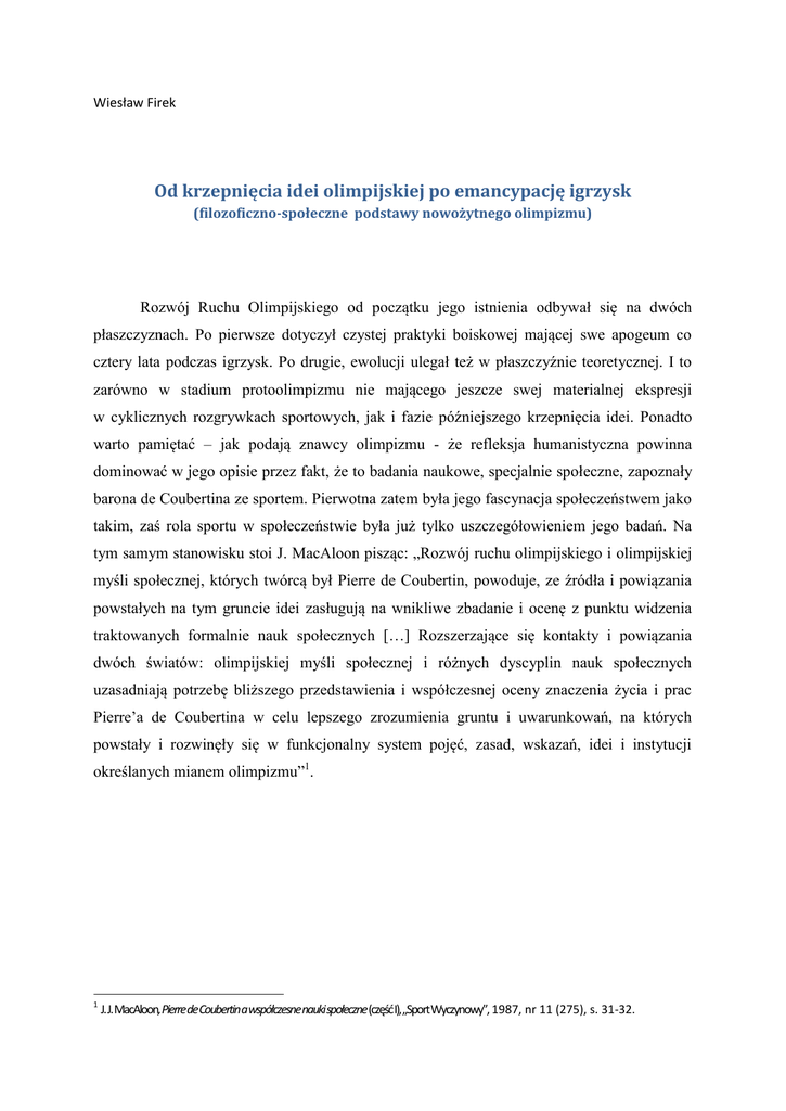 Wiesław Firek Od krzepnięcia idei olimpijskiej po emancypację igrzysk (filozoficzno-społeczne podstawy nowożytnego olimpizmu) Rozwój Ruchu Olimpijskiego od początku jego istnienia odbywał się na dwóch płaszczyznach. Po pierwsze dotyczył czystej praktyki boiskowej mającej swe apogeum co cztery lata podczas igrzysk. Po drugie, ewolucji ulegał też w płaszczyźnie teoretycznej. I to zarówno w stadium protoolimpizmu nie mającego jeszcze swej materialnej ekspresji w cyklicznych rozgrywkach sportowych, jak i fazie późniejszego krzepnięcia idei. Ponadto warto pamiętać – jak podają znawcy olimpizmu - że refleksja humanistyczna powinna dominować w jego opisie przez fakt, że to badania naukowe, specjalnie społeczne, zapoznały barona de Coubertina ze sportem. Pierwotna zatem była jego fascynacja społeczeństwem jako takim, zaś rola sportu w społeczeństwie była już tylko uszczegółowieniem jego badań. Na tym samym stanowisku stoi J. MacAloon pisząc: „Rozwój ruchu olimpijskiego i olimpijskiej myśli społecznej, których twórcą był Pierre de Coubertin, powoduje, ze źródła i powiązania powstałych na tym gruncie idei zasługują na wnikliwe zbadanie i ocenę z punktu widzenia traktowanych formalnie nauk społecznych […] Rozszerzające się kontakty i powiązania dwóch światów: olimpijskiej myśli społecznej i różnych dyscyplin nauk społecznych uzasadniają potrzebę bliższego przedstawienia i współczesnej oceny znaczenia życia i prac Pierre’a de Coubertina w celu lepszego zrozumienia gruntu i uwarunkowań, na których powstały i rozwinęły się w funkcjonalny system pojęć, zasad, wskazań, idei i instytucji określanych mianem olimpizmu”1. 1 J. J. MacAloon,PierredeCoubertinawspółczesnenauki społeczne (część I),„SportWyczynowy”, 1987, nr 11 (275), s. 31-32. „Wiek XIX obudził powszechny apetyt na sport; świt zastał go w Niemczech i Szwecji, południe w Anglii, a zachód słońca we Francji i USA (…). Sportowcy z różnych krajów musieli więc zacząć spotykać się na wspólnej ziemi, (…) [przez co] możliwe, a nawet, powiedziałbym, konieczne było wskrzeszenie igrzysk olimpijskich” Pierre de Coubertin Gromadzenie ludzi z całego świata w jednym miejscu tylko po to, by uprawiali sport, było w XIX wieku uważane przez niektórych za pewną osobliwość, a nawet absurd 2. Wszyscy się zgodzą, że Coubertin wraz ze swoimi przyjaciółmi i towarzyszami pracy wyprzedzili swoje czasy wizją sportu międzynarodowego, widząc w tych spotkaniach nie tylko możliwość wyłonienia najlepszego zawodnika globu w danej konkurencji, ale też – a może przede wszystkim – stworzenia forum dla ogólnoświatowego braterstwa. Z tego powodu, inicjator igrzysk powołał się na starożytną ideę ekecheirii i model kalokagatii. Wiek XIX według niego głodny był igrzysk. Lecz baron de Coubertin wypowiada się również w odmiennym tonie: „Wszystkie moje badania przekonały mnie, że pod koniec stulecia, które było świadkiem odrodzenia się sportu, groziło mu już wielkie niebezpieczeństwo utraty znaczenia, jeżeli energicznie temu nie zaradzimy (…). Ze wszystkich środków do tego celu tylko jeden wydawał się wykonalny, mianowicie zorganizowanie cyklicznych zawodów. Należało się zwrócić do towarzystw sportowych z różnych krajów, by wysłały na nie swoich przedstawicieli, i zorganizować te zawody pod jedynym patronatem, który mógł ozdobić je aureolą wielkości i chwały – patronatem starożytności. Oznaczało to wskrzeszenie igrzysk olimpijskich (…) i tak triumfalnie narodziła się ta idea”3. Zdecydowanie pobłądził myślą francuz przeceniając wartość igrzysk, gdyż pomysł rywalizacji o światowym zasięgu nie był nowy i oryginalny. Już wtedy odbywały się mistrzostwa świata w wielu dyscyplinach, a powyższe słowa mają raczej wydźwięk propagandowy niźli przedstawiający fakty. Diagnoza, że jest świadkiem utraty znaczenia sportu w momencie jego największego rozkwitu są przesadzone i na wyrost. Bez zrekonstruowanych igrzysk olimpijskich, świat sportu (już to poniekąd czynił) wypracowałby własną formułę międzynarodowej rywalizacji. Bez antycznych wzorów sport nie byłby bezradny, bo i tak sięgnął do etosu rycerskiego 2 Zob. D. Miller, Historia igrzysk olimpijskich i MKOL. Od Aten do Pekinu 1894 – 2008, Dom Wydawniczy Rebis, Poznań 2008, s. 50. 3 Cyt. za Tamże, s. 43. i angielskiego modelu gentelmana. Coubertin odkrył jedynie tajemnicę sportów angielskich, ale sam oprócz wzbogacenia walki o wymiar duchowy przesycony górnolotnymi wartościami, niczego nie dokonał, czego nie próbowałby akurat rodzący się sport. Szedł już on wtedy własną drogą. Powoli, ale rozpędzający się wewnętrzna siłą, przeprowadzał pierwsze ogólnoświatowe imprezy (boks, zapasy), i nieunikniona była jego dalsza ekspansja. Nie tylko sport w jego głównym wydaniu, ale wychowanie fizyczne zdobywało uznanie wśród ogółu społeczeństwa, mając swe podwójne źródło: humanistyczne (Coubertin) i przyrodnicze (higieniczne, fizjologiczne). To drugie biło mocniej. Poparte wynikami badań naukowych wskazywało na korzyści zdrowotne ukierunkowanej aktywności fizycznej. R. Wroczyński formułuje tezę, „iż w końcu XIX wieku rozwój wychowania fizycznego i sportu osiągnął poziom, w którym bardziej powszechna i międzynarodowa organizacja działaczy sportowych stawała się niezbędna”4. Dodajmy, że również możliwa. Kraje Europy Zachodniej pokryły się siecią zrzeszeń i klubów. Rosło znaczenie związków sportowych poszukujących swej publicznej ekspresji, nowej szerszej formuły rywalizacji, platformy porozumienia i współpracy. W porę ze swoją inicjatywą Pierre de Coubertin wyszedł naprzeciw oczekiwaniom i to w dość atrakcyjnej formie rozpalającej wyobraźnię. Adekwatność coubertinowskiej propozycji można wyrazić w dwóch płaszczyzna