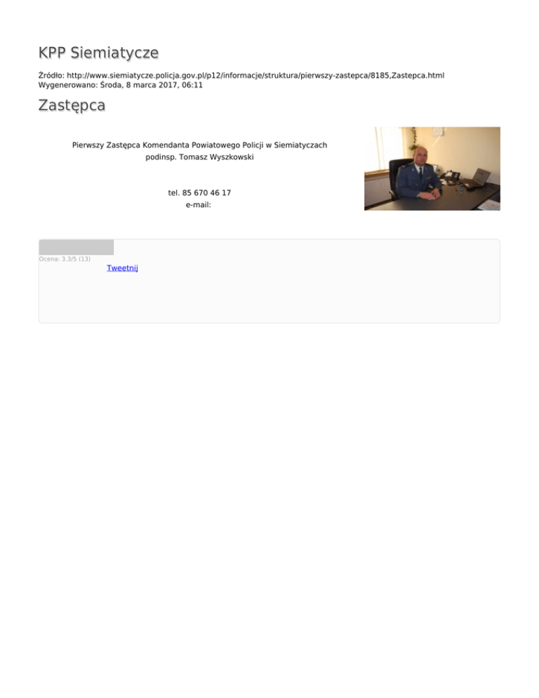 KPP Siemiatycze Źródło: http://www.siemiatycze.policja.gov.pl/p12/informacje/struktura/pierwszy-zastepca/8185,Zastepca.html Wygenerowano: Środa, 8 marca 2017, 06:11 Zastępca Pierwszy Zastępca Komendanta Powiatowego Policji w Siemiatyczach podinsp. Tomasz Wyszkowski tel. 85 670 46 17 e-mail: Ocena: 3.3/5 (13) Tweetnij
