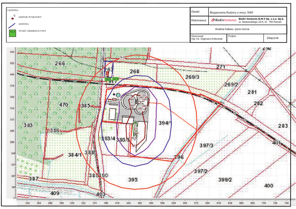 LEGENDA Obiekt c EMITOR PUNKTOWY Biogazownia Rudziny o mocy 1MW BioEn Ventures B.M.V Sp. z o.o. Sp.k. ul. Noskowskiego 22/4, 61 705 Poznań Wykonawca IZOFONA 33,4 PUNKT OBSERWACYJNY Analiza hałasu -pora nocna Opracował: mgr inż. Dagmara Antkowiak Podpis: Załącznik