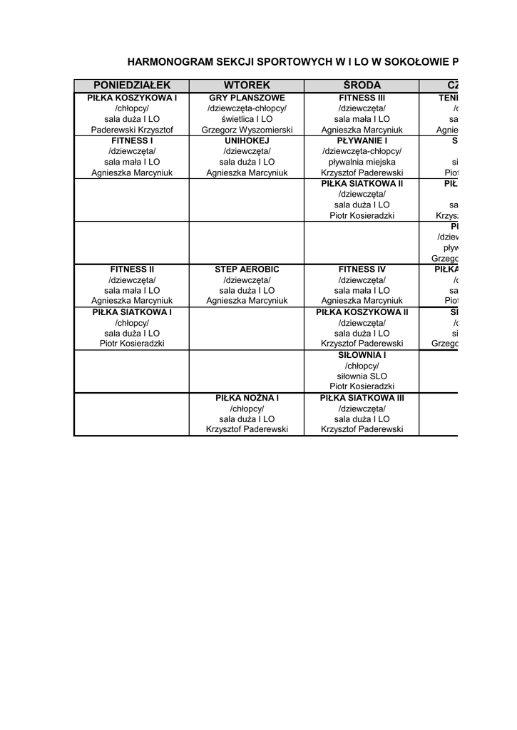 HARMONOGRAM SEKCJI SPORTOWYCH W I LO W SOKOŁOWIE PODLASKIM PONIEDZIAŁEK WTOREK ŚRODA CZWARTEK PIŁKA KOSZYKOWA I /chłopcy/ sala duża I LO Paderewski Krzysztof FITNESS I /dziewczęta/ sala mała I LO Agnieszka Marcyniuk GRY PLANSZOWE /dziewczęta-chłopcy/ świetlica I LO Grzegorz Wyszomierski UNIHOKEJ /dziewczęta/ sala duża I LO Agnieszka Marcyniuk FITNESS III /dziewczęta/ sala mała I LO Agnieszka Marcyniuk PŁYWANIE I /dziewczęta-chłopcy/ pływalnia miejska Krzysztof Paderewski PIŁKA SIATKOWA II /dziewczęta/ sala duża I LO Piotr Kosieradzki FITNESS II /dziewczęta/ sala mała I LO Agnieszka Marcyniuk PIŁKA SIATKOWA I /chłopcy/ sala duża I LO Piotr Kosieradzki STEP AEROBIC /dziewczęta/ sala duża I LO Agnieszka Marcyniuk FITNESS IV /dziewczęta/ sala mała I LO Agnieszka Marcyniuk PIŁKA KOSZYKOWA II /dziewczęta/ sala duża I LO Krzysztof Paderewski SIŁOWNIA I /chłopcy/ siłownia SLO Piotr Kosieradzki PIŁKA SIATKOWA III /dziewczęta/ sala duża I LO Krzysztof Paderewski TENIS STOŁOWY I /dziewczęta/ sala mała I LO Agnieszka Marcyniuk SIŁOWNIA II /chłopcy/ siłownia SLO Piotr Kosieradzki PIŁKA NOŻNA II /chłopcy/ sala duża I LO Krzysztof Paderewski PŁYWANIE II /dziewczęta-chłopcy/ pływalnia miejska Grzegorz Wyszomiersk PIŁKA SIATKOWA IV /dziewczęta/ sala duża I LO Piotr Kosieradzki SIŁOWNIA IV /dziewczęta/ siłownia SLO Grzegorz Wyszomiersk PIŁKA NOŻNA I /chłopcy/ sala duża I LO Krzysztof Paderewski OŁOWIE PODLASKIM 2015/2016 sem I CZWARTEK PIĄTEK TENIS STOŁOWY I /dziewczęta/ sala mała I LO Agnieszka Marcyniuk SIŁOWNIA II /chłopcy/ siłownia SLO Piotr Kosieradzki PIŁKA NOŻNA II /chłopcy/ sala duża I LO Krzysztof Paderewski PŁYWANIE II /dziewczęta-chłopcy/ pływalnia miejska Grzegorz Wyszomierski PIŁKA SIATKOWA IV /dziewczęta/ sala duża I LO Piotr Kosieradzki SIŁOWNIA IV /dziewczęta/ siłownia SLO Grzegorz Wyszomierski PIŁKA RĘCZNA /dziewczęta-chłopcy/ sala duża I LO Grzegorz Wyszomierski TENIS STOŁOWY II /chłopcy/ sala mała I LO Piotr Kosieradzki NORDIC WALKING /dziewczęta-chłopcy/ stadion OSiR Krzysztof Paderewski PIŁKA NOŻNA III /dziewczęta/ sala duża I LO Piotr Kosieradzki SIŁOWNIA III /dziewczęta/ siłownia SLO Grzegorz Wyszomierski Lekcja 8 i 9, godz. 14.30 - 16.00 Lekcja 10 i 11, godz. 16.00 - 17.30 Lekcja 12 i 13, godz. 17.30 - 19.00