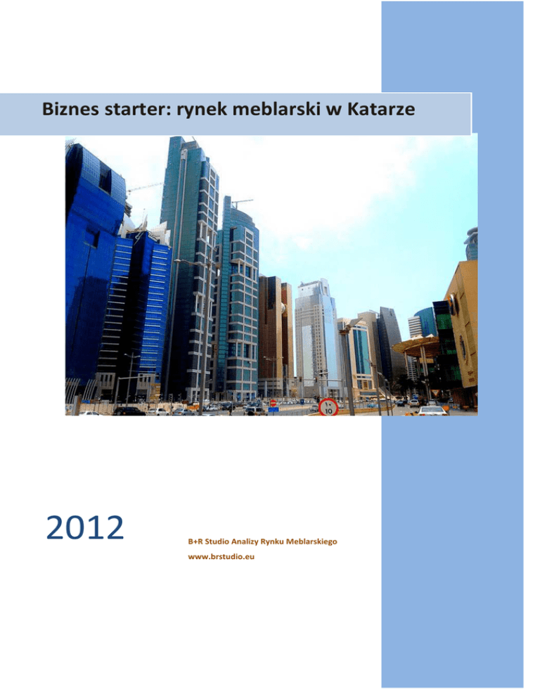 Biznes starter: rynek meblarski w Katarze 2012 B+R Studio Analizy Rynku Meblarskiego www.brstudio.eu Biznes starter: rynek meblarski w Katarze Opracowanie wykonane w czerwcu 2012 roku Opracowanie merytoryczne: dr inż. Tomasz Wiktorski, mgr Milena Dorozińska; B+R STUDIO Źródła danych: Organizacja Narodów Zjednoczonych, Międzynarodowy Fundusz Walutowy, Ministerstwo Gospodarki RP i Ambasada Rzeczypospolitej Polskiej w Katarze, The World Factbook Opracowanie graficzne: B+R Studio Druk: B+R Studio Wydanie 2012 © 2012. Prawo do powielania i rozpowszechniania dowolną techniką w celach komercyjnych zastrzeżone. Prawa autorskie posiada B+R Studio Tomasz Wiktorski. W celach naukowych możliwe jest wykorzystanie niniejszego materiału z zachowaniem zasad cytowania (z powołaniem się na źródło). B+R Studio nie ponosi odpowiedzialności za sposób wykorzystania danych prezentowanych w niniejszym opracowaniu. Wszystkie obliczenia wykonane zostały przez B+R Studio bazując na oficjalnych danych lub wywiadzie eksperckim. Dane szacunkowe wyraźnie zaznaczono. Zaprezentowane zdjęcia w raporcie mają charakter ilustracyjny i nie stanowią podstawy do stwierdzenia, że są one reprezentatywne dla kanonu obowiązującego w danym kraju. Wszystkie zdjęcia z licencją Creative Commons pochodzą ze strony www.flickr.com. Na okładce: City Center in Doha, Qatar by dallasm12 B+R Studio Tomasz Wiktorski Kietlin, ul. Słoneczna 3 97-500 Radomsko www.brstudio.eu [email protected] www.brstudio.eu Strona 2 Biznes starter: rynek meblarski w Katarze Spis treści Dlaczego warto inwestować na rynku meblarskim w Katarze? .......................................................... 3 Podstawowe informacje o Katarze...................................................................................................... 4 Położenie geograficzne i warunki życia ........................................................................................... 4 Gospodarka ..................................................................................................................................... 5 Turystyka ......................................................................................................................................... 5 Rynek meblarski .................................................................................................................................. 7 Produkcja mebli ............................................................................................................................... 7 Import .............................................................................................................................................. 7 Eksport ........................................................................................................................................... 12 Klienci i ich preferencje ................................................................................................................. 16 Handel meblami ............................................................................................................................ 17 Produkcja materiałów drewnopochodnych .................................................................................. 18 Informacje praktyczne ....................................................................................................................... 18 Bariery wejścia............................................................................................................................... 18 Wizy ............................................................................................................................................... 19 Komunikacja .................................................................................................................................. 19 Instytucje wspierające ................................................................................................................... 19 Lista firm, instytucji , targi ............................................................................................................. 20 Spis tabel i rysunków ......................................................................................................................... 21 Dlaczego warto inwestować na rynku meblarskim w Katarze? W związku z dynamicznym rozwojem Kataru, potrzeby importowe tego kraju stwarzają obiecujące możliwości dla eksporterów z całego świata. Dzięki dużym zasobom finansowym oraz aktywnej polityce inwestycyjnej Katar jest atrakcyjnym partnerem współpracy. Nie da się zaprzeczyć, że inwestycje Kataru w celu utrzymania pokoju i dobrobytu widoczne są na całym świecie, a jego dyplomacja jest aktywna na arenie międzynarodowej. Katar prezentuje najlepszy model w regionie Zatoki Perskiej do naśladowania. Jego szybki wzrost gospodarczy pozwolił mu stać się jednym z najbogatszych państw świata. Niewielka produkcja mebli nie zaspokaja potrzeb mieszkańców, dlatego importowane meble znajdują popyt na rynku katarskim. Należy również wspomnieć o branży hotelarskiej, która rośnie w potężnym tempie. W ciągu najbliższych kilku lat planuje się otwarcie ponad 30 hoteli. Nie bez znaczenia jest również rola gospodarza Mundialu, którą będzie pełnił Katar w 2022 roku. www.brstudio.eu Strona 3 Biznes starter: rynek meblarski w Katarze Spis tabel i rysunków Rysunek 1 Import i eksport mebli z Kataru w latach 2007-2010............................................................. 7 Rysunek 2 Wartość importu mebli do Kataru według grup CN w USD 2007-2010 ................................. 8 Rysunek 3 Import mebli do Kataru według grup CN w tonach ............................................................... 9 Rysunek 4 Przeciętne cena importowanych mebli do Kataru według grup CN ...................................... 9 Rysunek 5 Główni dostawcy mebli z grupy CN 9401 do Kataru ......................