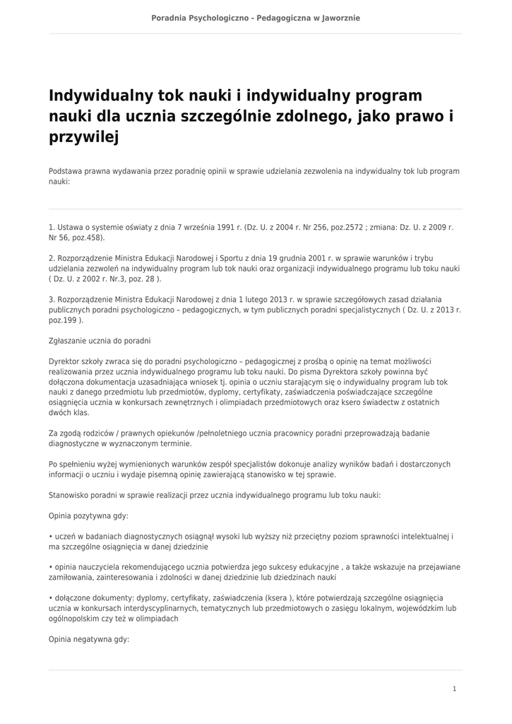 Poradnia Psychologiczno - Pedagogiczna w Jaworznie Indywidualny tok nauki i indywidualny program nauki dla ucznia szczególnie zdolnego, jako prawo i przywilej Podstawa prawna wydawania przez poradnię opinii w sprawie udzielania zezwolenia na indywidualny tok lub program nauki: 1. Ustawa o systemie oświaty z dnia 7 września 1991 r. (Dz. U. z 2004 r. Nr 256, poz.2572 ; zmiana: Dz. U. z 2009 r. Nr 56, poz.458). 2. Rozporządzenie Ministra Edukacji Narodowej i Sportu z dnia 19 grudnia 2001 r. w sprawie warunków i trybu udzielania zezwoleń na indywidualny program lub tok nauki oraz organizacji indywidualnego programu lub toku nauki ( Dz. U. z 2002 r. Nr.3, poz. 28 ). 3. Rozporządzenie Ministra Edukacji Narodowej z dnia 1 lutego 2013 r. w sprawie szczegółowych zasad działania publicznych poradni psychologiczno – pedagogicznych, w tym publicznych poradni specjalistycznych ( Dz. U. z 2013 r. poz.199 ). Zgłaszanie ucznia do poradni Dyrektor szkoły zwraca się do poradni psychologiczno – pedagogicznej z prośbą o opinię na temat możliwości realizowania przez ucznia indywidualnego programu lub toku nauki. Do pisma Dyrektora szkoły powinna być dołączona dokumentacja uzasadniająca wniosek tj. opinia o uczniu starającym się o indywidualny program lub tok nauki z danego przedmiotu lub przedmiotów, dyplomy, certyfikaty, zaświadczenia poświadczające szczególne osiągnięcia ucznia w konkursach zewnętrznych i olimpiadach przedmiotowych oraz ksero świadectw z ostatnich dwóch klas. Za zgodą rodziców / prawnych opiekunów /pełnoletniego ucznia pracownicy poradni przeprowadzają badanie diagnostyczne w wyznaczonym terminie. Po spełnieniu wyżej wymienionych warunków zespół specjalistów dokonuje analizy wyników badań i dostarczonych informacji o uczniu i wydaje pisemną opinię zawierającą stanowisko w tej sprawie. Stanowisko poradni w sprawie realizacji przez ucznia indywidualnego programu lub toku nauki: Opinia pozytywna gdy: • uczeń w badaniach diagnostycznych osiągnął wysoki lub wyższy niż przeciętny poziom sprawności intelektualnej i ma szczególne osiągnięcia w danej dziedzinie • opinia nauczyciela rekomendującego ucznia potwierdza jego sukcesy edukacyjne , a także wskazuje na przejawiane zamiłowania, zainteresowania i zdolności w danej dziedzinie lub dziedzinach nauki • dołączone dokumenty: dyplomy, certyfikaty, zaświadczenia (ksera ), które potwierdzają szczególne osiągnięcia ucznia w konkursach interdyscyplinarnych, tematycznych lub przedmiotowych o zasięgu lokalnym, wojewódzkim lub ogólnopolskim czy też w olimpiadach Opinia negatywna gdy: 1 Poradnia Psychologiczno - Pedagogiczna w Jaworznie • uczeń osiągnął niższe niż wymagane wyniki w badaniu psychologiczno-pedagogicznym • stan zdrowia ucznia stanowi realną przeszkodę dla jego intensywnej nauki • dołączone dokumenty: dyplomy, certyfikaty, zaświadczenia nie dotyczą przedmiotu lub przedmiotów, z których uczeń chce realizować indywidualny program lub tok nauki • dołączone dokumenty: dyplomy, certyfikaty, zaświadczenia świadczą o udziale ucznia w konkursach na szczeblu jedynie szkolnym ( w swojej szkole ) • nie została dostarczona wymagana dokumentacja 2