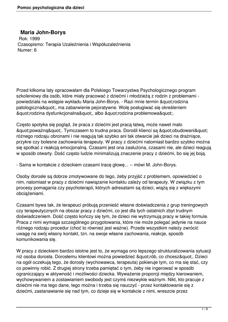 Pomoc psychologiczna dla dzieci Maria John-Borys Rok: 1999 Czasopismo: Terapia Uzależnienia i Współuzależnienia Numer: 6 Przed kilkoma laty opracowałam dla Polskiego Towarzystwa Psychologicznego program szkoleniowy dla osób, które miały pracować z dziećmi i młodzieżą z rodzin z problemami powiedziała na wstępie wykładu Maria John-Borys. - Razi mnie termin "rodzina patologiczna", ma zabarwienie pejoratywne. Wolę posługiwać się określeniem "rodzina dysfunkcjonalna", albo "rodzina problemowa". Często spotyka się pogląd, że praca z dziećmi jest pracą łatwą, może nawet mało "poważną". Tymczasem to trudna praca. Dorośli klienci są "obudowani" różnego rodzaju obronami i nie reagują tak szybko ani tak otwarcie jak dzieci na drażniące, przykre czy bolesne zachowania terapeuty. W pracy z dziećmi natomiast bardzo szybko można się spotkać z reakcją emocjonalną. Czasami jest ona zasłużona, czasami nie, ale dzieci reagują w sposób otwarty. Dość często ludzie minimalizują znaczenie pracy z dziećmi, bo się jej boją. - Sama w kontakcie z dzieckiem czasami tracę głowę... -- mówi M. John-Borys. Osoby dorosłe są dobrze zmotywowane do tego, żeby przyjść z problemem, opowiedzieć o nim, natomiast w pracy z dziećmi nawiązanie kontaktu zależy od terapeuty. W związku z tym procesy pomagania czy psychoterapii, których adresatami są dzieci, wiążą się z większymi obciążeniami. Czasami bywa tak, że terapeuci próbują przenieść własne doświadczenia z grup treningowych czy terapeutycznych na obszar pracy z dziećmi, co jest dla tych ostatnich zbyt trudnym doświadczeniem. Dość często kończy się tym, że dzieci nie wytrzymują pracy w takiej formule. Praca z nimi wymaga szczególnego przygotowania, które nie może polegać jedynie na nauce różnego rodzaju procedur (choć to również jest ważne). Przede wszystkim należy zwrócić uwagę na swój własny kontakt, tzn. na swoje własne zachowania, reakcje, sposób komunikowania się. W pracy z dzieckiem bardzo istotne jest to, że wymaga ono lepszego strukturalizowania sytuacji niż osoba dorosła. Dorosłemu klientowi można powiedzieć "rób, co chcesz". Dzieci na ogół oczekują tego, że dorosły (wychowawca, terapeuta) pokieruje tym, co ma się stać, czy co powinny robić. Z drugiej strony trzeba pamiętać o tym, żeby nie ingerować w sposób ograniczający w aktywność i możliwości dziecka. Wyważenie proporcji między kierowaniem, wychowywaniem a zostawianiem swobody jest czymś niezwykle ważnym. Nikt, kto pracuje z dziećmi nie ma tego dane, tego można i trzeba się nauczyć - przez kontaktowanie się z dziećmi, zastanawianie się nad tym, co dzieje się w kontakcie z nimi, wreszcie przez 1/9 Pomoc psychologiczna dla dzieci otrzymywanie informacji zwrotnych w postaci superwizji czy konsultacji. Zakładam, że celem każdego oddziaływania pomocnego dla dziecka jest umożliwienie mu rozwoju, tzn. zaktualizowanie jego wszystkich możliwości. Dziecko z natury posiada duży potencjał rozwojowy i tak naprawdę chodzi tylko o to, żeby stworzyć mu takie warunki, które ten rozwój będą mu umożliwiały. Najczęściej rozwój definiuje się jako zaspokajanie potrzeb. Zwykle występują tu związki z koncepcjami humanistycznymi, a szczególnie z teorią potrzeb Abrahama Maslowa. Mówi się o tym, że każdy z nas, a zwłaszcza dziecko, jest zależny od otoczenia. Ponieważ w przypadku dziecka, oznacza to głównie zależność od dorosłych, zatem zadaniem osób dorosłych, zajmujących się wychowaniem, jest stworzenie dziecku takich warunków, które umożliwiłyby mu realizację potrzeb. Rodziny, które nie zaspokajają, bądź też zaspokajają w niekompletny sposób potrzeby psychologiczne dziecka, nazywamy rodzinami dysfunkcjonalnymi. *** Na poziomie podstawowym, żeby dziecko mogło się rozwijać, potrzebne jest zaspokojenie jego potrzeb biologicznych oraz potrzeby bezpieczeństwa. Potrzeba bezpieczeństwa jest bardzo ważna, ponieważ przekształca się później w potrzebę przynależności, a jej realizacja jest niezbędna do tego, żeby dziecko w naturalny sposób przyswoiło sobie różnego rodzaju normy. Jeśli dziecko czuje się bezpieczne, kochane, czuje związek z osobą dorosłą, to w naturalny sposób będzie starało się naśladować jej zachowanie. Bardzo często dzieci zachowują się w sposób zgodny z normami nie dlatego, że czerpią przyjemność z bycia grzecznymi, ale dlatego, że sprawia im przyjemność zadowolenie dorosłych, kiedy one zachowują się dobrze. Ponieważ kochają dorosłych, są zainteresowane tym, żeby zachowywać się dobrze po to, żeby dorośli objawiali im radość, miłość, życzliwość. Zwykle mówimy, że osoby dojrzałe to takie, które mają zinternalizowane normy, np. "nie kłam", "nie krzywdź ludzi, zwierząt", "czyń dobrze". Dzieci potrafią "czynić dobrze" - zależy to oczywiście od pewnych warunków związanych z wiekiem, ale na ogół w wieku dziewięciu-dziesięciu lat potrafią to robić, nie dlatego, że tak bardzo obawiają się zewnętrznej kary, ale dlatego, że w efekcie dobrych kontaktów z dorosłymi mają te zasady uwewnętrznione. Są też takie osoby, które tych zasad nie uwewnętrzniają nigdy i nawet będąc już dorosłymi ograniczają swoje złe zachowania, głównie ze względu na to, że boją się kary pochodzącej z zewnątrz. Najczęściej dzieje się tak, gdy osoby te w dzieciństwie nie miały wystarczająco dobrych, bezpiecznych kontaktów z dorosłymi. Za fundamentalną sprawę uważam nawiązanie dobrego kontaktu między dzieckiem a dorosłym. W kontakcie z dorosłym, który z nim pracuje, dziecko musi czuć się bezpiecznie. Bardzo dobrze jest, żeby dziecko lubiło tę osobę, choć niedobrze jest starać się robić to na siłę. Ciekawe, że często dorośli, którzy zajmują się wychowywaniem dzieci - można to na przykład zauważyć w różnych instytucjach 