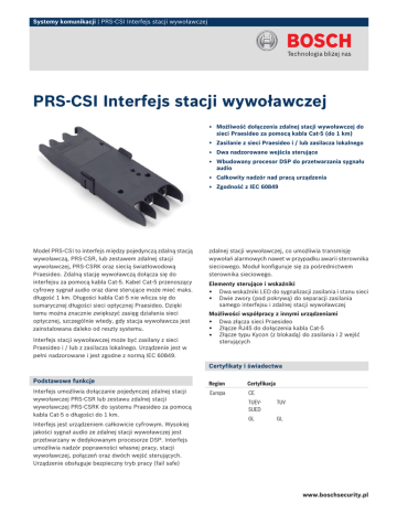 Systemy komunikacji | PRS‑CSI Interfejs stacji wywoławczej PRS‑CSI Interfejs stacji wywoławczej ▶ Możliwość dołączenia zdalnej stacji wywoławczej do sieci Praesideo za pomocą kabla Cat-5 (do 1 km) ▶ Zasilanie z sieci Praesideo i / lub zasilacza lokalnego ▶ Dwa nadzorowane wejścia sterujące ▶ Wbudowany procesor DSP do przetwarzania sygnału audio ▶ Całkowity nadzór nad pracą urządzenia ▶ Zgodność z IEC 60849 Model PRS‑CSI to interfejs między pojedynczą zdalną stacją wywoławczą, PRS‑CSR, lub zestawem zdalnej stacji wywoławczej, PRS‑CSRK oraz siecią światłowodową Praesideo. Zdalną stację wywoławczą dołącza się do interfejsu za pomocą kabla Cat-5. Kabel Cat-5 przenoszący cyfrowy sygnał audio oraz dane sterujące może mieć maks. długość 1 km. Długości kabla Cat-5 nie wlicza się do sumarycznej długości sieci optycznej Praesideo. Dzięki temu można znacznie zwiększyć zasięg działania sieci optycznej, szczególnie wtedy, gdy stacja wywoławcza jest zainstalowana daleko od reszty systemu. Interfejs stacji wywoławczej może być zasilany z sieci Praesideo i / lub z zasilacza lokalnego. Urządzenie jest w pełni nadzorowane i jest zgodne z normą IEC 60849. zdalnej stacji wywoławczej, co umożliwia transmisję wywołań alarmowych nawet w przypadku awarii sterownika sieciowego. Moduł konfiguruje się za pośrednictwem sterownika sieciowego. Elementy sterujące i wskaźniki • Dwa wskaźniki LED do sygnalizacji zasilania i stanu sieci • Dwie zwory (pod pokrywą) do separacji zasilania samego interfejsu i zdalnej stacji wywoławczej Możliwości współpracy z innymi urządzeniami • Dwa złącza sieci Praesideo • Złącze RJ45 do dołączenia kabla Cat-5 • Złącze typu Kycon (z blokadą) do zasilania i 2 wejść sterujących Certyfikaty i świadectwa Podstawowe funkcje Interfejs umożliwia dołączanie pojedynczej zdalnej stacji wywoławczej PRS‑CSR lub zestawu zdalnej stacji wywoławczej PRS‑CSRK do systemu Praesideo za pomocą kabla Cat-5 o długości do 1 km. Interfejs jest urządzeniem całkowicie cyfrowym. Wysokiej jakości sygnał audio ze zdalnej stacji wywoławczej jest przetwarzany w dedykowanym procesorze DSP. Interfejs umożliwia nadzór poprawności własnej pracy, stacji wywoławczej, połączeń oraz dwóch wejść sterujących. Urządzenie obsługuje bezpieczny tryb pracy (fail safe) Region Certyfikacja Europa CE TUEVSUED TUV GL GL www.boschsecurity.pl 2 | PRS‑CSI Interfejs stacji wywoławczej Dane techniczne Standardy bezpieczeństwa IEC 60065-98 Odporność EN 55103-2 Emisja EN 55103-1 / FCC-47 część 15B Parametry elektryczne Zgodność z normami EVAC IEC 60849 / BS 5839-8 (certyfikat TÜV) Zewnętrzny zasilacz sieciowy 18 - 56 VDC Pobór mocy 3,7 W Wejścia sterujące 2x Praca zwieranie styków (z nadzorem) Parametry mechaniczne Planowanie Wymiary (wys. x szer. x gł.) 1 27 x 243 x 80 mm bez wsporników 2 34 x 243 x 84 mm ze wspornikami 6 6 3 7 5 8 Masa 0,7 kg Montaż wspornik (2 wkręty) Kolor grafitowy Parametry środowiskowe 10 Temperatura pracy -5 ÷ +45°C Temperatura przechowywania -20 ÷ +70°C 4 9 Wilgotność 15 - 90% Ciśnienie atmosferyczne 600 - 1100 hPa Zamówienia - informacje 1 Dioda LED awarii 2 Dioda LED zasilania 3 Cat.5 4 POF 5 Zasilanie zewnętrzne (awaryjne) 18‑56 V 6 Wejścia sterujące 7 Sterownik sieciowy i DSP 8 Interfejs UTP 9 Przełączanie nadmiarowości sieci 10 Zasilacz Dołączone części Ilość Element 1 PRS‑CSI Interfejs stacji wywoławczej 1 Złącze zasilacza sieciowego Poland Robert Bosch Sp. z o.o. Jutrzenki 105 str. 02-231 Warszawa Phone: +48 22 715 4101 Fax: +48 22 715 4105 [email protected] www.boschsecurity.pl © Robert Bosch Sp. z o.o./ Security Systems 2009 | Zastrzega się możliwość wprowadzania zmian T2426742539 | Cur: pl-PL, V5, 28 Sep 2009 | Src: en-US, V0, 23 May 2008 PRS‑CSI Interfejs stacji wywoławczej interfejs między pojedynczą zdalną stacją wywoławczą, PRS‑CSR, lub zestawem zdalnej stacji wywoławczej, PRS‑CSRK oraz siecią światłowodową Praesideo. PRS‑CSI Sprzęt PRS‑CSR Zdalna stacja wywoławcza jest stacją wywoławczą o tych samych cechach funkcjonalnych jak podstawowa stacja wywoławcza LBB 4430/00, lecz do łączności z siecią Praesideo wykorzystuje kabel Cat-5. PRS-CSR PRS‑CSRK Zestaw zdalnej stacji wywoławczej oferuje taką samą funkcjonalność, co zdalna stacja wywoławcza PRS‑CSR, lecz nie posiada obudowy i pozostałych komponentów. PRS‑CSRK Represented by