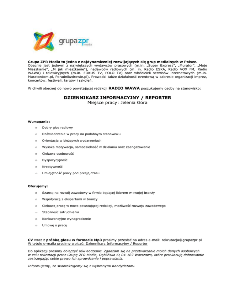 Grupa ZPR Media to jedna z najdynamiczniej rozwijających się grup medialnych w Polsce. Obecnie jest jednym z największych wydawców prasowych (m.in. „Super Express”, „Murator”, „Moje Mieszkanie”, „M jak mieszkanie”), nadawców radiowych (m. in. Radio ESKA, Radio VOX FM, Radio WAWA) i telewizyjnych (m.in. FOKUS TV, POLO TV) oraz właścicieli serwisów internetowych (m.in. Muratordom.pl, Poradnikzdrowie.pl). Prowadzi także działalność eventową w zakresie organizacji imprez, koncertów, festiwali, targów i szkoleń. W chwili obecnej do nowo powstającej redakcji RADIO WAWA poszukujemy osoby na stanowisko: DZIENNIKARZ INFORMACYJNY / REPORTER Miejsce pracy: Jelenia Góra Wymagania: • Dobry głos radiowy • Doświadczenie w pracy na podobnym stanowisku • Orientacja w bieżących wydarzeniach • Wysoka motywacja, samodzielność w działaniu oraz zaangażowanie • Ciekawa osobowość • Dyspozycyjność • Kreatywność • Umiejętność pracy pod presją czasu Oferujemy: • Szansę na rozwój zawodowy w firmie będącej liderem w swojej branży • Współpracę z ekspertami w branży • Ciekawą pracę w nowo powstającej redakcji, możliwość rozwoju zawodowego • Stabilność zatrudnienia • Konkurencyjne wynagrodzenie • Umowę o pracę CV wraz z próbką głosu w formacie Mp3 prosimy przesłać na adres e-mail: [email protected] W tytule e-maila prosimy wpisać: Dziennikarz Informacyjny / Reporter Do aplikacji prosimy dołączyć oświadczenie: Zgadzam się na przetwarzanie moich danych osobowych w celu rekrutacji przez Grupę ZPR Media, Dęblińska 6; 04-187 Warszawa, które przekazuję dobrowolnie zastrzegając sobie prawo ich sprawdzania i poprawiania. Informujemy, że skontaktujemy się z wybranymi Kandydatami.