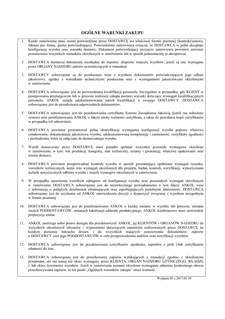 OGÓLNE WARUNKI ZAKUPU 1. Każde zamówienie musi zostać potwierdzone przez DOSTAWCĘ we właściwej formie pisemnej (kontrakt/umowa, faktura pro forma, pismo potwierdzające). Potwierdzenie zamówienia oznacza, że DOSTAWCA w pełni akceptuje konfigurację wyrobu oraz warunki dostawy. Dokument potwierdzający przyjęcie zamówienia powinien zawierać przeniesienie wszystkich warunków określonych w zamówieniu lub w sposób jednoznaczny je akceptować. 2. DOSTAWCA dostarcza dokumenty niezbędne do importu/ eksportu/ tranzytu wyrobów, jeżeli są one wymagane przez ORGANY NADZORU państw uczestniczących w transakcji. 3. DOSTAWCY zobowiązani są do przekazania wraz z wyrobem dokumentów poświadczających jego odbiór jakościowy, zgodny z warunkami technicznymi producenta oraz z wymaganiami jakościowymi określonymi w zamówieniu. 4. DOSTAWCA zobowiązany jest do potwierdzenia kwalifikacji personelu. Szczególnie w przypadku, gdy KLIENT w postępowaniu przetargowym lub w procesie realizacji zakupu postawi warunki dotyczące wymagań kwalifikacyjnych personelu, ANKOL zażąda udokumentowania takich kwalifikacji u swojego DOSTAWCY. DOSTAWCA zobowiązany jest do przedłożenia odpowiednich dokumentów. 5. DOSTAWCA zobowiązany jest do przedstawienia certyfikatu Sytemu Zarządzania Jakością (jeżeli ma wdrożony system) oraz poinformowania ANKOL o fakcie utraty ważności certyfikatu, a także do przesłania kopii certyfikatów w przypadku ich odnowienia. 6. DOSTAWCA powinien gwarantować pełną identyfikację wymaganej konfiguracji wyrobu poprzez właściwe oznakowanie, dokumentację jakościową wyrobu, udokumentowaną kompletację i zamienność, certyfikaty zgodności i pochodzenia, które są załączane do dostarczanego wyrobu. 7. Wyrób dostarczony przez DOSTAWCĘ musi ponadto spełniać wszystkie pozostałe wymagania określone w zamówieniu, w tym: rok produkcji, kategorię, stan techniczny, resursy i gwarancję, właściwe opakowanie oraz termin dostawy. 8. DOSTAWCA powinien przeprowadzać kontrolę wyrobu w sposób gwarantujący spełnienie wymagań rysunku, warunków technicznych, norm oraz wymagań określonych dla projektu, badań, kontroli, weryfikacji, wykorzystania technik statystycznych odbioru wyrobu i innych wymogów określonych w zamówieniu. 9. W przypadku ujawnienia wszelkich odstępstw od konfiguracji wyrobu oraz pozostałych wymagań określonych w zamówieniu DOSTAWCA zobowiązany jest do niezwłocznego powiadomienia o tym fakcie ANKOL wraz z informacją o podjętych działaniach eliminujących oraz zapobiegających podobnym zdarzeniom. DOSTAWCA zobowiązany jest do uzyskania od ANKOL zatwierdzenia decyzji o dyspozycji związanej z wyrobem niezgodnym w formie pisemnej. 10. DOSTAWCA zobowiązany jest do poinformowania ANKOL o każdej zmianie w wyrobie lub procesie, zmianie swoich PODDOSTAWCÓW, zmianach lokalizacji oddziału produkcyjnego. ANKOL każdorazowo musi zatwierdzić propozycję zmian. 11. ANKOL zastrzega sobie prawo dostępu dla przedstawicieli ANKOL, jej KLIENTÓW i ORGANÓW NADZORU do wszystkich określonych obszarów i wyposażenia dotyczących zamówień realizowanych przez DOSTAWCĘ na każdym poziomie łańcucha dostaw i do wszystkich mających zastosowanie dokumentów, zapisów u DOSTAWCY oraz jego PODDOSTAWCÓW w celu przeprowadzenia auditów oraz weryfikacji wyrobów. 12. DOSTAWCA zobowiązany jest do przedstawienia certyfikatów zgodności, raportów z prób i/lub certyfikatów zdatności do lotu. 13. DOSTAWCA zobowiązany jest do przechowania zapisów wynikających z transakcji zgodnie z określonymi przepisami, ale nie mniej niż okres wymagany przez KLIENTA, ORGAN NADZORU LOTNICZEGO, WŁADZĘ i/ lub okres żywotności wyrobów. Jeżeli w zamówieniu zostanie określone wymaganie odnośnie konkretnego okresu przechowywania zapisów, to ten punkt „Ogólnych warunków zakupu” straci ważność. Wydanie 05 z 2017.01.10