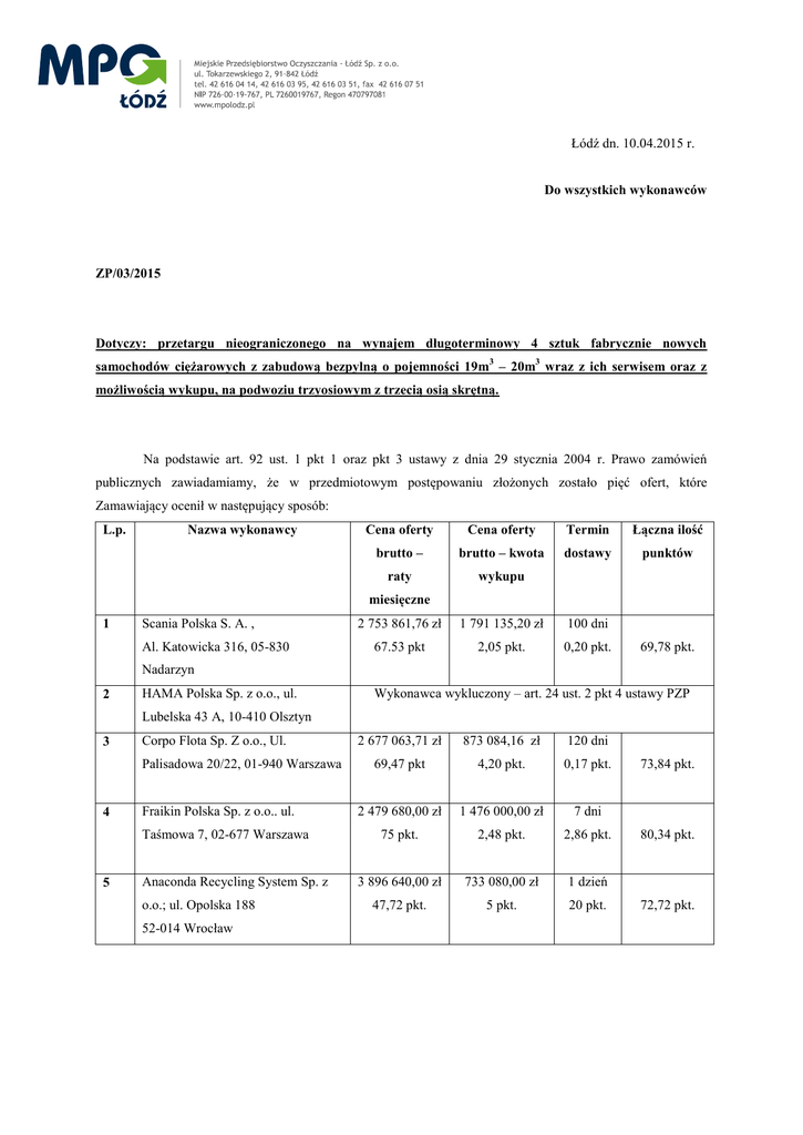 Łódź dn. 10.04.2015 r. Do wszystkich wykonawców ZP/03/2015 Dotyczy: przetargu nieograniczonego na wynajem długoterminowy 4 sztuk fabrycznie nowych samochodów ciężarowych z zabudową bezpylną o pojemności 19m3 – 20m3 wraz z ich serwisem oraz z możliwością wykupu, na podwoziu trzyosiowym z trzecią osią skrętną. Na podstawie art. 92 ust. 1 pkt 1 oraz pkt 3 ustawy z dnia 29 stycznia 2004 r. Prawo zamówień publicznych zawiadamiamy, że w przedmiotowym postępowaniu złożonych zostało pięć ofert, które Zamawiający ocenił w następujący sposób: L.p. Nazwa wykonawcy Cena oferty Cena oferty Termin Łączna ilość brutto – brutto – kwota dostawy punktów raty wykupu miesięczne 1 Scania Polska S. A. , Al. Katowicka 316, 05-830 2 753 861,76 zł 1 791 135,20 zł 100 dni 67.53 pkt 2,05 pkt. 0,20 pkt. 69,78 pkt. Nadarzyn 2 HAMA Polska Sp. z o.o., ul. Wykonawca wykluczony – art. 24 ust. 2 pkt 4 ustawy PZP Lubelska 43 A, 10-410 Olsztyn 3 Corpo Flota Sp. Z o.o., Ul. Palisadowa 20/22, 01-940 Warszawa 4 Fraikin Polska Sp. z o.o.. ul. Taśmowa 7, 02-677 Warszawa 5 Anaconda Recycling System Sp. z o.o.; ul. Opolska 188 52-014 Wrocław 2 677 063,71 zł 873 084,16 zł 120 dni 69,47 pkt 4,20 pkt. 0,17 pkt. 2 479 680,00 zł 1 476 000,00 zł 7 dni 75 pkt. 2,48 pkt. 2,86 pkt. 3 896 640,00 zł 733 080,00 zł 1 dzień 47,72 pkt. 5 pkt. 20 pkt. 73,84 pkt. 80,34 pkt. 72,72 pkt. Za najkorzystniejszą z punktu widzenia kryterium oceny ofert uznana została oferta firmy: Fraikin Polska Sp. z o.o. ul. Taśmowa 7 02-677 Warszawa Informujemy, że Zamawiający podpisanie umowy zaplanował po dniu 20.04.2015 r.