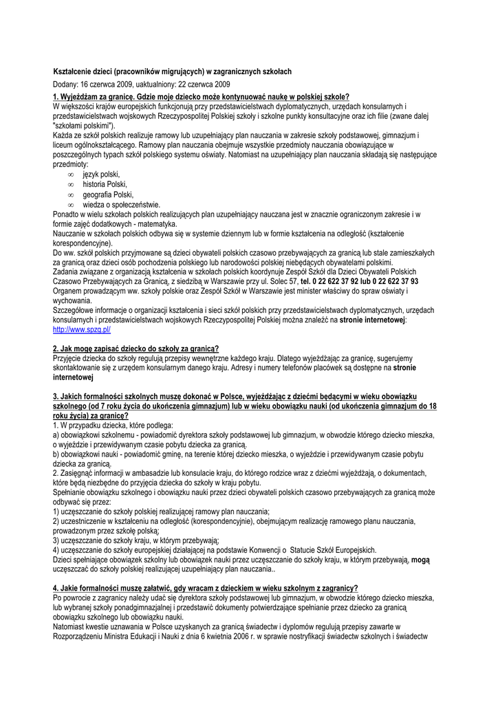 Kształcenie dzieci (pracowników migrujących) w zagranicznych szkołach Dodany: 16 czerwca 2009, uaktualniony: 22 czerwca 2009 1. WyjeŜdŜam za granicę. Gdzie moje dziecko moŜe kontynuować naukę w polskiej szkole? W większości krajów europejskich funkcjonują przy przedstawicielstwach dyplomatycznych, urzędach konsularnych i przedstawicielstwach wojskowych Rzeczypospolitej Polskiej szkoły i szkolne punkty konsultacyjne oraz ich filie (zwane dalej "szkołami polskimi"). KaŜda ze szkół polskich realizuje ramowy lub uzupełniający plan nauczania w zakresie szkoły podstawowej, gimnazjum i liceum ogólnokształcącego. Ramowy plan nauczania obejmuje wszystkie przedmioty nauczania obowiązujące w poszczególnych typach szkół polskiego systemu oświaty. Natomiast na uzupełniający plan nauczania składają się następujące przedmioty: • język polski, • historia Polski, • geografia Polski, • wiedza o społeczeństwie. Ponadto w wielu szkołach polskich realizujących plan uzupełniający nauczana jest w znacznie ograniczonym zakresie i w formie zajęć dodatkowych - matematyka. Nauczanie w szkołach polskich odbywa się w systemie dziennym lub w formie kształcenia na odległość (kształcenie korespondencyjne). Do ww. szkół polskich przyjmowane są dzieci obywateli polskich czasowo przebywających za granicą lub stale zamieszkałych za granicą oraz dzieci osób pochodzenia polskiego lub narodowości polskiej niebędących obywatelami polskimi. Zadania związane z organizacją kształcenia w szkołach polskich koordynuje Zespół Szkół dla Dzieci Obywateli Polskich Czasowo Przebywających za Granicą, z siedzibą w Warszawie przy ul. Solec 57, tel. 0 22 622 37 92 lub 0 22 622 37 93 Organem prowadzącym ww. szkoły polskie oraz Zespół Szkół w Warszawie jest minister właściwy do spraw oświaty i wychowania. Szczegółowe informacje o organizacji kształcenia i sieci szkół polskich przy przedstawicielstwach dyplomatycznych, urzędach konsularnych i przedstawicielstwach wojskowych Rzeczypospolitej Polskiej moŜna znaleźć na stronie internetowej: http://www.spzg.pl/ 2. Jak mogę zapisać dziecko do szkoły za granicą? Przyjęcie dziecka do szkoły regulują przepisy wewnętrzne kaŜdego kraju. Dlatego wyjeŜdŜając za granicę, sugerujemy skontaktowanie się z urzędem konsularnym danego kraju. Adresy i numery telefonów placówek są dostępne na stronie internetowej 3. Jakich formalności szkolnych muszę dokonać w Polsce, wyjeŜdŜając z dziećmi będącymi w wieku obowiązku szkolnego (od 7 roku Ŝycia do ukończenia gimnazjum) lub w wieku obowiązku nauki (od ukończenia gimnazjum do 18 roku Ŝycia) za granicę? 1. W przypadku dziecka, które podlega: a) obowiązkowi szkolnemu - powiadomić dyrektora szkoły podstawowej lub gimnazjum, w obwodzie którego dziecko mieszka, o wyjeździe i przewidywanym czasie pobytu dziecka za granicą. b) obowiązkowi nauki - powiadomić gminę, na terenie której dziecko mieszka, o wyjeździe i przewidywanym czasie pobytu dziecka za granicą. 2. Zasięgnąć informacji w ambasadzie lub konsulacie kraju, do którego rodzice wraz z dziećmi wyjeŜdŜają, o dokumentach, które będą niezbędne do przyjęcia dziecka do szkoły w kraju pobytu. Spełnianie obowiązku szkolnego i obowiązku nauki przez dzieci obywateli polskich czasowo przebywających za granicą moŜe odbywać się przez: 1) uczęszczanie do szkoły polskiej realizującej ramowy plan nauczania; 2) uczestniczenie w kształceniu na odległość (korespondencyjnie), obejmującym realizację ramowego planu nauczania, prowadzonym przez szkołę polską; 3) uczęszczanie do szkoły kraju, w którym przebywają; 4) uczęszczanie do szkoły europejskiej działającej na podstawie Konwencji o Statucie Szkół Europejskich. Dzieci spełniające obowiązek szkolny lub obowiązek nauki przez uczęszczanie do szkoły kraju, w którym przebywają, mogą uczęszczać do szkoły polskiej realizującej uzupełniający plan nauczania.. 4. Jakie formalności muszę załatwić, gdy wracam z dzieckiem w wieku szkolnym z zagranicy? Po powrocie z zagranicy naleŜy udać się dyrektora szkoły podstawowej lub gimnazjum, w obwodzie którego dziecko mieszka, lub wybranej szkoły ponadgimnazjalnej i przedstawić dokumenty potwierdzające spełnianie przez dziecko za granicą obowiązku szkolnego lub obowiązku nauki. Natomiast kwestie uznawania w Polsce uzyskanych za granicą świadectw i dyplomów regulują przepisy zawarte w Rozporządzeniu Ministra Edukacji i Nauki z dnia 6 kwietnia 2006 r. w sprawie nostryfikacji świadectw szkolnych i świadectw maturalnych uzyskanych za granicą, które określa warunki i tryb nostryfikacji świadectw szkolnych i świadectw maturalnych uzyskanych za granicą oraz rodzaje świadectw szkolnych i świadectw maturalnych uzyskanych za granicą, które uznaje się za równorzędne ze świadectwami określonymi w ustawie z dnia 7 września 1991 r. o systemie oświaty, bez obowiązku przeprowadzania nostryfikacji. Termin „świadectwo uzyskane za granicą” oznacza kaŜdy dokument wydany przez uprawnioną instytucję, potwierdzający ukończenie szkoły lub ukończenie kolejnego etapu edukacji za granicą. Za równorzędne świadectwu ukończenia polskiej publicznej szkoły podstawowej uznaje się świadectwo uzyskane za granicą, jeŜeli przewidziany planem nauczania okres nauki w szkołach za granicą niezbędny do uzyskania tego świadectwa wynosi łącznie co najmniej 6 lat i na pierwszy rok nauki przyjmuje się kandydatów nie wcześniej niŜ w 6. roku Ŝycia. Za równorzędne świadectwu ukończenia polskiego publicznego gimnazjum uznaje się świadectwo uzyskane za granicą, jeŜeli przewidziany planem nauczania okres nauki w szkołach za granicą niezbędny do uzyskania tego świadectwa wynosi łącznie co najmniej 9 lat i na pierwszy rok nauki przyjmuje się kandydatów nie wcześniej niŜ w 6. roku Ŝycia. Za równorzędne świadec