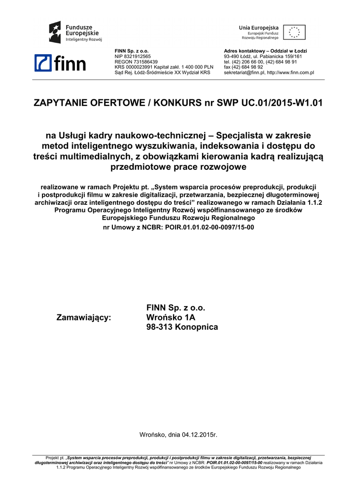 FINN Sp. z o.o. NIP 8321912565 REGON 731586439 KRS 0000023991 Kapitał zakł. 1 400 000 PLN Sąd Rej. Łódź-Śródmieście XX Wydział KRS Adres kontaktowy – Oddział w Łodzi 93-490 Łódź, ul. Pabianicka 159/161 tel. (42) 206 66 00, (42) 684 98 91 fax (42) 684 98 92 [email protected], http://www.finn.com.pl ZAPYTANIE OFERTOWE / KONKURS nr SWP UC.01/2015-W1.01 na Usługi kadry naukowo-technicznej – Specjalista w zakresie metod inteligentnego wyszukiwania, indeksowania i dostępu do treści multimedialnych, z obowiązkami kierowania kadrą realizującą przedmiotowe prace rozwojowe realizowane w ramach Projektu pt. „System wsparcia procesów preprodukcji, produkcji i postprodukcji filmu w zakresie digitalizacji, przetwarzania, bezpiecznej długoterminowej archiwizacji oraz inteligentnego dostępu do treści” realizowanego w ramach Działania 1.1.2 Programu Operacyjnego Inteligentny Rozwój współfinansowanego ze środków Europejskiego Funduszu Rozwoju Regionalnego nr Umowy z NCBR: POIR.01.01.02-00-0097/15-00 Zamawiający: FINN Sp. z o.o. Wrońsko 1A 98-313 Konopnica Wrońsko, dnia 04.12.2015r. Projekt pt. „System wsparcia procesów preprodukcji, produkcji i postprodukcji filmu w zakresie digitalizacji, przetwarzania, bezpiecznej długoterminowej archiwizacji oraz inteligentnego dostępu do treści” nr Umowy z NCBR: POIR.01.01.02-00-0097/15-00 realizowany w ramach Działania 1.1.2 Programu Operacyjnego Inteligentny Rozwój współfinansowanego ze środków Europejskiego Funduszu Rozwoju Regionalnego Usługi kadry naukowo-technicznej – Specjalista w zakresie metod inteligentnego wyszukiwania, indeksowania i dostępu do treści multimedialnych, z obowiązkami kierowania kadrą realizującą przedmiotowe prace rozwojowe - Zapytanie ofertowe SWP UC.01/2015-W1.01 Spis treści 1. Nazwa oraz adres Zamawiającego................................................................................................................... 3 2. Określenie trybu udzielenia zamówienia oraz sposobu przeprowadzenia postępowania..................................3 3. Opis przedmiotu zamówienia............................................................................................................................ 3 4. Dane dotyczące projektu pn. „System wsparcia procesów preprodukcji, produkcji i postprodukcji filmu w zakresie digitalizacji, przetwarzania, bezpiecznej długoterminowej archiwizacji oraz inteligentnego dostępu do treści”.................................................................................................................................................................... 4 5. Informacja o przewidywanych zamówieniach uzupełniających oraz okoliczności, po których zaistnieniu będą one udzielane........................................................................................................................................................ 5 6. Informacja o możliwości złożenia oferty wariantowej......................................................................................... 5 7. Termin wykonania zamówienia......................................................................................................................... 5 8. Warunki udziału w postępowaniu oraz opis sposobu dokonywania oceny spełniania tych warunków...............5 9. Wykaz oświadczeń i dokumentów, jakie mają dostarczyć Oferenci w celu potwierdzenia spełnienia warunków udziału w postępowaniu oraz w celu wykazania braku podstaw do wykluczenia z postępowania.........................7 10. Opis sposobu przygotowywania oferty............................................................................................................ 7 11. Miejsce oraz termin składania i otwarcia ofert................................................................................................. 8 12. Opis kryteriów, którymi Zamawiający będzie się kierował przy wyborze oferty wraz z podaniem znaczenia tych kryteriów oraz sposobu oceny ofert............................................................................................................... 8 13. Pozostałe informacje....................................................................................................................................... 8 14. Załączniki........................................................................................................................................................ 9 Projekt pt. „System wsparcia procesów preprodukcji, produkcji i postprodukcji filmu w zakresie digitalizacji, przetwarzania, bezpiecznej długoterminowej archiwizacji oraz inteligentnego dostępu do treści” nr Umowy z NCBR: POIR.01.01.02-00-0097/15-00 realizowany w ramach Działania 1.1.2 Programu Operacyjnego Inteligentny Rozwój współfinansowanego ze środków Europejskiego Funduszu Rozwoju Regionalnego str. 2 Usługi kadry naukowo-technicznej – Specjalista w zakresie metod inteligentnego wyszukiwania, indeksowania i dostępu do treści multimedialnych, z obowiązkami kierowania kadrą realizującą przedmiotowe prace rozwojowe - Zapytanie ofertowe SWP UC.01/2015-W1.01 Niniejsze postępowanie jest prowadzone w oparciu o „Regulamin udzielania zamówień przez FINN Sp. z o.o. na dostawy, usługi i roboty budowlane współfinansowanych ze środków zewnętrznych (publicznych)”, którego treść zamieszczona jest na stronie www.finn.com.pl oraz jest do wglądu w siedzibie FINN Sp. z o.o. 1. Nazwa oraz adres Zamawiającego FINN Sp. z o.o. ( Wrońsko 1A 98-313 Konopnica NIP 8321912565, REGON 731586439 KRS 0000023991 Tel. +48 42 206 66 01, Fax +48 42 684 98 92 E-mail [email protected], www.finn.com.pl Strona internetowa Projektu „System wsparcia procesów preprodukcji, produkcji i postprodukcji filmu w zakresie digitalizacji, przetwarzania, bezpiecznej długoterminowej archiwizacji oraz inteligentnego dostępu do treści” http://www.badania.finn.pl/pl/cms/swp/ 2. Określenie try