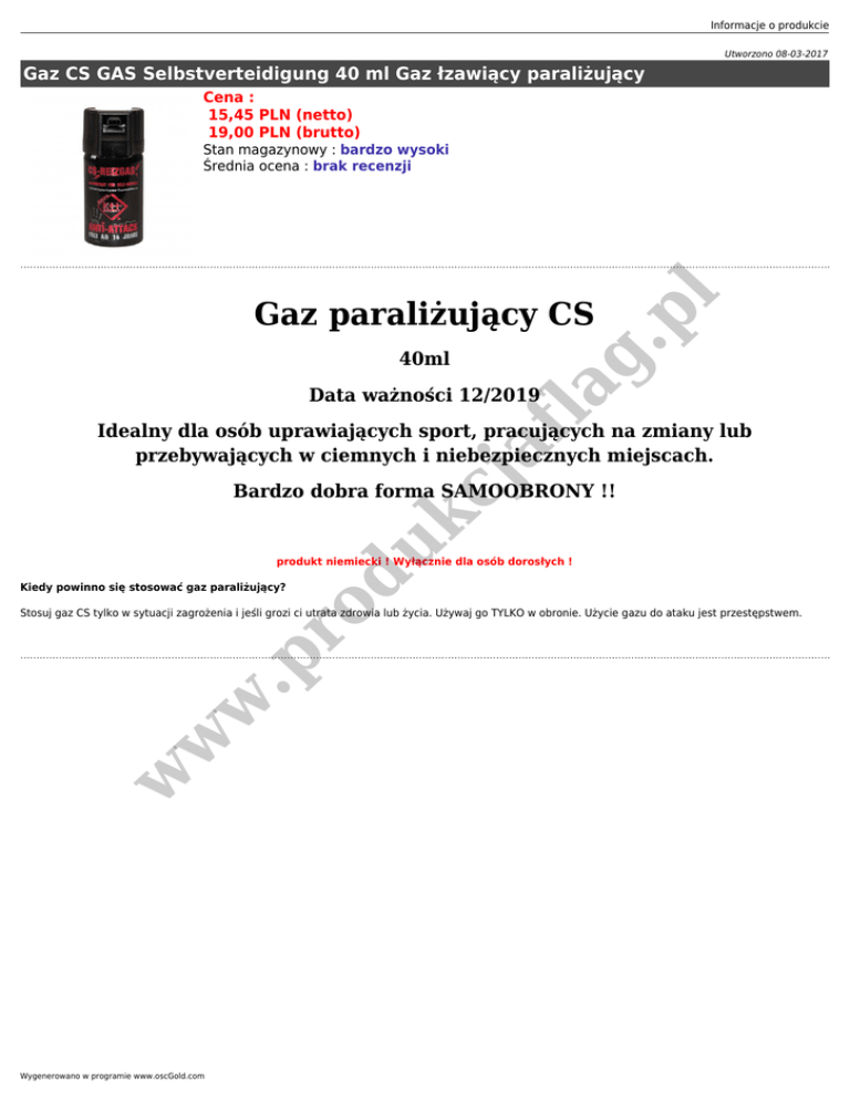 Informacje o produkcie Utworzono 08-03-2017 Gaz CS GAS Selbstverteidigung 40 ml Gaz łzawiący paraliżujący Cena : 15,45 PLN (netto) 19,00 PLN (brutto) .p l Stan magazynowy : bardzo wysoki Średnia ocena : brak recenzji 40ml af la g Gaz paraliżujący CS Data ważności 12/2019 kc j Idealny dla osób uprawiających sport, pracujących na zmiany lub przebywających w ciemnych i niebezpiecznych miejscach. du Bardzo dobra forma SAMOOBRONY !! produkt niemiecki ! Wyłącznie dla osób dorosłych ! ro Kiedy powinno się stosować gaz paraliżujący? w w w .p Stosuj gaz CS tylko w sytuacji zagrożenia i jeśli grozi ci utrata zdrowia lub życia. Używaj go TYLKO w obronie. Użycie gazu do ataku jest przestępstwem. Wygenerowano w programie www.oscGold.com