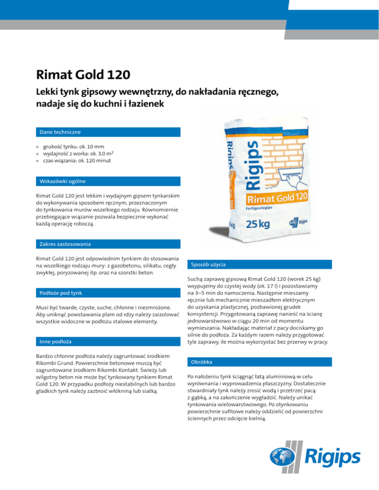 Rimat Gold 120 Lekki tynk gipsowy wewnętrzny, do nakładania ręcznego, nadaje się do kuchni i łazienek Dane techniczne • g rubość tynku: ok. 10 mm • wydajność z worka: ok. 3,0 m2 • czas wiązania: ok. 120 minut Wskazówki ogólne Rimat Gold 120 jest lekkim i wydajnym gipsem tynkarskim do wykonywania sposobem ręcznym, przeznaczonym do tynkowania murów wszelkiego rodzaju. Równomiernie przebiegające wiązanie pozwala bezpiecznie wykonać każdą operację roboczą. Zakres zastosowania Rimat Gold 120 jest odpowiednim tynkiem do stosowania na wszelkiego rodzaju mury: z gazobetonu, silikatu, cegły zwykłej, poryzowanej itp. oraz na szorstki beton. Podłoże pod tynk Musi być twarde, czyste, suche, chłonne i niezmrożone. Aby uniknąć powstawania plam od rdzy należy zaizolować wszystkie widoczne w podłożu stalowe elementy. Inne podłoża Bardzo chłonne podłoża należy zagruntować środkiem Rikombi Grund. Powierzchnie betonowe muszą być zagruntowane środkiem Rikombi Kontakt. Świeży lub wilgotny beton nie może być tynkowany tynkiem Rimat Gold 120. W przypadku podłoży niestabilnych lub bardzo gładkich tynk należy zazbroić włókniną lub siatką. Sposób użycia Suchą zaprawę gipsową Rimat Gold 120 (worek 25 kg) wsypujemy do czystej wody (ok. 17 l) i pozostawiamy na 3–5 min do namoczenia. Następnie mieszamy ręcznie lub mechanicznie mieszadłem elektrycznym do uzyskania plastycznej, pozbawionej grudek konsystencji. Przygotowaną zaprawę nanieść na ścianę jednowarstwowo w ciągu 20 min od momentu wymieszania. Nakładając materiał z pacy dociskamy go silnie do podłoża. Za każdym razem należy przygotować tyle zaprawy, ile można wykorzystać bez przerwy w pracy. Obróbka Po nałożeniu tynk ściągnąć łatą aluminiową w celu wyrównania i wyprowadzenia płaszczyzny. Dostatecznie stwardniały tynk należy zrosić wodą i przetrzeć pacą z gąbką, a na zakończenie wygładzić. Należy unikać tynkowania wielowarstwowego. Po otynkowaniu powierzchnie sufitowe należy oddzielić od powierzchni ściennych przez odcięcie kielnią. Wykończenie powierzchni Prawidłowo wykonany, suchy i czysty tynk Rimat Gold 120 może być, po uprzednim zagruntowaniu Rikombi Grund, malowany, tapetowany, pokrywany glazurą itp. Preparat gruntujący nie powinien tworzyć błony na powierzchni lecz musi całkowicie wsiąkać w podłoże. Uwaga Tynku mającego stanowić podłoże pod glazurę nie filcuje się i niewygładza, pozostawiając po wyrównaniu łatą twardą i szorstką strukturę. Czas na zużycie Od wsypywania i mieszania po ostatnie pociągnięcie wygładzające – ok. 120 minut. Wilgotność Aby tynk mógł być pokryty materiałami wykończeniowymi, jego wilgotność nie może przekraczać następujących wartości: • farby dyspersyjne < 3,0%, • farby/tapety bardziej szczelne < 1,5%, • farby zawierające lakiery i latex < 1,0%, • tapety paroszczelne, glazura < 1,0%. Wskazówki • n ie należy używać brudnej wody do mieszania zaprawy gipsowej, • nie należy używać brudnych i rdzewiejących narzędzi, • nie należy nakładać na świeże i nie wyschnięte podłoże, • nie należy intensywnie wentylować pomieszczeń w trakcie mieszania, nakładania i wysychania zaprawy (po wykonaniu prac tynkarskich – pomieszczenia muszą być wietrzone często ale krótko). Grubość warstwy tynku Produkt zgodny z • ś rednia grubość tynku – 10 mm • minimalna grubość tynku – 8 mm • minimalna grubość tynku na podłożach niestabilnych przy zbrojeniu całej powierzchni – 15 mm • minimalna grubość tynku pod glazurę – 10 mm • przewody podtynkowe przykryć warstwą – min. 5 mm Parametry z zakresu fizyki budowli • p rzewodność cieplna – λR 0,25 W/mK • oporność dyfuzyjna – µ 10 Czas składowania EN 13279-1-B4/20/2 PZH HK/B/0543/16/2009 Bezpieczeństwo Produkt jest nietoksyczny w trakcie użycia i podczas eksploatacji, mimo to należy stosować odpowiednie środki ochronne. W przypadku dostania się mieszanki do oczu należy przemyć je czystą wodą. Produkt należy przechowywać w miejscu niedostępnym dla dzieci. 6 miesięcy od daty produkcji. Należy składować w warunkach suchych. Saint-Gobain Construction Products Polska Sp. z o.o. Biuro Rigips w Warszawie ul. Cybernetyki 21 02-677 Warszawa Tel. +48 22 457 14 57 lub 8 Fax +48 22 457 14 55 Biuro Informacji Technicznej Rigips 0 801 328 788 www.rigips.pl Dane zawarte w niniejszej ulotce stanowią wyłącznie opis produktu. Są to ogólne wskazówki oparte na naszej wiedzy i doświadczeniach i nie odnoszą się do konkretnych zastosowań. Stale ulepszając i rozwijając oferowane przez naszą firmę produkty, zastrzegamy sobie prawo do zmiany parametrów bez uprzedniego informowania. Prezentowane dane nie mogą stanowić podstawy do jakichkolwiek roszczeń. W razie potrzeby prosimy zwrócić się do Działu Technicznego Rigips. listopad 2009 produkt: Rimat Gold 120 str. 2/2
