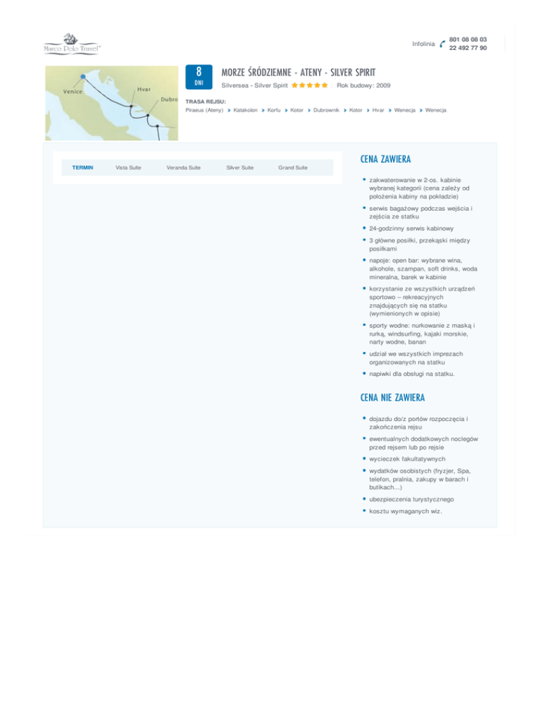 Infolinia 8 MORZE ŚRÓDZIEMNE - ATENY - SILVER SPIRIT DNI Silversea - Silver Spirit 801 08 08 03 22 492 77 90 | Rok budowy: 2009 TRASA REJSU: Piraeus (Ateny) TERMIN Vista Suite Veranda Suite Katakolon Silver Suite Korfu Kotor Grand Suite Dubrownik Kotor Hvar Wenecja Wenecja CENA ZAWIERA zakwaterowanie w 2-os. kabinie wybranej kategorii (cena zależy od położenia kabiny na pokładzie) serwis bagażowy podczas wejścia i zejścia ze statku 24-godzinny serwis kabinowy 3 główne posiłki, przekąski między posiłkami napoje: open bar: wybrane wina, alkohole, szampan, soft drinks, woda mineralna, barek w kabinie korzystanie ze wszystkich urządzeń sportowo – rekreacyjnych znajdujących się na statku (wymienionych w opisie) sporty wodne: nurkowanie z maską i rurką, windsurfing, kajaki morskie, narty wodne, banan udział we wszystkich imprezach organizowanych na statku napiwki dla obsługi na statku. CENA NIE ZAWIERA dojazdu do/z portów rozpoczęcia i zakończenia rejsu ewentualnych dodatkowych noclegów przed rejsem lub po rejsie wycieczek fakultatywnych wydatków osobistych (fryzjer, Spa, telefon, pralnia, zakupy w barach i butikach...) ubezpieczenia turystycznego kosztu wymaganych wiz.