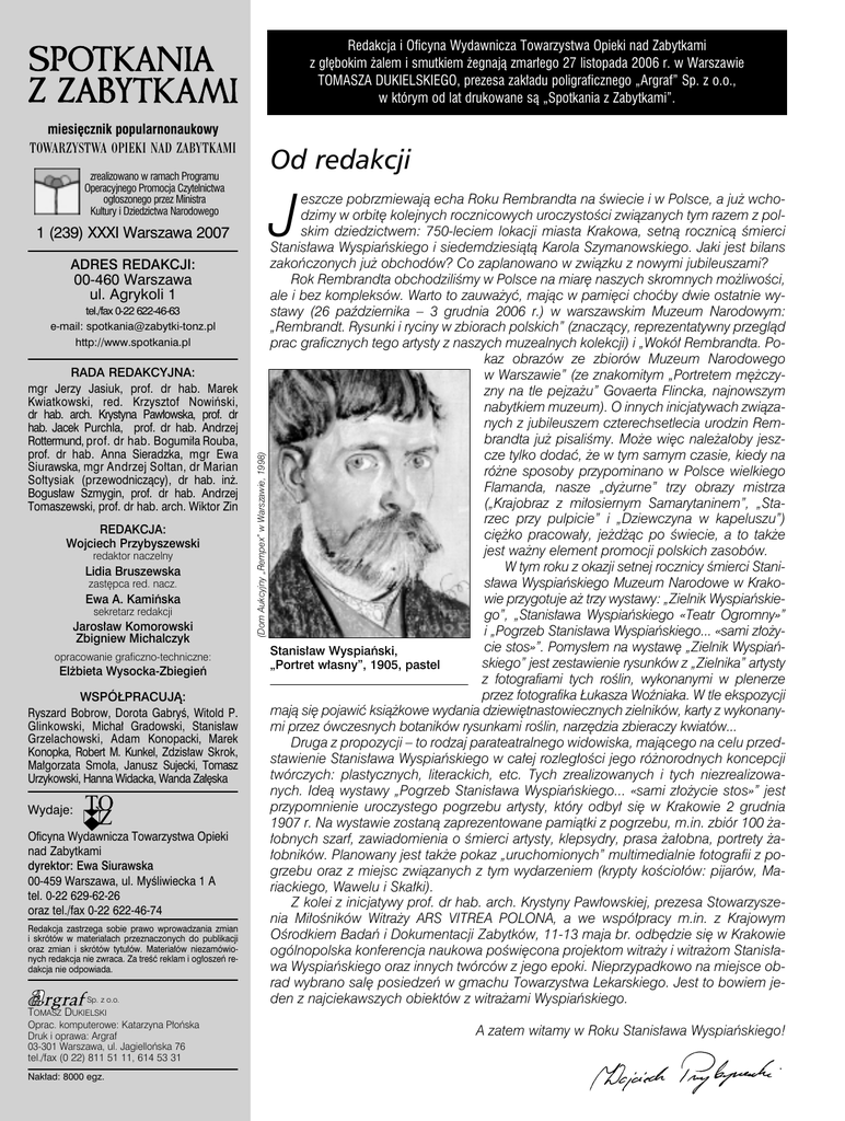 Redakcja i Oficyna Wydawnicza Towarzystwa Opieki nad Zabytkami z głębokim żalem i smutkiem żegnają zmarłego 27 listopada 2006 r. w Warszawie TOMASZA DUKIELSKIEGO, prezesa zakładu poligraficznego „Argraf” Sp. z o.o., w którym od lat drukowane są „Spotkania z Zabytkami”. miesięcznik popularnonaukowy TOWARZYSTWA OPIEKI NAD ZABYTKAMI Od redakcji zrealizowano w ramach Programu Operacyjnego Promocja Czytelnictwa ogłoszonego przez Ministra Kultury i Dziedzictwa Narodowego J 1 (239) XXXI Warszawa 2007 ADRES REDAKCJI: 00-460 Warszawa ul. Agrykoli 1 tel./fax 0-22 622-46-63 e-mail: [email protected] RADA REDAKCYJNA: mgr Jerzy Jasiuk, prof. dr hab. Marek Kwiatkowski, red. Krzysztof Nowiński, dr hab. arch. Krystyna Pawłowska, prof. dr hab. Jacek Purchla, prof. dr hab. Andrzej Rottermund, prof. dr hab. Bogumiła Rouba, prof. dr hab. Anna Sieradzka, mgr Ewa Siurawska, mgr Andrzej Sołtan, dr Marian Sołtysiak (przewodniczący), dr hab. inż. Bogusław Szmygin, prof. dr hab. Andrzej Tomaszewski, prof. dr hab. arch. Wiktor Zin REDAKCJA: Wojciech Przybyszewski redaktor naczelny Lidia Bruszewska zastępca red. nacz. Ewa A. Kamińska sekretarz redakcji Jarosław Komorowski Zbigniew Michalczyk opracowanie graficzno-techniczne: Elżbieta Wysocka-Zbiegień WSPÓŁPRACUJĄ: Ryszard Bobrow, Dorota Gabryś, Witold P. Glinkowski, Michał Gradowski, Stanisław Grzelachowski, Adam Konopacki, Marek Konopka, Robert M. Kunkel, Zdzisław Skrok, Małgorzata Smoła, Janusz Sujecki, Tomasz Urzykowski, Hanna Widacka, Wanda Załęska Wydaje: Oficyna Wydawnicza Towarzystwa Opieki nad Zabytkami dyrektor: Ewa Siurawska 00-459 Warszawa, ul. Myśliwiecka 1 A tel. 0-22 629-62-26 oraz tel./fax 0-22 622-46-74 Redakcja zastrzega sobie prawo wprowadzania zmian i skrótów w materiałach przeznaczonych do publikacji oraz zmian i skrótów tytułów. Materiałów niezamówionych redakcja nie zwraca. Za treść reklam i ogłoszeń redakcja nie odpowiada. Sp. z o.o. (Dom Aukcyjny „Rempex” w Warszawie, 1998) http://www.spotkania.pl eszcze pobrzmiewają echa Roku Rembrandta na świecie i w Polsce, a już wchodzimy w orbitę kolejnych rocznicowych uroczystości związanych tym razem z polskim dziedzictwem: 750-leciem lokacji miasta Krakowa, setną rocznicą śmierci Stanisława Wyspiańskiego i siedemdziesiątą Karola Szymanowskiego. Jaki jest bilans zakończonych już obchodów? Co zaplanowano w związku z nowymi jubileuszami? Rok Rembrandta obchodziliśmy w Polsce na miarę naszych skromnych możliwości, ale i bez kompleksów. Warto to zauważyć, mając w pamięci choćby dwie ostatnie wystawy (26 października – 3 grudnia 2006 r.) w warszawskim Muzeum Narodowym: „Rembrandt. Rysunki i ryciny w zbiorach polskich” (znaczący, reprezentatywny przegląd prac graficznych tego artysty z naszych muzealnych kolekcji) i „Wokół Rembrandta. Pokaz obrazów ze zbiorów Muzeum Narodowego w Warszawie” (ze znakomitym „Portretem mężczyzny na tle pejzażu” Govaerta Flincka, najnowszym nabytkiem muzeum). O innych inicjatywach związanych z jubileuszem czterechsetlecia urodzin Rembrandta już pisaliśmy. Może więc należałoby jeszcze tylko dodać, że w tym samym czasie, kiedy na różne sposoby przypominano w Polsce wielkiego Flamanda, nasze „dyżurne” trzy obrazy mistrza („Krajobraz z miłosiernym Samarytaninem”, „Starzec przy pulpicie” i „Dziewczyna w kapeluszu”) ciężko pracowały, jeżdżąc po świecie, a to także jest ważny element promocji polskich zasobów. W tym roku z okazji setnej rocznicy śmierci Stanisława Wyspiańskiego Muzeum Narodowe w Krakowie przygotuje aż trzy wystawy: „Zielnik Wyspiańskiego”, „Stanisława Wyspiańskiego «Teatr Ogromny»” i „Pogrzeb Stanisława Wyspiańskiego... «sami złożycie stos»”. Pomysłem na wystawę „Zielnik WyspiańStanisław Wyspiański, skiego” jest zestawienie rysunków z „Zielnika” artysty „Portret własny”, 1905, pastel z fotografiami tych roślin, wykonanymi w plenerze przez fotografika Łukasza Woźniaka. W tle ekspozycji mają się pojawić książkowe wydania dziewiętnastowiecznych zielników, karty z wykonanymi przez ówczesnych botaników rysunkami roślin, narzędzia zbieraczy kwiatów... Druga z propozycji – to rodzaj parateatralnego widowiska, mającego na celu przedstawienie Stanisława Wyspiańskiego w całej rozległości jego różnorodnych koncepcji twórczych: plastycznych, literackich, etc. Tych zrealizowanych i tych niezrealizowanych. Ideą wystawy „Pogrzeb Stanisława Wyspiańskiego... «sami złożycie stos»” jest przypomnienie uroczystego pogrzebu artysty, który odbył się w Krakowie 2 grudnia 1907 r. Na wystawie zostaną zaprezentowane pamiątki z pogrzebu, m.in. zbiór 100 żałobnych szarf, zawiadomienia o śmierci artysty, klepsydry, prasa żałobna, portrety żałobników. Planowany jest także pokaz „uruchomionych” multimedialnie fotografii z pogrzebu oraz z miejsc związanych z tym wydarzeniem (krypty kościołów: pijarów, Mariackiego, Wawelu i Skałki). Z kolei z inicjatywy prof. dr hab. arch. Krystyny Pawłowskiej, prezesa Stowarzyszenia Miłośników Witraży ARS VITREA POLONA, a we współpracy m.in. z Krajowym Ośrodkiem Badań i Dokumentacji Zabytków, 11-13 maja br. odbędzie się w Krakowie ogólnopolska konferencja naukowa poświęcona projektom witraży i witrażom Stanisława Wyspiańskiego oraz innych twórców z jego epoki. Nieprzypadkowo na miejsce obrad wybrano salę posiedzeń w gmachu Towarzystwa Lekarskiego. Jest to bowiem jeden z najciekawszych obiektów z witrażami Wyspiańskiego. TOMASZ DUKIELSKI Oprac. komputerowe: Katarzyna Płońska Druk i oprawa: Argraf 03-301 Warszawa, ul. Jagiellońska 76 tel./fax (0 22) 811 51 11, 614 53 31 Nakład: 8000 egz. A zatem witamy w Roku Stanisława Wyspiańskiego!