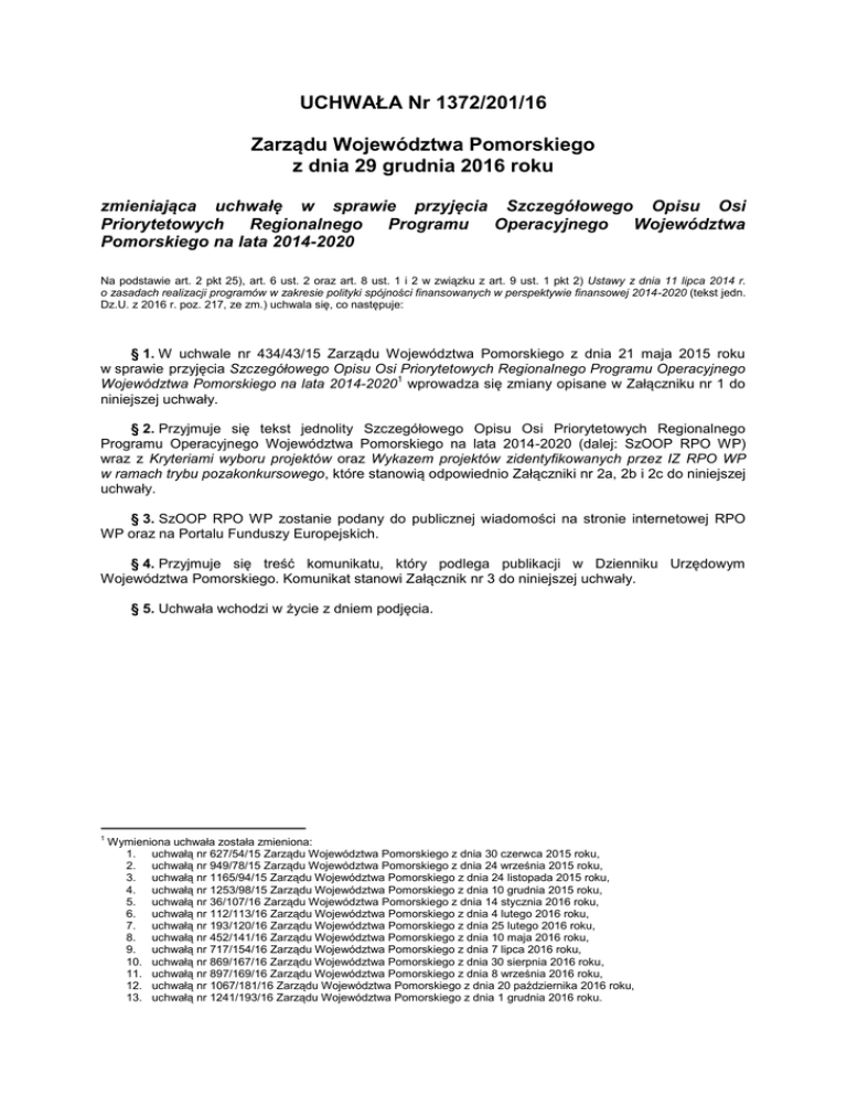 UCHWAŁA Nr 1372/201/16 Zarządu Województwa Pomorskiego z dnia 29 grudnia 2016 roku zmieniająca uchwałę w sprawie przyjęcia Szczegółowego Opisu Osi Priorytetowych Regionalnego Programu Operacyjnego Województwa Pomorskiego na lata 2014-2020 Na podstawie art. 2 pkt 25), art. 6 ust. 2 oraz art. 8 ust. 1 i 2 w związku z art. 9 ust. 1 pkt 2) Ustawy z dnia 11 lipca 2014 r. o zasadach realizacji programów w zakresie polityki spójności finansowanych w perspektywie finansowej 2014-2020 (tekst jedn. Dz.U. z 2016 r. poz. 217, ze zm.) uchwala się, co następuje: § 1. W uchwale nr 434/43/15 Zarządu Województwa Pomorskiego z dnia 21 maja 2015 roku w sprawie przyjęcia Szczegółowego Opisu Osi Priorytetowych Regionalnego Programu Operacyjnego 1 Województwa Pomorskiego na lata 2014-2020 wprowadza się zmiany opisane w Załączniku nr 1 do niniejszej uchwały. § 2. Przyjmuje się tekst jednolity Szczegółowego Opisu Osi Priorytetowych Regionalnego Programu Operacyjnego Województwa Pomorskiego na lata 2014-2020 (dalej: SzOOP RPO WP) wraz z Kryteriami wyboru projektów oraz Wykazem projektów zidentyfikowanych przez IZ RPO WP w ramach trybu pozakonkursowego, które stanowią odpowiednio Załączniki nr 2a, 2b i 2c do niniejszej uchwały. § 3. SzOOP RPO WP zostanie podany do publicznej wiadomości na stronie internetowej RPO WP oraz na Portalu Funduszy Europejskich. § 4. Przyjmuje się treść komunikatu, który podlega publikacji w Dzienniku Urzędowym Województwa Pomorskiego. Komunikat stanowi Załącznik nr 3 do niniejszej uchwały. § 5. Uchwała wchodzi w życie z dniem podjęcia. 1 Wymieniona uchwała została zmieniona: 1. uchwałą nr 627/54/15 Zarządu Województwa Pomorskiego z dnia 30 czerwca 2015 roku, 2. uchwałą nr 949/78/15 Zarządu Województwa Pomorskiego z dnia 24 września 2015 roku, 3. uchwałą nr 1165/94/15 Zarządu Województwa Pomorskiego z dnia 24 listopada 2015 roku, 4. uchwałą nr 1253/98/15 Zarządu Województwa Pomorskiego z dnia 10 grudnia 2015 roku, 5. uchwałą nr 36/107/16 Zarządu Województwa Pomorskiego z dnia 14 stycznia 2016 roku, 6. uchwałą nr 112/113/16 Zarządu Województwa Pomorskiego z dnia 4 lutego 2016 roku, 7. uchwałą nr 193/120/16 Zarządu Województwa Pomorskiego z dnia 25 lutego 2016 roku, 8. uchwałą nr 452/141/16 Zarządu Województwa Pomorskiego z dnia 10 maja 2016 roku, 9. uchwałą nr 717/154/16 Zarządu Województwa Pomorskiego z dnia 7 lipca 2016 roku, 10. uchwałą nr 869/167/16 Zarządu Województwa Pomorskiego z dnia 30 sierpnia 2016 roku, 11. uchwałą nr 897/169/16 Zarządu Województwa Pomorskiego z dnia 8 września 2016 roku, 12. uchwałą nr 1067/181/16 Zarządu Województwa Pomorskiego z dnia 20 października 2016 roku, 13. uchwałą nr 1241/193/16 Zarządu Województwa Pomorskiego z dnia 1 grudnia 2016 roku. UZASADNIENIE Zarząd Województwa Pomorskiego, jako Instytucja Zarządzająca Regionalnym Programem Operacyjnym Województwa Pomorskiego na lata 2014-2020 (dalej: RPO WP), jest odpowiedzialny za nabór, ocenę i wybór wniosków ubiegających się o dofinansowanie w ramach RPO WP. Z uwagi na ogólny charakter zapisów RPO WP konieczne jest przygotowanie dodatkowych dokumentów przedstawiających szczegółowe informacje służące realizacji Programu. Zgodnie z art. 6 ust. 2 Ustawy z dnia 11 lipca 2014 r. o zasadach realizacji programów w zakresie polityki spójności finansowanych w perspektywie finansowej 2014-2020 podstawę systemu realizacji programu operacyjnego stanowi między innymi szczegółowy opis osi priorytetowych programu operacyjnego. Szczegółowy Opis Osi Priorytetowych RPO WP (dalej: SzOOP RPO WP), z uwagi na poziom szczegółowości zawartych w nim informacji stanowi kompendium wiedzy, a jego podstawowym celem jest doprecyzowanie zapisów Programu oraz przekazanie potencjalnym wnioskodawcom informacji w szczególności na temat zakresu interwencji Działań lub Poddziałań realizowanych w ramach poszczególnych Osi Priorytetowych RPO WP. Dnia 21 maja 2015 roku Zarząd Województwa Pomorskiego uchwałą nr 434/43/15 przyjął pierwszą wersję SzOOP RPO WP. W celu zapewnienia sprawnej realizacji RPO WP oraz efektywnego wykorzystania alokacji dostępnej w ramach Programu okresowo pojawia się potrzeba wprowadzenia aktualizacji zapisów w SzOOP RPO WP. W związku z zatwierdzeniem przez Komitet Monitorujący RPO WP w dniu 28 grudnia 2016 roku zmiany Kryteriów wyboru projektów w zakresie wybranych Działań i Poddziałań RPO WP oraz zakończeniem procesu identyfikacji przez Instytucję Zarządzającą RPO WP kolejnych projektów w ramach trybu pozakonkursowego, zaistniała konieczność modyfikacji treści SzOOP RPO WP w powyższym zakresie. Ponadto z uwagi na obszerność dokumentu wydzielono do oddzielnego pliku, jako załącznik nr 2c, Wykaz projektów zidentyfikowanych przez IZ RPO WP w ramach trybu pozakonkursowego. Wprowadzone zmiany opisane zostały w formie rejestru stanowiącego Załącznik nr 1 do niniejszej uchwały. Tekst jednolity SzOOP RPO WP wraz z Kryteriami wyboru projektów oraz Wykazem projektów zidentyfikowanych przez IZ RPO WP w ramach trybu pozakonkursowego stanowią odpowiednio Załączniki nr 2a, 2b i 2c do niniejszej uchwały. SzOOP RPO WP zostanie podany do publicznej wiadomości na stronie internetowej RPO WP (http://rpo.pomorskie.eu) oraz na Portalu Funduszy Europejskich (http://www.funduszeeuropejskie.gov.pl). Komunikat o adresie strony internetowej oraz portalu, na których umieszczony został SzOOP RPO WP, a także o terminie, od którego niniejszy dokument obowiązuje – znajdujący się w Załączniku nr 3 do niniejszej uchwały – zostanie ogłoszony w Dzienniku Urzędowym Województwa Pomorskiego.