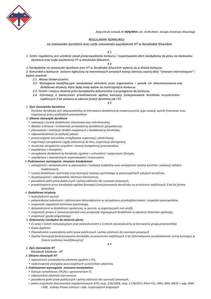 Załącznik do Uchwały Nr 39/B/2016 z dn. 15.09.2016 r. Zarządu Aeroklubu Gliwickiego REGULAMIN KONKURSU na stanowisko dyrektora oraz szefa stanowisko wyszkolenia HT w Aeroklubie Gliwickim § 1 1. Celem regulaminu jest ustalenie zasad przeprowadzenia konkursu i rozpatrywania ofert kandydatów do pracy na stanowisku dyrektora oraz szefa wyszkolenia HT w Aeroklubie Gliwickim. § 2 1. Kandydatów na stanowisko dyrektora o raz H T w Aeroklubie G liwickim wyłania się w drodze konkursu. 2. Komunikat o konkursie zostanie ogłoszony na internetowych serwisach branży lotniczej zwanej dalej “stronami internetowymi” i będzie zawierał: 2.1. Nazwę stowarzyszenia. 2.2. Wymagania kwalifikacyjne kandydatów określone przez organizatora i sposób ich dokumentowania oraz dodatkowe atrybuty, które będą miały wpływ na rozstrzygnięcie konkursu. 2.3. Termin i miejsce złożenia przez kandydatów dokumentów o przystąpieniu do konkursu. 2.4. Informację o konieczności przedstawienia ogólnej koncepcji funkcjonowania Aeroklubu na przestrzeni najbliższych 3 lat zarówno w zakresie funkcji dyrektora jak i HT. § 3 1. Opis stanowiska Dyrektora Dyrektor Aeroklubu jest odpowiedzialny za kierowanie działalnością stowarzyszenia, jego rozwój, wyniki finansowe oraz organizację pracy podległych pracowników 2. Główne obowiązki dyrektora • realizacja i rozwój działalności statutowej oraz członkowskiej, • dbałość o finanse i rentowność prowadzonej działalności gospodarczej, • planowanie i realizacja działań związanych z działalnością Aeroklubu, • odpowiedzialność za politykę jakości, • przestrzeganie warunków certyfikatów organizacji szkoleniowej, • organizacji zarządzania ciągłą zdatnością do lotu, organizacji obsługowej, • skuteczne zarządzenie zespołem i rozwój kompetencji pracowników, • współpraca z Zarządem, • zarządzanie działalnością Aeroklubu zgodnie z uchwałami i wytycznymi Zarządu, • współpraca z zewnętrznymi organizacjami i instytucjami, 3. Podstawowe wymagania stawiane kandydatom • umiejętność i doświadczenie w planowaniu i realizacji budżetów oraz umiejętność analizy kosztów i realizacji założeń budżetowych, • rozwój działalności sportowej oraz koncepcji rozwoju sportowego w poszczególnych sekcjach aeroklubu, • dyspozycyjność i odpowiednie zdolności kierownicze, • posiadanie pełni praw publicznych i pełnej zdolności do czynności prawnych, • przedstawienie przez kandydata ogólnej koncepcji funkcjonowania Aeroklubu na przestrzeni najbliższych 3 lat (w formie dowolnej). 4. Dodatkowe atrybuty • wykształcenie wyższe • potwierdzone sukcesami i referencjami doświadczenie w zarządzaniu przedsiębiorstwem i zespołem pracowników, • znajomość zagadnień lotnictwa sportowego, • doświadczenie w działalności społecznej, w sporcie, w organizacjach non-‐profit, • znajomość prawa o stowarzyszeniach oraz przepisów regulujących działalność w obszarze lotnictwa ogólnego, • znajomość języka angielskiego. 5. Dokumenty niezbędne do złożenia oferty • Cv wraz z listem motywacyjnym oraz oświadczeniem o 5 letnim doświadczeniu w kierowaniu grupą pracowników • Kopia dyplomu • Oświadczenie o posiadaniu pełni praw publicznych i pełnej zdolności do czynności prawnych • Ogólna koncepcja funkcjonowania Aeroklubu na przestrzeni najbliższych 3 lat (alternatywnie przedstawienie ustnej koncepcji w trakcie rozmowy kwalifikacyjnej) § 4 1. Opis stanowiska HT Kierownik Szkolenia -‐ HT 2. Główne obowiązki HT • zapewnienie prowadzenia szkolenia zgodnie z FCL, • nadzorowanie postępów poszczególnych uczestników szkolenia, 3. Podstawowe wymagania stawiane kandydatom • licencja samolotowa CPL(A) z uprawnieniem FI, • odpowiednie zdolności kierownicze • posiadanie pełni praw publicznych i pełnej zdolności do czynności prawnych, • pełna znajomość dokumentów regulaminowych ATO, rozp. 216/2008, rozp. 1178/2011 (Part-‐FCL, ORA, ARA, MED) + odp. AMC i GM, ustawy Prawo Lotnicze i odp. rozporządzeń krajowych 4. Dodatkowe atrybuty • 5 letnie doświadczenie w operacjach lotniczych, • licencja szybowcowa SPI z uprawnieniem FI; • prawo jazdy kategorii B • znajomość obsługi komputera • znajomość języka angielskiego. 5. Dokumenty niezbędne do złożenia oferty • Cv wraz z oświadczeniem o posiadaniu licencji samolotowej CPL(A) z uprawnieniem FI, oraz licencji szybowcowej SPI z uprawnieniem FI; • Oświadczenie o posiadaniu pełni praw publicznych i pełnej zdolności do czynności prawnych • Oświadczenie o pełnej znajomość dokumentów regulaminowych ATO, rozp. 216/2008, rozp. 1178/2011 (Part-‐FCL, ORA, ARA, MED) + odp. AMC i GM, ustawy Prawo Lotnicze i odp. rozporządzeń krajowych. § 5 Kalendarium konkursu: – 16.09.2016 r. – ogłoszenie konkursu, – 03.10.2016 r. – termin składania ofert, – 05.10.2016 r. – rozmowy kwalifikacyjne i rozstrzygnięcie konkursu, – 06.10.2016 r. – termin powołania na stanowisko dyrektora. § 6 1. Zarząd Aeroklubu zastrzega sobie możliwość podjęcia decyzji o połączeniu stanowiska dyrektora i HT w jedno stanowisko dyrektora z funkcją HT. W takiej sytuacji pierwszeństwo będą miały oferty złożone przez kandydatów spełniających łączne wymagania dla obydwóch stanowisk, do których załączone zostało oświadczenie o wyrażeniu zgody na połączenie obydwóch stanowisk i o spełnieniu wymagań dotyczących obydwóch stanowisk, będące załącznikiem Nr.1 do niniejszego regulaminu. 2. Zarząd Aeroklubu zastrzega sobie prawo do przedłużenia wszystkich terminów konkursu. § 7 Po złożeniu dokumentów kandydaci będą mogli zapoznać się z sytuacją organizacyjną, ekonomiczną i finansową Stowarzyszenia. § 8 1. Postępowanie konkursowe prowadzi komisja konkursowa złożona z członków Zarządu Aeroklubu. 2. Pracami komisji konkursowej kieruje Prezes Zarz