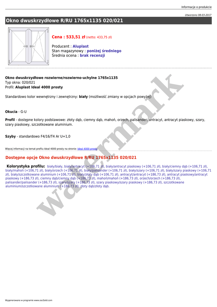 Informacje o produkcie Utworzono 08-03-2017 Okno dwuskrzydłowe R/RU 1765x1135 020/021 Cena : 533,51 zł (netto: 433,75 zł) Producent : Aluplast Stan magazynowy : poniżej średniego Średnia ocena : brak recenzji er m ar k Okno dwuskrzydłowe rozwierne/rozwierno-uchylne 1765x1135 Typ okna: 020/021 Profil: Aluplast Ideal 4000 prosty Standardowo kolor wewnętrzny i zewnętrzny: biały (możliwość zmiany w opcjach powyżej) Okucia - G-U Profil - dostępne kolory podstawowe: złoty dąb, ciemny dąb, mahoń, orzech, palisander, antracyt, antracyt piaskowy, szary, szary piaskowy, szczotkowane aluminium. Szyby - standardowo F4/16/T4 Ar U=1,0 Więcej informacji na temat profilu Ideal 4000 prosty na stronie: Ideal 4000 prosty Dostępne opcje Okno dwuskrzydłowe R/RU 1765x1135 020/021 w at Kolorystyka profilu: biały/biały, biały/antracyt (+106,71 zł), biały/antracyt piaskowy (+106,71 zł), biały/ciemny dąb (+106,71 zł), biały/mahoń (+106,71 zł), biały/orzech (+106,71 zł), biały/palisander (+106,71 zł), biały/szary (+106,71 zł), biały/szary piaskowy (+106,71 zł), biały/szczotkowane aluminium (+106,71 zł), biały/złoty dąb (+106,71 zł), antracyt/antracyt (+186,73 zł), antracyt piaskowy/antracyt piaskowy (+186,73 zł), ciemny dąb/ciemny dąb (+186,73 zł), mahoń/mahoń (+186,73 zł), orzech/orzech (+186,73 zł), palisander/palisander (+186,73 zł), szary/szary (+186,73 zł), szary piaskowy/szary piaskowy (+186,73 zł), szczotkowane aluminium/szczotkowane aluminium (+186,73 zł), złoty dąb/złoty dąb. Wygenerowano w programie www.oscGold.com
