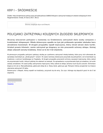 KRP I – ŚRÓDMIEŚCIE Źródło: http://srodmiescie.policja.waw.pl/rs/aktualnosci/18605,Policjanci-zatrzymali-kolejnych-zlodziei-sklepowych.html Wygenerowano: Środa, 8 marca 2017, 06:11 Strona znajduje się w archiwum. POLICJANCI ZATRZYMALI KOLEJNYCH ZŁODZIEI SKLEPOWYCH Wczoraj wieczorem policjanci z komendy na Śródmieściu zatrzymali dwie osoby związane z kradzieżami sklepowymi. Młoda dziewczyna wpadła na tym jak próbowała sprzedać obsłudze baru ukradzione kosmetyki. W drugim przypadku wpadł mężczyzna, który chciał ukraść dwie kurtki. Uciekał prawie kilometr, zanim zatrzymał go biegnący za nim pracownik ochrony sklepu. Dzisiaj oboje usłyszeli zarzuty kradzieży. Grozi za to do 5 lat więzienia. W pierwszym przypadku policjanci pełniący służbę po cywilnemu zatrzymali młodą kobietę, która przy nich oferowała do sprzedaży kosmetyki po „atrakcyjnych” cenach. W czasie rozmowy dziewczyna przyznała się policjantom, że te kosmetyki są kradzione z centrum handlowego na Targówku. W drugim przypadku pracownik ochrony zauważył mężczyznę, który zabrał do przymierzalni kurtki, których później nie odwiesił na wieszak. Po sprawdzeniu w przymierzalni było już wiadomo, że kurtki zostały ukradzione. W czasie próby zatrzymania mężczyzna, który zabrał ze sklepu ubrania rzucił się do ucieczki. Ochroniarz biegł za nim od ul. Marszałkowksiej, gdzie jest sklep do ul. Nowy świat, gdzie go ujął. Policjanci którzy przyjechali na miejsce zdarzenia zatrzymali 25 latka. Dziewczyna i chłopak, którzy wpadli na kradzieży, przyznali się do winy. Za czyn, którego się dopuścili grozi im do 5 lat więzienia. Ocena: 0/5 (0) Tweetnij