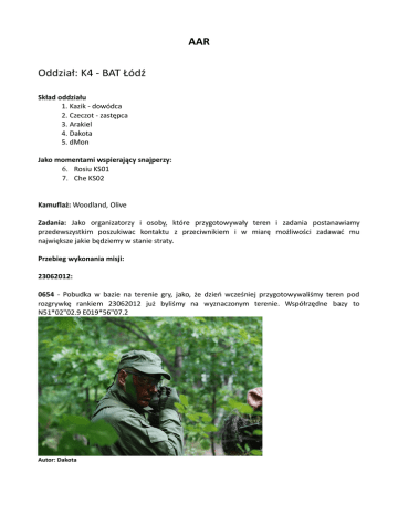 AAR Oddział: K4 - BAT Łódź Skład oddziału 1. Kazik - dowódca 2. Czeczot - zastępca 3. Arakiel 4. Dakota 5. dMon Jako momentami wspierający snajperzy: 6. Rosiu KS01 7. Che KS02 Kamuflaż: Woodland, Olive Zadania: Jako organizatorzy i osoby, które przygotowywały teren i zadania postanawiamy przedewszystkim poszukiwac kontaktu z przeciwnikiem i w miarę możliwości zadawać mu największe jakie będziemy w stanie straty. Przebieg wykonania misji: 23062012: 0654 - Pobudka w bazie na terenie gry, jako, że dzień wcześniej przygotowywaliśmy teren pod rozgrywkę rankiem 23062012 już byliśmy na wyznaczonym terenie. Współrzędne bazy to N51*02"02.9 E019*56"07.2 Autor: Dakota Autor: Dakota 0849 - Zakońyły się przygotowania drużyny do wymarszu, po wymalowaniu twarzy, zapakowaniu ekpikunku i określeniu warunków łączności jesteśmy gotowi wyruszyć w teren 0924 - wymarsz z bazy. Jako, że dzień wcześnie się to nie udało musimy przed rozpoczęciem działań, które przypadają na godzinę 1000 pozostawić w terenie Czerwony Mór. 0959 - przemarsz przez teren idzie łatwiej miż myśleliśmy na minutę przed regulaminowym rozpoczęciem rozgrywki Czerwony Mór zostaje pozostawiony w terenie. Autor: Dakota 1005 - Ok 150 metrów na południowy zachód od pozycji Czerwonego Móru w małym lasku przy skrzyżowaniu dróg rozstawiamy się na pozycjach obronnych, przygotowujemy zasadzkę i czekamy na kontakt. 1012 - Nazwiązujemy kontakt wzrokowy z Rosiem który pełni rolę samotnego Snajpera, mija nas i zajmuje pozycję na południe od nas za drogą. 1059 - Oczekiwanie na przeciwnika nadal bezowocne - nawiązujemy za to kontakt z Che, który jako samotny snajper także kręci się po okolicy. 1102 - Podjęta zostaje decyzja o wymarszu w kierunku północnym. Kilka minut później dostajemy sygnał, że na pozycjach w których oczekiwaliśmy na przeciwnika w końcu się on pokazał. Mając nadzieję, że podązy za nami w kierunku północnym przygotowujemy zasadzkę. 1244 - brak kontaktu, oczekiwanie na przeciwnika okazuje się bezowocne. Dokładnie o 1244 otrzymujemy informację przez radio od Rosia, że przeciwnik udał się w innym kierunku. Postanawiamy obrać kierunek północno wschodni. 1303 - Znajdujemy pierwsze cele – ujęcie wody źródlanej 3 i elektrownie 2. W ich pobliżu organizujemy krótki odpoczynek z jednoczesnym oczekiwaniem na ewentualny kontakt z przeciwnikiem. Niestety bezskutecznie Autor: Dakota 1334 - Opuszczamy pozycje obronne, wspólnie stwierdzamy, że najprędzej spotkamy przeciwnika przy pozycjach które zajeliśmy na samym początku, czyli przy ambonach. W tym też kierunku postanawiamy się udać, zamierzamy osiągnąć cel przechodząc nieopodal szpitala naszej strony, czyli konfederacji. 1441 - Bez kontaktu z przeciwnikiem docieramy do ambon, spotykamy się tam z Che, który także pełni rolę samotnego snajpera. Zabezpieczamy pozycje i ponownie czekamy na pczeciwnika. 1513 - Od ok 15 minut prowadze nasluch radiowy na innych kanałach mając nadzieję, że uda mi się kogoś podsłuchać. Wreszcie udaje się - na kanale nr 4 słyszę rozmowy któregoś oddziału, niestety z czasem sygnał zanika co jednoznacznie wskazuje na to że oddział oddala się od nas. Nie wiemy nawet czy to wróg czy nasz. Autor: Dakota 1528 - Do naszych pozycji dochodzi Rosiu, który cały czas obserwował teren do okoła, miał kilka kontaktów wzrokowych ale nie podejmował walki. Autor: Dakota 1600 - Zauważamy ruch, jedna osoba w młodniku na północ od nas, cały oddział skupia uwagę na tym sektorze. Jak się później dowiemy najprawdopodnobniej 200 metrów dalej przeciwnik szykował bazę na odpoczynek 1603 - Dwie osoby, najpewniej rozpoznanie którejś drużyny zachodzi nas od północy, bez wywołania hasło- odzew oddają do nas strzały. Cały oddział odpowiada ogniem. Przeciwnik ucieka, brak strat po naszej stronie. W czasie wymiany ognia awarii ulega replika Kazika - naszego dowódcy, postanawiamy że najrozsądniej będzie zerwać kontakt i oddalić się na bezpieczną pozycję aby spróbować naprawić replikę. 1715 - na pólnoc od szpitala konfederacji próbujemy naprawić replikę naszego dowódcy, niestety okazuje się, że padł silnik i w warunkach polowych nie ma szans na jego naprawę, w grę wchodzi jedynie jego wymiana a zapasowym nikt nie dysponuje. 1751 - Po raz kolejny postanawiamy spotkać się z Rosiem i Che (samotnymi snajperami) przy ambonach. 1813 - W drodze do celu znajdujemy koperte z kodami Autor: Dakota 1838 - Spotykamy się z Cze i Rosiem na wcześniej ustalonej pozycji w pobliżu skrzyżowania drug przy ambonach. Mimo że pierwotnie mieliśmy już wracać na nasze pozycje w których mieliśmy nocować otrzymujemy informację od naszych dwóch snajperów o tym, że w pobliżu miejsca w którym o godzinie 1600 zauważyliśmy ruch jednej osoby przeciwnik założył wcześnie coś na kształ bazy odpoczynkowej. Postnawiamy zaatakować. 1859 - Po półgodzinnym skradaniu się i poszukiwaniu śladów przeciwnika stwierdzamy, że najwyraźniej obóz musiał być bardzo tymczasowy gdyż nie ma po nim śladu, najpewniej przeciwnik oddalił się w sobie tylko znanym kierunku. Postanawiamy ruszyć na północ do miejsca gdzie spaliśmy poprzedniej nocy. 1937 - Maszerujemy drogą, w lesie robi się coraz ciemniej, jako czujka zauważam przy drodze "dziwny kształtów krzak". Po krótkiej chwili krzak przemawia do mnie pytając o hasło - podaję swoje, po chwili otrzymuję odzew zgodny z naszym - Ufff udało się spotkanie bez friendly fire. Okazuje się że to oddział MAGów, spragiony jak nigdy kontaktu z przeciwnikiem. Zauważyli nas wcześniej i przygotowali zasadzkę. Nie muszę dodawać jak bardzo byli rozżaleni kiedy okazało się, że walczymy po tej samej stronie i tym razem do nas nie postrzelają. Po krótkiej wymianie zdań i uwag ruszamy dalej w kierunku północny, MAGi w drugą stronę. 1952 - Docieramy do miejsca nasz