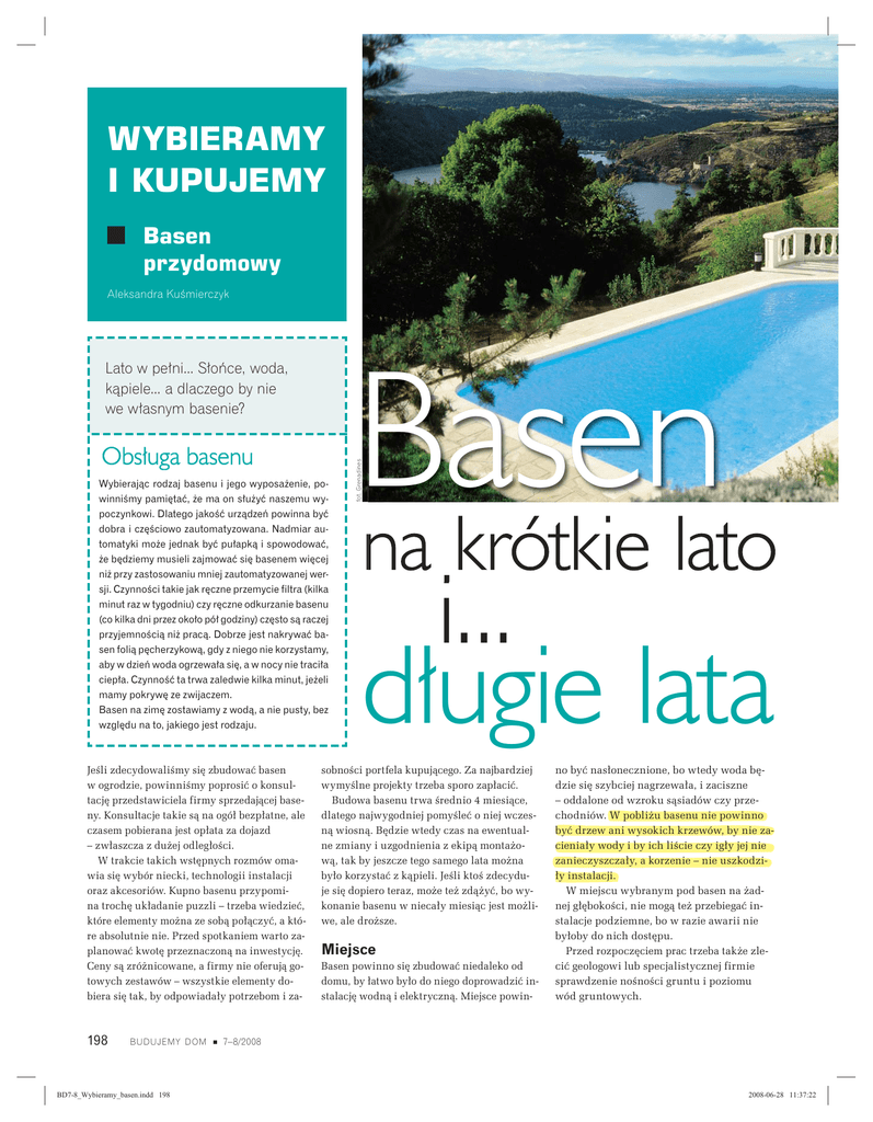 WYBIERAMY I KUPUJEMY Basen przydomowy Aleksandra KuĂmierczyk Obsïuga basenu WybierajÈc rodzaj basenu i jego wyposaĝenie, powinniĂmy pamiÚtaÊ, ĝe ma on sïuĝyÊ naszemu wypoczynkowi. Dlatego jakoĂÊ urzÈdzeñ powinna byÊ dobra i czÚĂciowo zautomatyzowana. Nadmiar automatyki moĝe jednak byÊ puïapkÈ i spowodowaÊ, ĝe bÚdziemy musieli zajmowaÊ siÚ basenem wiÚcej niĝ przy zastosowaniu mniej zautomatyzowanej wersji. CzynnoĂci takie jak rÚczne przemycie filtra (kilka minut raz w tygodniu) czy rÚczne odkurzanie basenu (co kilka dni przez okoïo póï godziny) czÚsto sÈ raczej przyjemnoĂciÈ niĝ pracÈ. Dobrze jest nakrywaÊ basen foliÈ pÚcherzykowÈ, gdy z niego nie korzystamy, aby w dzieñ woda ogrzewaïa siÚ, a w nocy nie traciïa ciepïa. CzynnoĂÊ ta trwa zaledwie kilka minut, jeĝeli mamy pokrywÚ ze zwijaczem. Basen na zimÚ zostawiamy z wodÈ, a nie pusty, bez wzglÚdu na to, jakiego jest rodzaju. JeĂli zdecydowaliĂmy siÚ zbudowaÊ basen w ogrodzie, powinniĂmy poprosiÊ o konsultacjÚ przedstawiciela firmy sprzedajÈcej baseny. Konsultacje takie sÈ na ogóï bezpïatne, ale czasem pobierana jest opïata za dojazd – zwïaszcza z duĝej odlegïoĂci. W trakcie takich wstÚpnych rozmów omawia siÚ wybór niecki, technologii instalacji oraz akcesoriów. Kupno basenu przypomina trochÚ ukïadanie puzzli – trzeba wiedzieÊ, które elementy moĝna ze sobÈ poïÈczyÊ, a które absolutnie nie. Przed spotkaniem warto zaplanowaÊ kwotÚ przeznaczonÈ na inwestycjÚ. Ceny sÈ zróĝnicowane, a firmy nie oferujÈ gotowych zestawów – wszystkie elementy dobiera siÚ tak, by odpowiadaïy potrzebom i za- 198 BUDUJEMY DOM BD7-8_Wybieramy_basen.indd 198 Basen na krótkie lato fot. Grenadines Lato w peïni... Sïoñce, woda, kÈpiele... a dlaczego by nie we wïasnym basenie? i... dïugie lata sobnoĂci portfela kupujÈcego. Za najbardziej wymyĂlne projekty trzeba sporo zapïaciÊ. Budowa basenu trwa Ărednio 4 miesiÈce, dlatego najwygodniej pomyĂleÊ o niej wczesnÈ wiosnÈ. BÚdzie wtedy czas na ewentualne zmiany i uzgodnienia z ekipÈ montaĝowÈ, tak by jeszcze tego samego lata moĝna byïo korzystaÊ z kÈpieli. JeĂli ktoĂ zdecyduje siÚ dopiero teraz, moĝe teĝ zdÈĝyÊ, bo wykonanie basenu w niecaïy miesiÈc jest moĝliwe, ale droĝsze. Miejsce Basen powinno siÚ zbudowaÊ niedaleko od domu, by ïatwo byïo do niego doprowadziÊ instalacjÚ wodnÈ i elektrycznÈ. Miejsce powin- no byÊ nasïonecznione, bo wtedy woda bÚdzie siÚ szybciej nagrzewaïa, i zaciszne – oddalone od wzroku sÈsiadów czy przechodniów. W pobliĝu basenu nie powinno byÊ drzew ani wysokich krzewów, by nie zacieniaïy wody i by ich liĂcie czy igïy jej nie zanieczyszczaïy, a korzenie – nie uszkodziïy instalacji. W miejscu wybranym pod basen na ĝadnej gïÚbokoĂci, nie mogÈ teĝ przebiegaÊ instalacje podziemne, bo w razie awarii nie byïoby do nich dostÚpu. Przed rozpoczÚciem prac trzeba takĝe zleciÊ geologowi lub specjalistycznej firmie sprawdzenie noĂnoĂci gruntu i poziomu wód gruntowych. 7–8/2008 2008-06-28 11:37:22 ZaleĝÈ od tego, czy basen ba bÚdzie sïuĝyï do pïywania, czy tylko d do rekreacji oraz od tego, ile osób bÚdzie z niego korzystaÊ jednoczeĂnie. PamiÚtajmy jednak o tym, ĝe wiÚkszy basen to wiÚksze koszty inwestycji i póěniejszej eksploatacji – droĝsze bÚdÈ urzÈdzenia do filtrowania wody i wiÚcej kosztowaÊ bÚdzie energia do jej podgrzewania. Duĝy basen bÚdzie teĝ trudniej utrzymaÊ w czystoĂci – wszystkie prace porzÈdkowe zajmÈ wiÚcej czasu i energii. Mieszkañcy domów jednorodzinnych najczÚĂciej wybierajÈ baseny o wymiarach: szerokoĂÊ – 4–5 m; dïugoĂÊ – 6–10 m; gïÚbokoĂÊ – 1,5 m. Takie parametry wystarczÈ do swobodnego pïywania i zabaw rodzinnych. Nie sÈ jednak odpowiednie, gdy basen ma sïuĝyÊ do skoków z brzegu czy trampoliny: gïÚbokoĂÊ takiego basenu powinna wynosiÊ od 1,8 do 2,7 m. Baseny majÈ róĝne ksztaïty – prostokÈt, owal, okrÈg, „ósemka”, a takĝe wszelkie inne – wedïug upodobañ i zasobnoĂci portfela inwestora, bo za nieregularne ksztaïty trzeba wiÚcej zapïaciÊ. Rodzaj Do ustawiania na powierzchni. MogÈ byÊ wykonane z blach stalowych z podporami usztywniajÈcymi lub bez pod- BD7-8_Wybieramy_basen.indd 199 28 058 zï * DELFIN ASTRAL POOL Idromas Minibasen wolno stojÈcy spa dla 4 osób Wyposaĝenie standardowe: 9 dysz, 3 typy masaĝu, regulator powietrza, filtr antybakteryjny, pompa filtrujÈca i hydromasajÈca, podgrzewacz wody, oĂwietlenie podwodne, panel sterujÈcy, system antyzamarzajÈcy, przykrycie termoizolacyjne, odkurzacz, wÈĝ odprowadzajÈcy wodÚ Wymiary (dï. × szer. × gï.): 2,10 × 2,10 × 0,70 m Draco seria Moonpool Basen do wkopania – niecka wykonana z paneli polimerowych, uszczelniona wkïadem foliowym o gruboĂci 0,7 mm Wyposaĝenie standardowe: brak; wyposaĝenie dobierane w zaleĝnoĂci od indywidualnych potrzeb klienta Wymiary (dï. × szer. × gï.): 7,32 × 3,66 × 1,52 m 35 000 zï 42 000 zï AQUA PLUS AQUA PLUS Floryda Basen do wkopania – niecka stalowa, ocynkowana ogniowo i zabezpieczona powïokÈ poliestrowÈ, pokryta lakierem ochronnym, basen wyïoĝony foliÈ o gruboĂci 0,6 mm Wyposaĝenie standardowe: skimmer, dysze, odpïyw denny, filtr piaskowy z zaworem i pompÈ, drabinka, oĂwietlenie podwodne, ogrzewanie, akcesoria do pielÚgnacji wody Wymiary (dï. × szer. × gï.): 12,6 × 6 × 1,5 m Hawaje Basen do wkopania – niecka wykonana z bloczka szalunkowego, wyïoĝona foliÈ zbrojonÈ, akrylowanÈ o gruboĂci 1,5 mm Wyposaĝenie standardowe: skimmer z brÈzu, dysze, stalowe odpïywy, oĂwietlenie podwodne, instalacja elektryczna i hydrauliczna, filtry z pompÈ i zaworem, wymiennik ciepïa, sterownik basenowy, drabinka oraz akcesoria do pielÚgnacji wody Wymiary (dï. × szer. × gï.): 8 × 4 × 1,4 – 1,6 m 52 000 zï 67 000 zï** AQUA PLUS DELFIN Miami Basen do wkopania – niecka z bloczka szal
