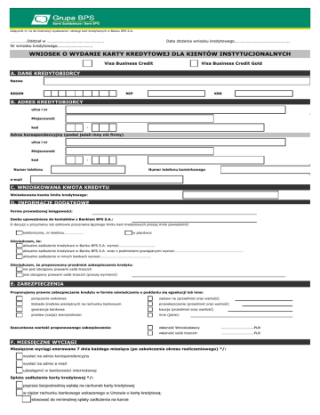 Załącznik nr 1a do Instrukcji wydawania i obsługi kart kredytowych w Banku BPS S.A. …………….Oddział w ………………………………………………. Nr wniosku kredytowego……………………………. Data złożenia wniosku kredytowego…………………………………………….. WNIOSEK O WYDANIE KARTY KREDYTOWEJ DLA KIENTÓW INSTYTUCJONALNYCH Visa Business Credit Visa Business Credit Gold A. DANE KREDYTOBIORCY Nazwa REGON NIP KRS B. ADRES KREDYTOBIORCY ulica i nr Miejscowość kod - Adres korespondencyjny (podać jeżeli inny niż firmy) ulica i nr Miejscowość kod - Numer telefonu Numer telefonu komórkowego e-mail C. WNIOSKOWANA KWOTA KREDYTU Wnioskowana kwota limitu kredytowego: D. INFORMACJE DODATKOWE Forma prowadzonej księgowości: Osoba upoważniona do kontaktów z Bankiem BPS S.A.: O decyzji o przyznaniu lub odmowie przyznania łącznego limitu kart kredytowych proszę mnie powiadomić: telefonicznie, nr telefonu………………… w placówce Oświadczam, że: aktualne zadłużenie kredytowe w Banku BPS S.A. wynosi…………………………………. aktualne zadłużenie kredytowe w Banku BPS S.A. wraz z podmiotami powiązanymi wynosi:………………………………………………………………… aktualne zadłużenie w innych bankach wynosi:………………………………………………. Oświadczam, że proponowany przedmiot zabezpieczenia kredytu: nie jest obciążony prawami osób trzecich jest obciążony prawami osób trzecich (proszę wymienić) E. ZABEZPIECZENIA Proponujemy prawne zabezpieczenie kredytu w formie oświadczenia o poddaniu się egzekucji lub inne: poręczenie wekslowe zastaw na (przedmiot oraz wartość) blokada środków pieniężnych na rachunku bankowym przewłaszczenie (przedmiot oraz wartość) gwarancja bankowa kaucja (przedmiot oraz wartość) przelew (cesja) wierzytelności inne (jakie): Szacunkowa wartość proponowanego zabezpieczenia: własność Wnioskodawcy ………………………………PLN własność osób trzecich ………………………………PLN F. MIESIĘCZNE WYCIĄGI Miesięczne wyciągi enerowane 7 dnia każdego miesiąca (po zakończenia okresu rozliczeniowego) */: wysłać na adres korespondencyjny wysłać na adres e-mail udostępnić w bankowości internetowej Spłata zadłużenia karty kredytowej */: poprzez bezpośrednią wpłatę na rachunek karty kredytowej w ciężar rachunku bankowego wskazanego w Umowie o kartę kredytową: stosować do minimalnej spłaty zadłużenia na karcie stosować do całkowitego salda zadłużenia Informujemy, że w przypadku nie dokonania żadnej transakcji płatniczej w danym okresie rozliczeniowym oraz braku zadłużenia wobec Banku z tytułu posługiwania się kartą Zestawienie transakcji płatniczych nie będzie generowane i przesyłane. G. DO WNIOSKU ZAŁACZAM/Y: 1) dokumenty formalno-prawne tj. dokumenty założycielskie: KRS, zaświadczenie o wpisie do ewidencji działalności gospodarczej lub odpis z rejestru właściwego dla formy prawnej Wnioskodawcy, 2) zaświadczenie*/oświadczenie* o nie zaleganiuz płatnościami na rzecz ZUS, 3) zaświadczenie*/oświadczenie* o nie zaleganiu z płatnościami na rzecz US, 4) kserokopię dowodu osobistego bądź innego dokumentu zwierającego zdjęcie i numer PESEL Wnioskodawcy i Użytkowników karty, 5) sprawozdanie finansowe z 2 pełnych lat obrotowych i bieżącego okresu 6) inne dokumenty (wymienić):…………………………………………………………………………………………………………………………………………………………………………………………. H. OŚWIADCZENIA 1. Przyjmuję do wiadomości informację Banku Polskiej Spółdzielczości S.A. w Warszawie, że: 1) Bank Polskiej Spółdzielczości S.A. z siedzibą w Warszawie, przy ul. Grzybowskiej 81 będzie administratorem moich danych osobowych w rozumieniu ustawy z dnia 29 sierpnia 1997 r. o ochronie danych osobowych (Dz. U. z 2014 r., poz. 1182); 2) dane te przetwarzane będą przez Bank Polskiej Spółdzielczości S.A. w celu rozpatrzenia niniejszego Wniosku oraz zawarcia i realizacji Umowy, a także w celach określonych w art. 23 ust. 1 pkt 3 ustawy o ochronie danych osobowych; 3) w zakresie ubezpieczenia assistance, Administratorem Danych, zgodnie z art. 23 ust. 1 pkt 3 ustawy z dnia 29 sierpnia 1997 r. o ochronie danych osobowych, (Dz. U. z 2014 r., poz. 1182), jest Concordia Polska Towarzystwo Ubezpieczeń Wzajemnych z siedzibą w Poznaniu, ul. Św. Michała 43, 61-119 Poznań; 4) przysługuje mi prawo dostępu do treści podanych danych osobowych oraz możliwość ich poprawiania. 2. Na podstawie Ustawy o ochronie danych osobowych z dnia 29.08.1997 r. (Dz. U. 2014, poz. 1182), wyrażam zgodę na przetwarzanie moich danych osobowych przez Bank Polskiej Spółdzielczości S.A. w celu reklamy produktów i usług Banku: TAK NIE Zgoda ta może być odwołana w każdym czasie. 3. Wyrażam zgodę na: 1) przetwarzanie moich danych osobowych przez Bank w celach promocji i marketingu działalności prowadzonej przez podmioty z Grupy BPS, inne niż Bank BPS S.A., w szczególności BPS Towarzystwo Funduszy Inwestycyjnych Spółka Akcyjna, z siedzibą w Warszawie, ul. Grzybowskiej 81, Dom Maklerski Banku Polskiej Spółdzielczości S.A. z siedzibą w Warszawie, ul. Grzybowskiej 81, BPS Leasing Spółka Akcyjna z siedzibą w Warszawie, ul. Grzybowskiej 87, BPS Faktor Spółka Akcyjna z siedzibą w Warszawie, ul. Grzybowskiej 81 w tym świadczonych usług oraz oferowanych produktów zgodnie z ustawą o ochronie danych osobowych z dnia 29 sierpnia 1997 r. (Dz. U. z 2014 r., poz. 1182): TAK NIE 2) przesyłanie informacji handlowej za pomocą środków komunikacji elektronicznej w rozumieniu ustawy o świadczeniu usług drogą elektroniczną z dnia 18 lipca 2002 r. (Dz. U. z 2013 r., poz. 1422 z późn. zm.) na adres poczty elektronicznej wskazanej we Wniosku: TAK NIE 3)