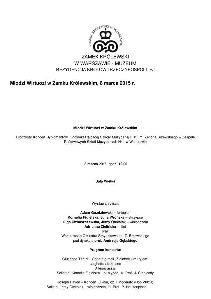 ZAMEK KRÓLEWSKI W WARSZAWIE - MUZEUM REZYDENCJA KRÓLÓW I RZECZYPOSPOLITEJ Młodzi Wirtuozi w Zamku Królewskim, 8 marca 2015 r. Młodzi Wirtuozi w Zamku Królewskim Uroczysty Koncert Dyplomantów Ogólnokształcącej Szkoły Muzycznej II st. im. Zenona Brzewskiego w Zespole Państwowych Szkół Muzycznych Nr 1 w Warszawie 8 marca 2015, godz. 12.00 Sala Wielka Wystąpią soliści: Adam Goździewski – fortepian Kornelia Figielska, Julia Wrońska – skrzypce Olga Chwaszczewska, Jerzy Oleksiak – wiolonczela Adrianna Zielińska – flet oraz Warszawska Orkiestra Smyczkowa im. Z. Brzewskiego pod dyrekcją prof. Andrzeja Gębskiego Program koncertu: Giuseppe Tartini – Sonata g-moll „Z diabelskim trylem” Larghetto affettuoso Allegro assai Solistka: Kornelia Figielska – skrzypce, kl. Prof. J. Staniendy Joseph Haydn – Koncert C -dur, cz. I Moderato (Hob.VIIb:1) Solista: Jerzy Oleksiak – wiolonczela, kl. Prof. P. Hausenplasa Solista: Jerzy Oleksiak – wiolonczela, kl. Prof. P. Hausenplasa Saverio Mercadante – Rondo Russo z Koncertu fletowego e-moll op. 6 Solistka: Adrianna Zielińska - flet, kl. Prof. B. Kierzkowskiej Pablo de Sarasate – Melodie cygańskie op. 20 nr 1 Solistka: Olga Chwaszczewska – wiolonczela, kl. Prof. A. Orkisza Camille Saint-Saëns – Introdukcja i Rondo capriccioso a-moll op. 28 Solistka: Julia Wrońska – skrzypce, kl. Prof. J. Kucharskiego i Prof. M. Orzechowskiej Fryderyk Chopin – Andante Spianato i Wielki Polonez Es-dur op. 22 Solista: Adam Goździewski, kl. Prof. J. Ławrynowicz-Just Romuald Twardowski – Tryptyk Mariacki Stajenka betlejemska Taniec 1 Złożenie do Grobu Taniec 2 Zmartwychwstanie Skład orkiestry: I skrzypce Andrzej Gębski - dyr. art. Emilia Jarocka Dorota Duda Wiktoria Borkowska Zuzanna Jurczak Natalia Orszak Tomasz Kobel II skrzypce Zuzanna Budzyńska Aleksandra Kłębukowska Wojciech Sojka Katarzyna Pernach Klara Gronet Mira Marton Semen Słobodianiuk Altówki Julia Pałęcka Kinga Wojdalska Anna Betlej-Gębska (gośc.) Wiolonczele Mikołaj Burzyński Bernadetta Wieczerzyńska Maciej Gąsior Jadwiga Roguska Wojciech Bafeltowski Borys Piszczatowski Emil Olejnik Mateusz Błaszczak Kontrabas Kontrabas Michał Mościcki Zamek Królewski w Warszawie - Muzeum. Rezydencja Królów i Rzeczypospolitej www.zamek-krolewski.pl