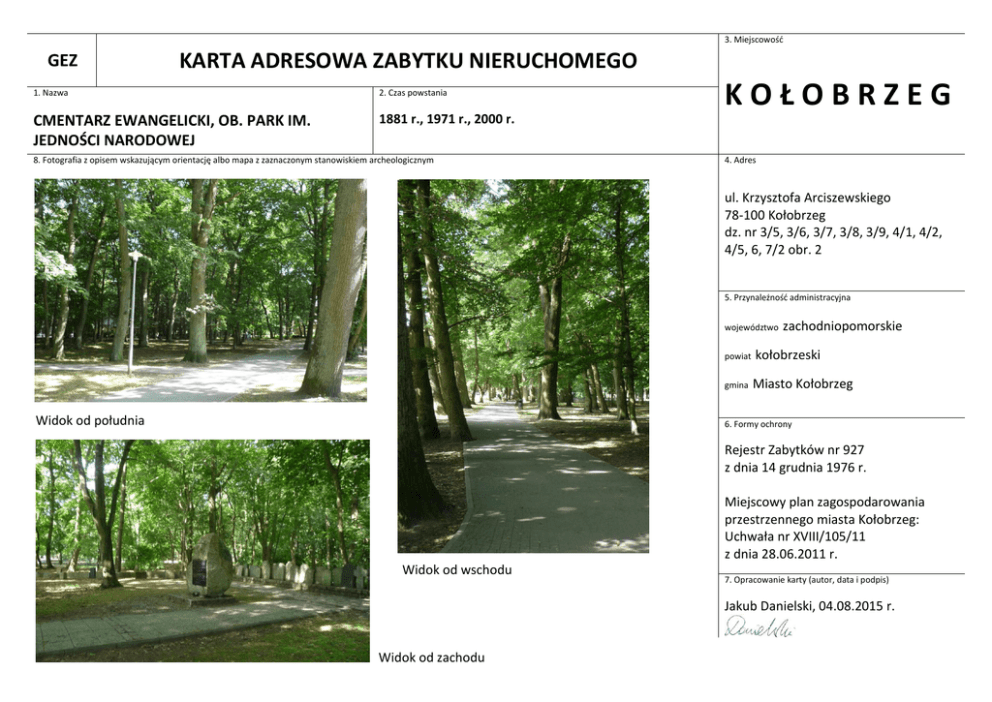 3. Miejscowośd GEZ KARTA ADRESOWA ZABYTKU NIERUCHOMEGO 1. Nazwa 2. Czas powstania CMENTARZ EWANGELICKI, OB. PARK IM. JEDNOŚCI NARODOWEJ 1881 r., 1971 r., 2000 r. 8. Fotografia z opisem wskazującym orientację albo mapa z zaznaczonym stanowiskiem archeologicznym KOŁOBRZEG 4. Adres ul. Krzysztofa Arciszewskiego 78-100 Kołobrzeg dz. nr 3/5, 3/6, 3/7, 3/8, 3/9, 4/1, 4/2, 4/5, 6, 7/2 obr. 2 5. Przynależnośd administracyjna województwo Widok od południa zachodniopomorskie powiat kołobrzeski gmina Miasto Kołobrzeg 6. Formy ochrony Rejestr Zabytków nr 927 z dnia 14 grudnia 1976 r. Miejscowy plan zagospodarowania przestrzennego miasta Kołobrzeg: Uchwała nr XVIII/105/11 z dnia 28.06.2011 r. Widok od wschodu 7. Opracowanie karty (autor, data i podpis) Jakub Danielski, 04.08.2015 r. Widok od zachodu 9. Opis Cmentarz ewangelicki założony w 1881 r. na zach. od parku ‘Die Maikuhle’, na planie zbliżonym do prostokąta. Wejście główne - na przedłużeniu ul. Jedności Narodowej. Geometryczny układ kompozycyjny cmentarza. Alejki przecinały się pod kątem prostym dzieląc cmentarz na prostokątne kwatery, obsadzone pojedynczymi rzędami klonów pospolitych i jaworów. Od 1945 r. - do lat 60. XX w. cmentarz dewastowany, zlikwidowany w 1971 r i przekształcony na park. W 2000 r. otwarto niemieckie lapidarium. Układ cmentarza pozostaje czytelny w formie głównej alei , w części płn. cmentarza rozwidlającej się w dwie aleje równoległe, przecięte kilkoma alejkami prostopadłymi. Roślinnośd: kasztanowiec biały, dąb szypułkowy, wierzba iwa i wiąz górski; w poszyciu nielicznie: jaśminowiec wonny, róża pomarszczona, porzeczka alpejska, bluszcz pospolity, etc. Pośrodku płd. części parku, przy rozwidleniu alejek - lapidarium niemieckie. 10. Wnioski konserwatorskie Rozplanowanie historycznego cmentarza, obecnie parku pozostaje czytelne. Lapidarium odnowione po dewastacji w 2008 r. - stan dobry. Ochronie podlega: układ przestrzenny parku, historycznie ukształtowane granice, układ sieci dróg, pozostałości cmentarza, układ kompozycji zieleni, szata roślinna i jej skład gatunkowy, zbiorniki i cieki wodne, historyczna zabudowa i jej powiązania z kompozycją parkową, zabytkowa mała architektura, istniejąca infrastruktura, układ lapidarium i jego elementy. Należy dążyd do właściwego utrzymania obiektu, udostępniania i wykorzystania, przy zachowaniu wszystkich elementów historycznych i zabytkowych. Obowiązuje uzgadnianie z Konserwatorem Zabytków wszelkich działao inwestycyjnych. 10. Lokalizacja