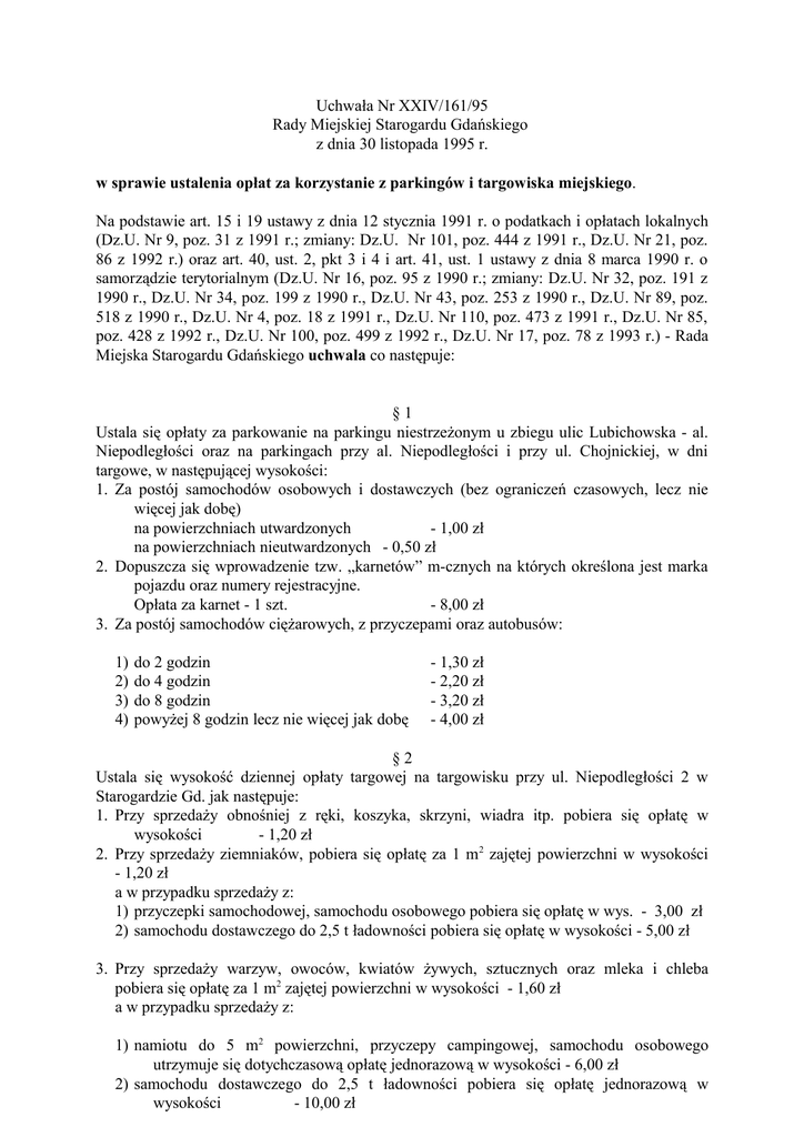 Uchwała Nr XXIV/161/95 Rady Miejskiej Starogardu Gdańskiego z dnia 30 listopada 1995 r. w sprawie ustalenia opłat za korzystanie z parkingów i targowiska miejskiego. Na podstawie art. 15 i 19 ustawy z dnia 12 stycznia 1991 r. o podatkach i opłatach lokalnych (Dz.U. Nr 9, poz. 31 z 1991 r.; zmiany: Dz.U. Nr 101, poz. 444 z 1991 r., Dz.U. Nr 21, poz. 86 z 1992 r.) oraz art. 40, ust. 2, pkt 3 i 4 i art. 41, ust. 1 ustawy z dnia 8 marca 1990 r. o samorządzie terytorialnym (Dz.U. Nr 16, poz. 95 z 1990 r.; zmiany: Dz.U. Nr 32, poz. 191 z 1990 r., Dz.U. Nr 34, poz. 199 z 1990 r., Dz.U. Nr 43, poz. 253 z 1990 r., Dz.U. Nr 89, poz. 518 z 1990 r., Dz.U. Nr 4, poz. 18 z 1991 r., Dz.U. Nr 110, poz. 473 z 1991 r., Dz.U. Nr 85, poz. 428 z 1992 r., Dz.U. Nr 100, poz. 499 z 1992 r., Dz.U. Nr 17, poz. 78 z 1993 r.) - Rada Miejska Starogardu Gdańskiego uchwala co następuje: §1 Ustala się opłaty za parkowanie na parkingu niestrzeżonym u zbiegu ulic Lubichowska - al. Niepodległości oraz na parkingach przy al. Niepodległości i przy ul. Chojnickiej, w dni targowe, w następującej wysokości: 1. Za postój samochodów osobowych i dostawczych (bez ograniczeń czasowych, lecz nie więcej jak dobę) na powierzchniach utwardzonych - 1,00 zł na powierzchniach nieutwardzonych - 0,50 zł 2. Dopuszcza się wprowadzenie tzw. „karnetów” m-cznych na których określona jest marka pojazdu oraz numery rejestracyjne. Opłata za karnet - 1 szt. - 8,00 zł 3. Za postój samochodów ciężarowych, z przyczepami oraz autobusów: 1) 2) 3) 4) do 2 godzin do 4 godzin do 8 godzin powyżej 8 godzin lecz nie więcej jak dobę - 1,30 zł - 2,20 zł - 3,20 zł - 4,00 zł §2 Ustala się wysokość dziennej opłaty targowej na targowisku przy ul. Niepodległości 2 w Starogardzie Gd. jak następuje: 1. Przy sprzedaży obnośniej z ręki, koszyka, skrzyni, wiadra itp. pobiera się opłatę w wysokości - 1,20 zł 2. Przy sprzedaży ziemniaków, pobiera się opłatę za 1 m2 zajętej powierzchni w wysokości - 1,20 zł a w przypadku sprzedaży z: 1) przyczepki samochodowej, samochodu osobowego pobiera się opłatę w wys. - 3,00 zł 2) samochodu dostawczego do 2,5 t ładowności pobiera się opłatę w wysokości - 5,00 zł 3. Przy sprzedaży warzyw, owoców, kwiatów żywych, sztucznych oraz mleka i chleba pobiera się opłatę za 1 m2 zajętej powierzchni w wysokości - 1,60 zł a w przypadku sprzedaży z: 1) namiotu do 5 m2 powierzchni, przyczepy campingowej, samochodu osobowego utrzymuje się dotychczasową opłatę jednorazową w wysokości - 6,00 zł 2) samochodu dostawczego do 2,5 t ładowności pobiera się opłatę jednorazową w wysokości - 10,00 zł 3) samochodu ciężarowego lub ciągnika rolniczego z przyczepą pobiera się opłatę jednorazową w wysokości -15,00 zł 4) w przypadku ustawienia dodatkowych urządzeń handlowych przy obiektach wymienionych w p-tach od 1-3 pobiera się opłatę dodatkową za 1 m2 zajętej powierzchni w wysokości - 1,60 zł 4. Przy sprzedaży artykułów spożywczych pozostałych: 1) za 1 m2 zajętej powierzchni w wysokości - 2,00 zł 2) z namiotu do 5 m2 powierzchni przyczepy campingowej, samochodu osobowego pobiera się opłatę jednorazową w wysokości - 7,80 zł 3) z samochodu dostawczego do 2,5 t ładowności pobiera się opłatę jednorazową w wysokości - 10,00 zł 4) z samochodu ciężarowego i ciągnika rolniczego z przyczepą pobiera się opłatę jednorazową w wysokości - 16,00 zł 5) w przypadku ustawienia dodatkowych urządzeń handlowych przy obiektach wymienionych w p-tach 2-4 pobiera się dodatkową opłatę za 1 m2 zajętej powierzchni w wysokości - 1,60 zł 5. Przy sprzedaży artykułów przemysłowych: 1) za 1 m2 zajętej powierzchni w wysokości - 3,10 zł 2) z namiotu do 5 m2 powierzchni, przyczepy campingowej, samochodu osobowego pobiera się opłatę jednorazową w wysokości - 8,40 zł 3) z samochodu dostawczego do 2,5 t ładowności pobiera się opłatę jednorazową w wysokości - 10,80 zł 4) z samochodu ciężarowego i ciągnika rolniczego z przyczepą i autobusu pobiera się opłatę jednorazową w wysokości - 16,00 zł 5) w przypadku ustawienia dodatkowych urządzeń handlowych przy obiektach wymienionych w p-tach od 2-4 pobiera się opłatę dodatkową za 1 m2 zajętej powierzchni - 1,60 zł 6. Za handel towarami (odzieżą) używaną pobiera się opłatę za 1 m2 zajętej powierzchni w wysokości - 1,80 zł a w przypadku sprzedaży z: 1) samochodu osobowego pobiera się opłatę jednorazową w wysokości - 4,80 zł 2) samochodu dostawczego do 2,5 t ładowności pobiera się opłatę jednorazową w wysokości - 6,00 zł 7. Przy sprzedaży towarów w wiatach: 1) nr 1 pobiera się opłatę jednorazową od każdego stoiska w dni targowe (wtorki i piątki) w wysok. - 8,40 zł 2) nr 2 pobiera się opłatę jednorazową od każdego stoiska w dni targowe (wtorki i piątki) w wysok. - 12,00 zł 3) w przypadku ustawienia dodatkowych urządzeń handlowych w dni targowe (wtorki i piątki) wymienionych w ust. 7 p-ktach 1 i 2 pobiera się opłatę dodatkową za 1 m 2 zajętej powierzchni w wysokości - 1,60 zł 4) w pozostałe dni (poza wtorkiem i piątkiem) za sprzedaż towarów w wiatach nr 1 i 2 obowiązuje opłata o 50% niższa. 8. Odstępuje się od pobierania opłaty targowej od młodzieży szkół podstawowych w okresie wakacyjnym (lipiec, sierpień) za sprzedaż książek szkolnych. §3 Ustala się wysokość dziennej opłaty targowej na targowisku przy al. Niepodległości 2a w Starogardzie Gd. za korzystanie z giełdy samochodowej w wysokości - 4,00 zł od 1 samochodu. §4 Ustala się wysokość stawek dziennych opłaty targowej na targowisku zwierzęcym przy ul. Zblewskiej - Zielonej jak następuje: 1. Za oferowaną sprzedaż koni od 1 roku wzwyż za każdą sztukę - 7,70 zł 2. Za oferowaną sprzedaż krów od 2 lat wzwyż za każdą sztukę - 5,50 zł 3. Za oferowaną sprzedaż jałowic od 1 roku do 2 lat za każdą sztukę - 3,85 