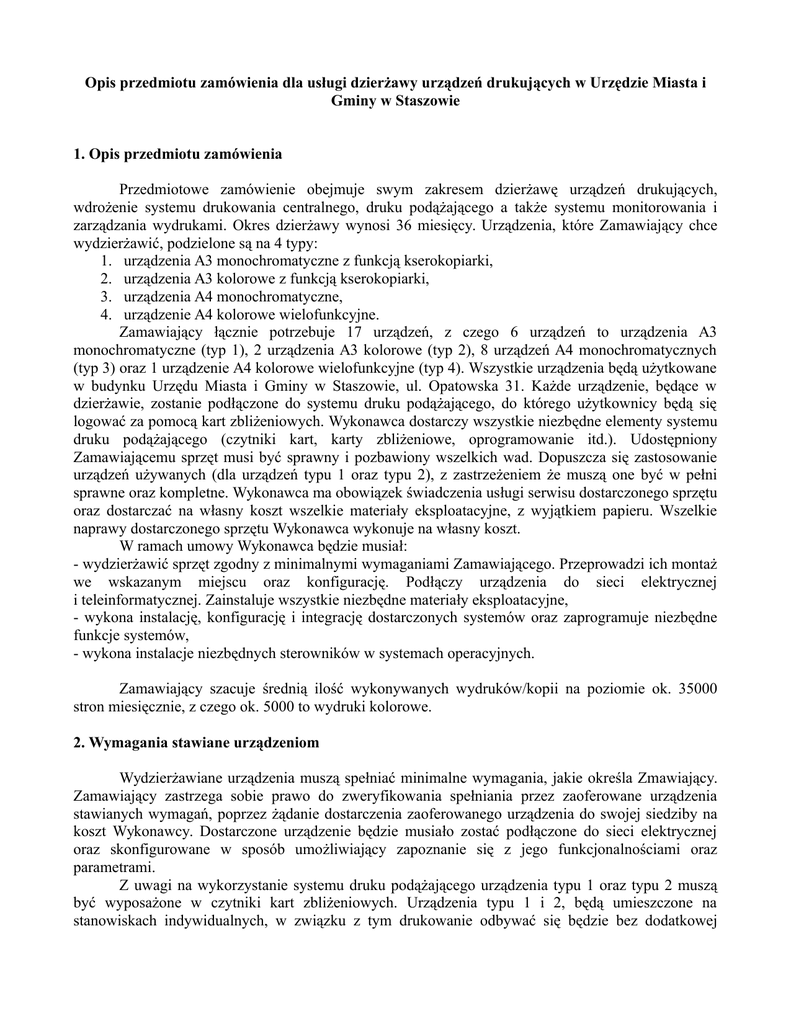 Opis przedmiotu zamówienia dla usługi dzierżawy urządzeń drukujących w Urzędzie Miasta i Gminy w Staszowie 1. Opis przedmiotu zamówienia Przedmiotowe zamówienie obejmuje swym zakresem dzierżawę urządzeń drukujących, wdrożenie systemu drukowania centralnego, druku podążającego a także systemu monitorowania i zarządzania wydrukami. Okres dzierżawy wynosi 36 miesięcy. Urządzenia, które Zamawiający chce wydzierżawić, podzielone są na 4 typy: 1. urządzenia A3 monochromatyczne z funkcją kserokopiarki, 2. urządzenia A3 kolorowe z funkcją kserokopiarki, 3. urządzenia A4 monochromatyczne, 4. urządzenie A4 kolorowe wielofunkcyjne. Zamawiający łącznie potrzebuje 17 urządzeń, z czego 6 urządzeń to urządzenia A3 monochromatyczne (typ 1), 2 urządzenia A3 kolorowe (typ 2), 8 urządzeń A4 monochromatycznych (typ 3) oraz 1 urządzenie A4 kolorowe wielofunkcyjne (typ 4). Wszystkie urządzenia będą użytkowane w budynku Urzędu Miasta i Gminy w Staszowie, ul. Opatowska 31. Każde urządzenie, będące w dzierżawie, zostanie podłączone do systemu druku podążającego, do którego użytkownicy będą się logować za pomocą kart zbliżeniowych. Wykonawca dostarczy wszystkie niezbędne elementy systemu druku podążającego (czytniki kart, karty zbliżeniowe, oprogramowanie itd.). Udostępniony Zamawiającemu sprzęt musi być sprawny i pozbawiony wszelkich wad. Dopuszcza się zastosowanie urządzeń używanych (dla urządzeń typu 1 oraz typu 2), z zastrzeżeniem że muszą one być w pełni sprawne oraz kompletne. Wykonawca ma obowiązek świadczenia usługi serwisu dostarczonego sprzętu oraz dostarczać na własny koszt wszelkie materiały eksploatacyjne, z wyjątkiem papieru. Wszelkie naprawy dostarczonego sprzętu Wykonawca wykonuje na własny koszt. W ramach umowy Wykonawca będzie musiał: - wydzierżawić sprzęt zgodny z minimalnymi wymaganiami Zamawiającego. Przeprowadzi ich montaż we wskazanym miejscu oraz konfigurację. Podłączy urządzenia do sieci elektrycznej i teleinformatycznej. Zainstaluje wszystkie niezbędne materiały eksploatacyjne, - wykona instalację, konfigurację i integrację dostarczonych systemów oraz zaprogramuje niezbędne funkcje systemów, - wykona instalacje niezbędnych sterowników w systemach operacyjnych. Zamawiający szacuje średnią ilość wykonywanych wydruków/kopii na poziomie ok. 35000 stron miesięcznie, z czego ok. 5000 to wydruki kolorowe. 2. Wymagania stawiane urządzeniom Wydzierżawiane urządzenia muszą spełniać minimalne wymagania, jakie określa Zmawiający. Zamawiający zastrzega sobie prawo do zweryfikowania spełniania przez zaoferowane urządzenia stawianych wymagań, poprzez żądanie dostarczenia zaoferowanego urządzenia do swojej siedziby na koszt Wykonawcy. Dostarczone urządzenie będzie musiało zostać podłączone do sieci elektrycznej oraz skonfigurowane w sposób umożliwiający zapoznanie się z jego funkcjonalnościami oraz parametrami. Z uwagi na wykorzystanie systemu druku podążającego urządzenia typu 1 oraz typu 2 muszą być wyposażone w czytniki kart zbliżeniowych. Urządzenia typu 1 i 2, będą umieszczone na stanowiskach indywidualnych, w związku z tym drukowanie odbywać się będzie bez dodatkowej autoryzacji. Wymaga się, aby zastosowane karty posiadały, możliwość personalizacji, poprzez naniesienie na nie informacji o przypisanych do nich pracownikach. Zamawiający wymaga, aby Wykonawca posiadał niezbędne certyfikaty w zakresie serwisu zaoferowanych urządzeń wystawione przez producenta lub dystrybutora sprzętu. Na potwierdzenie tego warunku Wykonawca przedstawi Zamawiającemu kopie stosownych dokumentów. Szczegółowe minimalne wymagania co do poszczególnych typów urządzeń: 1. Urządzenie A3 monochromatyczne wielofunkcyjne Technologia druku Elektrostatyczna z wykorzystaniem tonera Rodzaj druku monochromatyczny Rozdzielczość druku Min 600 x 1200 dpi Obsługiwane formaty papieru Co najmniej A4, A3, koperty Możliwość skalowania kopiowanego dokumentu Tak, co najmniej w zakresie od 25 % do 400 % Prędkość druku A4 Co najmniej 25 str. na minutę Prędkość druku A3 Co najmniej 16 str. na minutę Prędkość skanowania Co najmniej 50 obrazów na minutę Formaty skanowanych plików Co najmniej JPEG, TIFF, XPS, PDF jedno i wielostronicowy Tryby skanowania Automatyczny kolor, kolor, skala szarości, czarnobiały Funkcje skanowania Skanowanie do USB, e-mail, skanowanie do pliku, z możliwością obsługi protokołów SMB, FTP, FTPS oraz lokalnie Czas nagrzewania Maksymalnie 22 sekund z trybu uśpienia Pamięć RAM urządzenia Minimum 1 GB Zainstalowany dysk twardy Minimum 160 GB z możliwością szyfrowania sprzętowego minimum AES256 Emulacje Co najmniej PCL6, PS3 Interfejsy Co najmniej USB 2.0, Ethernet 1000BaseT Obsługiwane systemy operacyjne Co najmniej Windows Vista, 7, 8 oraz 10, Linux/Unix Podajniki papieru Co najmniej 2 kasety uniwersalne na papier oraz podajnik ręczny na minimum 100 arkuszy Dodatkowy podajnik papieru(zamiast podstawy Tak, umożliwiający umieszczenie co najmniej pod urządzenie) 2000 arkuszy papieru A4 Podajnik dokumentów (ADF) Co najmniej na 100 arkuszy z funkcją odwracania Wydruk dwustronny Tak Materiały eksploatacyjne Urządzenie musi obsługiwać materiały eksploatacyjne (tonery) o pojemności wystarczającej na wydrukowanie co najmniej 35000 stron przy 5% pokryciu strony A4 Panel sterowania kolorowy o wielkości nie mniejszej niż 9 cali Stan techniczny Fabrycznie nowy lub używany, wyprodukowany nie wcześniej niż 2012 rok ze stanem licznika nie większym niż 10000 stron. 2. Urządzenie A3 kolorowe wielofunkcyjne Technologia druku Laserowa Rodzaj druku Kolorowy Rozdzielczość druku Co najmniej 600 x 600 dpi Obsługiwane formaty papieru Co najmniej A4, A3, koperty Prędkość druku Co najmniej 20 stron / minutę Prędkość skanowania Co najmniej 50 obrazów / minutę Formaty plików skanów Co najmniej JPEG, T