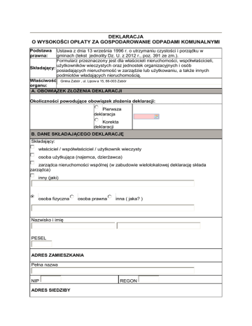 DEKLARACJA O WYSOKOŚCI OPŁATY ZA GOSPODAROWANIE ODPADAMI KOMUNALNYMI Ustawa z dnia 13 września 1996 r. o utrzymaniu czystości i porządku w gminach (tekst jednolity Dz. U. z 2012 r., poz. 391 ze zm.). Formularz przeznaczony jest dla właścicieli nieruchomości, współwłaścicieli, użytkowników wieczystych oraz jednostek organizacyjnych i osób Składający: posiadających nieruchomość w zarządzie lub użytkowaniu, a także innych podmiotów władających nieruchomością. Właściwość Gmina Zabór , ul. Lipow a 15, 66-003 Zabór organu: A. OBOWIĄZEK ZŁOŻENIA DEKLARACJI Podstawa prawna: Okoliczności powodujące obowiązek złożenia deklaracji: Pierwsza deklaracja Korekta deklaracji B. DANE SKŁADAJĄCEGO DEKLARACJĘ Składający: właściciel / współwłaściciel / użytkownik wieczysty osoba użytkująca (najemca, dzierżawca) zarządca nieruchomości wspólnej (w zabudowie wielolokalowej deklarację składa zarządca) inny (jaki) osoba fizyczna osoba prawna inna ( jaka? ) Nazwisko i imię PESEL ADRES ZAMIESZKANIA Pełna nazwa NIP ADRES SIEDZIBY REGON Województwo Kraj PL Miejscowość Kod pocztowy Ulica Nr domu Poczta Gmina Adres e-mail Telefon Nr lokalu C. RODZAJ I ADRES NIERUCHOMOŚCI, NA KTÓREJ POWSTAJĄ ODPADY KOMUNALNE (w przypadku posiadania więcej niż jednej nieruchomości dla każdej z nich wypełnić odrębną Deklarację) Rodzaj nieruchomości nieruchomość, na której stale i czasowo zamieszkują mieszkańcy nieruchomość wielolokalowa, na której stale i czasowo zamieszkują mieszkańcy nieruchomość niezamieszkała Miejscowość Należy wybrać właściwy rodzaj nieruchomości Ulica Nr domu Nr lokalu W przypadku, gdy nieruchomość nie ma nr porządkowego, proszę podać dane geodezyjne (obręb i nr działki) / C1. Dotyczy właścicieli nieruchomości, na której stale i czasowo zamieszkują mieszkańcy Sposób zbierania odpadów na nieruchomości: nieselektywnie (zmieszane) selektywnie selektywnie z kompostownikiem Oświadczam, że na terenie nieruchomości wskazanej w części C niniejszej deklaracji zamieszkuje osób: Ilość odpadów komunalnych Liczba Typ zbiornika pojemników 0 Stawka za osobę (zł) Kwota opłaty pojemnik 80 l pojemnik 120 l 12 0.00 pojemnik 240 l pojemnik 80 l 8 0.00 pojemnik 120 l pojemnik 240 l Jeśli wybrano selektywny sposób gromadzenia odpadów należy wpisać liczbę worków (120 l) pojemnik 80 l 6 pojemnik 120 l 0.00 pojemnik 240 l Jeśli wybrano selektywny sposób gromadzenia odpadów należy wpisać liczbę worków (120 l) C2. Dotyczy właścicieli nieruchomości wielolokalowej, na której stale i czasowo zamieszkują mieszkańcy Sposób zbierania odpadów na nieruchomości: nieselektywnie (zmieszane) selektywnie Oświadczam, że na terenie nieruchomości wskazanej w części C niniejszej deklaracji zamieszkuje osób: Ilość odpadów komunalnych Stawka za Liczba osobę (zł) Typ zbiornika pojemników Poj. na odpady segregowane frakcja mokra Należy wybrać właściwy typ pojemnika Poj. na odpady segregowane frakcja sucha 0 Kwota opłaty 8 0.00 Należy wybrać właściwy typ pojemnika Należy 12 0.00 wybrać właściwy typ pojemnika C3. Dotyczy właścicieli nieruchomości niezamieszkałych, na których powstają odpady. Liczba osób zatrudnionych lub przebywających: Sposób zbierania odpadów na nieruchomości: nieselektywnie (zmieszane) selektywnie selektywnie z kompostnikiem Wybór zbiornika na odpady: małe (pojemniki 80 l - 1100 l) duże (pojemniki 3m3-10m3) Ilość odpadów komunalnych Typ zbiornika pojemnik 80 l pojemnik 120 l pojemnik 240 l pojemnik 1100 l Ilość worków (120 l) do selektywnej zbiórki Stawka za pojemnik z odpadami liczba pojemników komunalnymi (zł) 0 25 0.00 0 30 0.00 0 60 0.00 0 270 0.00 0 stawka za worek Ilość odpadów komunalnych (pojemniki na odpady 3 m3 - 10 m3) Pojemność zbiornika (w m3) liczba pojemników 0 Ilość worków (120 l) do selektywnej zbiórki 0.00 5 Opłata łączna 0 Kwota opłaty 0 Stawka za 1 m3 odpadów (zł) 200 stawka za worek 0 Kwota opłaty 0.00 0.00 5 Opłata łączna 0 Wybór zbiornika na odpady: małe (pojemniki 80 l - 1100 l) duże (pojemniki 3m3-10m3) Ilość odpadów komunalnych Typ zbiornika pojemnik 80 l pojemnik 120 l pojemnik 240 l pojemnik 1100 l Ilość worków (120 l) do selektywnej zbiórki Stawka za pojemnik z odpadami liczba pojemników komunalnymi (zł) Kwota opłaty 0 14 0.00 0 20 0.00 0 40 0.00 0 160 0.00 0 stawka za worek Opłata łączna Ilość odpadów komunalnych (pojemniki na odpady 3 m3 - 10m3) 0.00 5 Stawka za 1 m3 odpadów (zł) 0 Kwota opłaty Pojemność zbiornika (w m3) 0 liczba pojemników 0 Ilość worków (120 l) do selektywnej zbiórki 0 140 stawka za worek 0.00 0.00 5 Opłata łączna 0 Wybór zbiornika na odpady: małe (pojemniki 80 l - 1100 l) duże (pojemniki 3m3-10m3) Ilość odpadów komunalnych Typ zbiornika pojemnik 80 l pojemnik 120 l pojemnik 240 l pojemnik 1100 l Ilość worków (120 l) do selektywnej zbiórki Stawka za pojemnik z odpadami liczba pojemników komunalnymi (zł) 0 9 0.00 0 12 0.00 0 24 0.00 0 110 0.00 0 stawka za worek Ilość odpadów komunalnych (pojemniki na odpady 3 m3 - 10m3) Pojemność zbiornika (w m3) liczba pojemników Ilość worków (120 l) do selektywnej zbiórki 0.00 5 Opłata łączna 0 Kwota opłaty 0 0 Stawka za 1 m3 odpadów (zł) 100 stawka za worek 0 Kwota opłaty 0.00 0.00 5 Opłata łączna 0 Pouczenie: 1) Niniejsza deklaracja stanowi podstawę do wystawienia tytułu wykonawczego, zgodnie z przepisami ustawy z dnia 17 czerwca 1966 r. o postępowaniu egzekucyjnym w administracji (Dz. U. z 2012 r. poz. 1015 ze zmianami). 2) Właściciel nieruchomości jest zobowiązany złożyć deklarację o wysokości opłaty za gospodarowanie odpadami komunalnymi w terminie 14 dni od dnia zamieszkania na danej nieruchomości pierwszego mieszkańca lub powstania na danej nieruchomości odpadów komunalnych. 3) W przypadku zmiany danych będących podstawą ustalenia wysokości należnej opł
