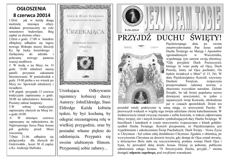 OGŁOSZENIA 8 czerwca 20014 1.Dziś jak w każdą drugą niedzielę miesiąca ofiary składane przeznaczmy na cele remontowo budowlane. Bóg zapłać za złożone ofiary . 2.Dziś o godz. 17.00 w katedrze elbląskiej odbędzie się ingres nowego Biskupa naszej diecezji Ks. bp Jacka Jezierskiego . Zachęcamy do udziału i polecamy nowego pasterza waszej modlitwie . 3. W środę o na Mszy św. O godz. 18.00 młodzież naszej parafii przymnie sakrament bierzmowania .W poniedziałek o godz. 19.00 próba a we wtorek po Mszy św. Spowiedź młodzieży i świadków. 4.W piątek przypada 13 czerwca tradycyjnie zapraszamy o godz. 20.00 na nabożeństwo fatimskie. Prosimy zabrać lampiony . 5.W sobotę tradycyjnie zapraszamy chorych na Mszę św. o godz.10.00. 6. W miesiącu czerwcu zapraszamy na nabożeństwa do Najświętszego Serca Pana Jezusa pół godziny przed Msza wieczorną. 7.Dnia 21.06. odbędzie się pielgrzymka dla chorych do Gietrzwałdu , koszt 30 zł..zapisy u Ks. Andrzeja Hafiruka . 8.06.2014 PRZYJDŹ DUCHU ŚWIĘTY! Urzekająca. Odkrywanie tajemnicy kobiecej duszy Autorzy: JohnEldredge, Stasi Eldredge Każda kobieta tęskni, by być kochaną, by odegrać niezastąpioną rolę w wielkiej przygodzie, oraz by posiadać własne piękno do odsłonięcia. Przypatrz się swoim ulubionym filmom. Przypomnij sobie zabawy... Pięćdziesiątego dnia po swoim zmartwychwstaniu Pan Jezus zesłał Ducha Świętego na Maryję i Apostołów zgromadzonych w Wieczerniku, wypełniając tym samym swoją obietnicę: "Gdy przyjdzie Duch Pocieszyciel, którego Ja wam poślę od Ojca, Duch Prawdy, który od Ojca pochodzi, On będzie świadczył o Mnie" (J 15, 26). W dniu Pięćdziesiątnicy Kościół, ożywiony Duchem Świętym, rozpoczyna przepowiadanie radosnej nowiny o zbawieniu wszystkim narodom. Zielone Świątki, bo tak brzmi popularna nazwa dzisiejszej uroczystości, to jedno z najstarszych świąt Kościoła, obchodzone już w czasach apostolskich. Dzień ten posiadał wtedy praktycznie tę samą rangę, co uroczystość Paschy. W pierwszych wiekach w wigilię tego święta udzielano chrztu katechumenom. W średniowieczu istniał zwyczaj rzucania z sufitu kościoła, w trakcie odprawiania Mszy świętej, róż i innych kwiatów symbolizujących dary Ducha Świętego. W bazylikach i katedrach w czasie uroczystości wypuszczano z klatek gołębie: symbol Ducha Świętego. Kościół przypomina, że Pięćdziesiątnica jest wypełnieniem i zakończeniem Świąt Paschalnych. Duch Święty - Nowe Życie w Chrystusie - był celem całej działalności Chrystusa. Zgodnie z obietnicą, po wywyższeniu Chrystusa na drzewie krzyża, gdy dostęp do Ojca został otwarty, a dziecięctwo Boże stało się rzeczywistością, posłany zostaje Duch Ojca i Syna, by prowadził dalej dzieło Jezusa. Dzisiaj za pobożne, publiczne odmówienie całego hymnu: "O Stworzycielu Duchu, przyjdź..." można dostąpić odpustu zupełnego, pod zwykłymi warunkami. Duch Święty daje pewność zbawienia Wiara w Ducha Świętego i dostrzeganie różnych przejawów Jego obecności i działania przysparzają nam chyba sporo trudności A wszystko dlatego, że wskutek uproszczonej katechezy rolę Ducha Świętego sprowadzamy jedynie do Zielonych Świątek i bierzmowania. Historycznie obecność Ducha Świętego kojarzy się nam tylko z widowiskowym ogniem, wichrem i odważnym wyjściem apostołów z Wieczernika na ulice Jerozolimy. A dziś - według analogicznie zawężonych wyobrażeń - Duch Święty miałby działać jedynie w sakramencie bierzmowania. Może właśnie wskutek takiej zawężonej wizji i świadomości jesteśmy zamknięci na działanie Ducha Świętego, stąd wiele Jego darów i charyzmatów marnuje się, i w naszym życiu, i w życiu Kościoła. Jezus wielokrotnie dawał świadectwo o działaniu i obecności Ducha Świętego w swojej zbawczej misji. Każdy przejaw Jego nadprzyrodzonej, boskiej mocy był jakoś natchniony Duchem Świętym. Im bardziej zbliżał się czas odejścia Jezusa, tym wyraźniejsze były wzmianki i obietnice związane z Duchem Świętym. Jezus miał świadomość, że kontynuacja Jego dzieła będzie należała właśnie do Ducha Świętego i Kościoła. Po swoim Zmartwychwstaniu Jezus wyraźnie już przekazał „pałeczkę" Duchowi Świętemu. Obietnica weszła w fazę realizacji: nastała „epoka" Ducha Świętego i Kościoła. Pierwszym i podstawowym dziełem Ducha Świętego w Kościele jest odpuszczanie grzechów. Odkupienie i przebaczenie win było darem Jezusa, wysłużonym na krzyżu. Teraz dar ten należało udostępnić ludziom. I to była istota misji Kościoła i apostołów. Zostali posłani przez Jezusa, tak jak Jezus został posłany przez Ojca, aby głosić zbawienie i wzywać do wiary. Wiara oznacza otwarcie się człowieka na Boga, przyjęcie Go jako swego Pana i Zbawiciela, oddanie siebie Bogu i powierzenie Mu swego życia. Owocem tego powierzenia się jest dar odpuszczenia grzechów i zbawienia. To właśnie Duch Święty, przy współudziale Kościoła głoszącego Ewangelię, umożliwia ludzką wiarę i dokonuje przebaczenia grzechów. Nikt nie powinien mieć wątpliwości, czy w jego życiu dokonał się akt nawrócenia, wiary i zbawienia, czy też nie. Apostołowie, a potem Kościół, mają głosić Ewangelię, dawać wyraźne świadectwo o Jezusie, modlić się o wiarę i swoim autorytetem jasno stwierdzić, czy ktoś ją przyjął, czy odrzucił. Kto odmawia Bogu, musi mieć wyraźną świadomość zaistnienia i konsekwencji tego faktu. Nie wolno dopuścić, by ktoś z powodu braku naszej jednoznaczności żywił złudzenia, że wszystko jest w porządku i nie musi w swoim życiu niczego zmieniać. Jedną z największych przeszkód, które zatrzymują nas w miejscu i nie pozwalają się rozwinąć na miarę naszych możliwości, jest oczekiwanie, że to inni podejmą inicjatywę, a my się tylko przyłączymy Co jakiś czas zdarza mi się słyszeć tu i ówdzie z