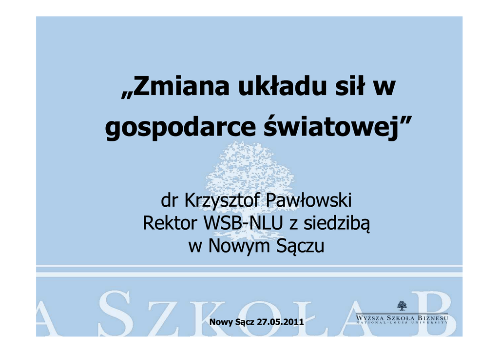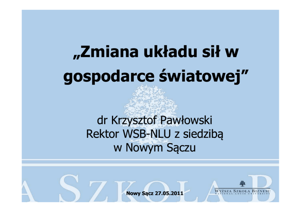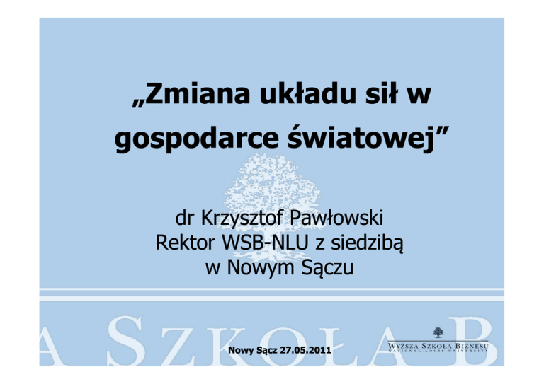 „Zmiana układu sił w gospodarce światowej” dr Krzysztof Pawł Pawłowski Rektor WSB WSB--NLU z siedzibą w Nowym S Są ączu Nowy Sącz 27.05.2011 Początek zmian 4.06.1989 • Masakra na placu Tiananmen w Pekinie • Wybory w Polsce w tym wolne wybory do Senatu Symboliczny koniec XX wieku z bardzo silnym wpływem na politykę międzynarodową państw komunistycznych (Związek Sowiecki, Chiny, Kuba) 2 W efekcie: • Rozpad Związku Sowieckiego i dziesięcioletnia „smuta” Rosji • Połączenie państw niemieckich • Odzyskanie niepodległości przez grupę państw obozu socjalistycznego i republik ZSRR • Rozpoczęcie procesu uwalniania gospodarki Chin – zwrot w stronę kapitalizmu 3 Silny rozwój procesów globalizacyjnych i przyspieszenie zmian, wzrost znaczenia korporacji międzynarodowych. 4 Na początku lat 90 –tych USA były hegemonem polityki światowej, pod względem politycznym, gospodarczym, militarnym. 5 Atak Al-Kaidy 11.09.2001 i skutki polityczne • Wojna w Iraku • Wojna w Afganistanie 6 Kryzys finansowy 2008 roku i jego wpływ na gospodarkę światową • Zadłużenie USA wzrosło do 100% budżetu (14,2 bil USA) • Kryzys systemu bankowego Irlandia, W.Brytania…… 7 Kryzys finansów publicznych w państwach UE • Grecja, Irlandia, Portugalia….(PIGS), Hiszpania, Włochy….może Europa otrzeźwieje Może wreszcie europejczycy przestaną grabić swoje dzieci i wnuki. 8 Stan dzisiejszy gospodarki światowej i przyszłe perspektywy: USA Chiny Japonia Europa BRIC 9 Chiny • Powrót do starożytnej i średniowiecznej pozycji gospodarczej • Bogate państwo i biedni ludzie • Ogromny potencjał i wielkie zagrożenia • Przyszłe problemy demograficzne 10 Czy USA pozostało hegemonem czy „tylko” supermocarstwem? • Wciąż wyższa innowacyjność amerykańskiej gospodarki • Zdrowa sytuacja demograficzna • Dominujące siły zbrojne • Pozycja amerykańskich koncernów 11 • W roku 2000 świat wydawał się uporządkowany (względnie) i przewidywany • W roku 2011 okazało się że P. Drucker miał rację „żyjemy w czasach burzliwych” 12