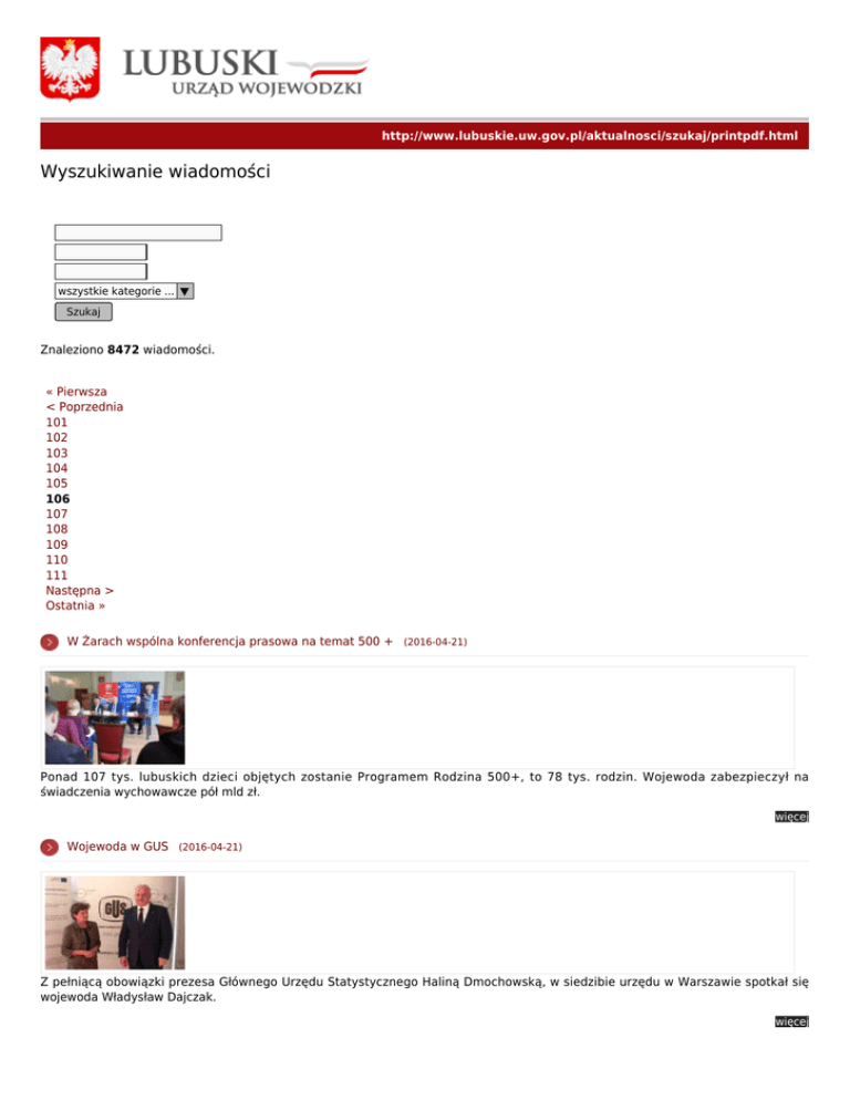 http://www.lubuskie.uw.gov.pl/aktualnosci/szukaj/printpdf.html Wyszukiwanie wiadomości wszystkie kategorie ... ▼ Szukaj Znaleziono 8472 wiadomości. « Pierwsza < Poprzednia 101 102 103 104 105 106 107 108 109 110 111 Następna > Ostatnia » W Żarach wspólna konferencja prasowa na temat 500 + (2016-04-21) Ponad 107 tys. lubuskich dzieci objętych zostanie Programem Rodzina 500+, to 78 tys. rodzin. Wojewoda zabezpieczył na świadczenia wychowawcze pół mld zł. więcej Wojewoda w GUS (2016-04-21) Z pełniącą obowiązki prezesa Głównego Urzędu Statystycznego Haliną Dmochowską, w siedzibie urzędu w Warszawie spotkał się wojewoda Władysław Dajczak. więcej 18-24 Kwietnia - Tydzień dla serca (2016-04-21) Celem obchodzonego Tygodnia dla Serca jest profilaktyka chorób serca, promowanie zdrowego stylu życia oraz odpowiedniej diety. więcej Dyrektorzy od bezpieczeństwa o współpracy transgranicznej (2016-04-20) Zwołane z inicjatywy szefa obrony cywilnej spotkanie dyrektorów wydziałów odpowiedzialnych za bezpieczeństwo z Urzędów Wojewódzkich z całego kraju miało miejsce w Gorzowie. więcej Lubuska firma wśród 21 nagrodzonych (2016-04-20) Solvay Engineering Plastics Poland Sp. z o.o. z Gorzowa Wlkp. otrzymała z rąk Prezydenta RP Andrzeja Dudy certyfikat w VIII edycji konkursu „Pracodawca Przyjazny Pracownikom”. więcej Lekcja patriotyzmu z wojewodą (2016-04-20) W ramach lekcji patriotyzmu, które organizowane są dla młodzieży w gorzowskiej Szkole Podstawowej nr 15, uczniowie klas szóstych spotkali się z wojewodą Władysławem Dajczakiem. Było to już drugie spotkanie wojewody z młodzieżą „piętnastki”, gdyż uczniowie gościli w Lubuskim Urzędzie Wojewódzkim w grudniu ubiegłego roku w ramach wspólnego kolędowania. więcej Wniosek o świadczenie 500+ jest darmowy (2016-04-20) Przypominamy, że wniosek o przyznanie świadczenia wychowawczego w ramach programu Rodzina 500+ jest darmowy. Za jego pobranie, złożenie nikt nie ma prawa pobierać żadnych opłat. więcej Odsłonięcie tablicy katyńskiej w Rokitnie (2016-04-20) Wojewoda Władysław Dajczak uczestniczył w Rokitnie w uroczystościach odsłonięcia tablicy poświęconej ofiarom zbrodni katyńskiej. więcej Środki na wypłatę 500+ są przekazywane na bieżąco (2016-04-20) Wojewoda Lubuski informuje, że środki na wypłatę świadczeń wychowawczych z programu Rodzina 500+ są przekazywane w kwotach i terminach zgłoszonych przez gminy. więcej Dobowy raport bezpieczeństwa w Lubuskiem. Raport za 19.04.2016r. (2016-04-20) Dobowy raport Wojewódzkiego Centrum Zarządzania Kryzysowego dotyczący działalności administracji zespolonej minionej doby (za 19.04.2016r.) więcej « Pierwsza < Poprzednia 101 102 103 104 105 106 107 108 109 110 111 Następna > Ostatnia »