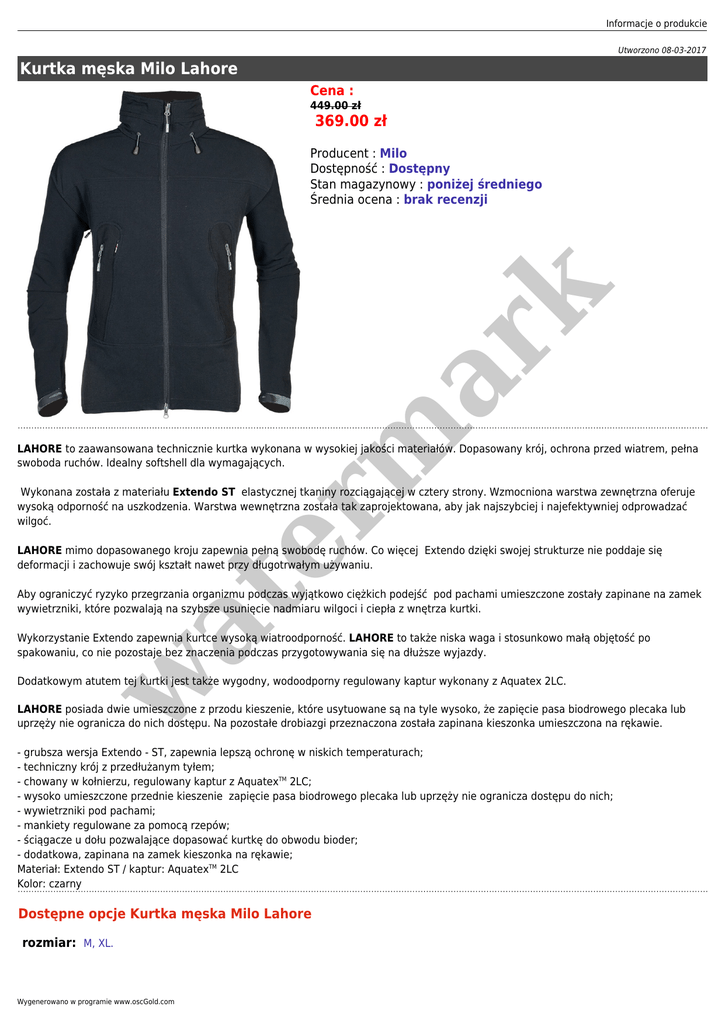 Informacje o produkcie Utworzono 08-03-2017 Kurtka męska Milo Lahore Cena : 449.00 zł 369.00 zł er m ar k Producent : Milo Dostępność : Dostępny Stan magazynowy : poniżej średniego Średnia ocena : brak recenzji LAHORE to zaawansowana technicznie kurtka wykonana w wysokiej jakości materiałów. Dopasowany krój, ochrona przed wiatrem, pełna swoboda ruchów. Idealny softshell dla wymagających. Wykonana została z materiału Extendo ST elastycznej tkaniny rozciągającej w cztery strony. Wzmocniona warstwa zewnętrzna oferuje wysoką odporność na uszkodzenia. Warstwa wewnętrzna została tak zaprojektowana, aby jak najszybciej i najefektywniej odprowadzać wilgoć. LAHORE mimo dopasowanego kroju zapewnia pełną swobodę ruchów. Co więcej Extendo dzięki swojej strukturze nie poddaje się deformacji i zachowuje swój kształt nawet przy długotrwałym używaniu. at Aby ograniczyć ryzyko przegrzania organizmu podczas wyjątkowo ciężkich podejść pod pachami umieszczone zostały zapinane na zamek wywietrzniki, które pozwalają na szybsze usunięcie nadmiaru wilgoci i ciepła z wnętrza kurtki. w Wykorzystanie Extendo zapewnia kurtce wysoką wiatroodporność. LAHORE to także niska waga i stosunkowo małą objętość po spakowaniu, co nie pozostaje bez znaczenia podczas przygotowywania się na dłuższe wyjazdy. Dodatkowym atutem tej kurtki jest także wygodny, wodoodporny regulowany kaptur wykonany z Aquatex 2LC. LAHORE posiada dwie umieszczone z przodu kieszenie, które usytuowane są na tyle wysoko, że zapięcie pasa biodrowego plecaka lub uprzęży nie ogranicza do nich dostępu. Na pozostałe drobiazgi przeznaczona została zapinana kieszonka umieszczona na rękawie. - grubsza wersja Extendo - ST, zapewnia lepszą ochronę w niskich temperaturach; - techniczny krój z przedłużanym tyłem; - chowany w kołnierzu, regulowany kaptur z AquatexTM 2LC; - wysoko umieszczone przednie kieszenie zapięcie pasa biodrowego plecaka lub uprzęży nie ogranicza dostępu do nich; - wywietrzniki pod pachami; - mankiety regulowane za pomocą rzepów; - ściągacze u dołu pozwalające dopasować kurtkę do obwodu bioder; - dodatkowa, zapinana na zamek kieszonka na rękawie; Materiał: Extendo ST / kaptur: AquatexTM 2LC Kolor: czarny Dostępne opcje Kurtka męska Milo Lahore rozmiar: M, XL. Wygenerowano w programie www.oscGold.com