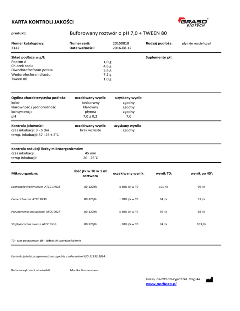 KARTA KONTROLI JAKOŚCI produkt: Buforowany roztwór o pH 7,0 + TWEEN 80 Numer katalogowy: 3142 Numer serii: Data ważności: Skład podłoża w g/l: Pepton A Chlorek sodu Diwodorofosforan potasu Wodorofosforan disodu Tween 80 20150818 2016-08-12 Rodzaj podłoża: płyn do rozcieńczeń Suplementy g/l: 1,0 g 4,6 g 3,6 g 7,2 g 1.0 g Ogólna charakterystyka podłoża: kolor klarowność / jednorodność konsystencja pH oczekiwany wynik: bezbarwny klarowny płynna 7,0 ± 0,2 Kontrola jałowości: czas inkubacji: 3 - 5 dni temp. inkubacji: 37 i 25 ± 2˚C oczekiwany wynik: brak wzrostu uzyskany wynik: zgodny zgodny zgodny 7,0 uzyskany wynik: zgodny Kontrola redukcji liczby mikroorganizmów: czas inkubacji: 45 min temp inkubacji: 20 - 25˚C Ilość jtk w T0 w 1 ml roztworu oczekiwany wynik: wynik T0: wynik po 45': Salmonella typhimurium ATCC 14028 80-120jtk ± 30% jtk w T0 101 jtk 99 jtk Escherichia coli ATCC 8739 80-120jtk ± 30% jtk w T0 94 jtk 91 jtk Pseudomonas aeruginosa ATCC 9027 80-120jtk ± 30% jtk w T0 96 jtk 88 jtk Staphylococcus aureus ATCC 6538 80-120jtk ± 30% jtk w T0 94 jtk 103 jtk Mikroorganizm: T0 - czas początkowy, jtk - jednostki tworzące kolonie Kontrola jakości przeprowadzona zgodnie z zaleceniami ISO 11133:2014. Badania wykonał i zatwierdził: Monika Zimmermann Graso, 83-200 Starogard Gd, Krąg 4a www.podloza.pl
