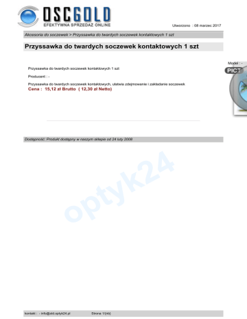 Utworzono : 08 marzec 2017 Akcesoria do soczewek > Przyssawka do twardych soczewek kontaktowych 1 szt Przyssawka do twardych soczewek kontaktowych 1 szt Model : Przyssawka do twardych soczewek kontaktowych 1 szt Producent : Przyssawka do twardych soczewek kontaktowych, ułatwia zdejmowanie i zakładanie soczewek Cena : 15,12 zł Brutto ( 12,30 zł Netto) Dostępność: Produkt dostępny w naszym sklepie od 24 luty 2008 4 2 k y t p o kontakt : - [email protected] Strona 1/{nb}