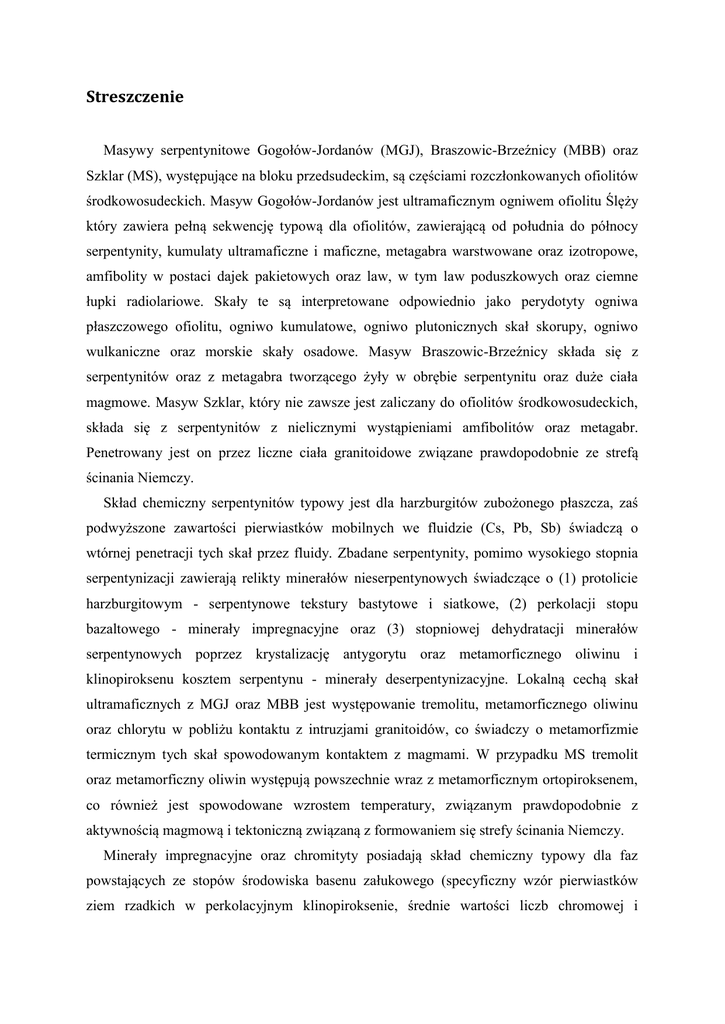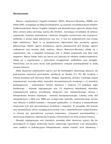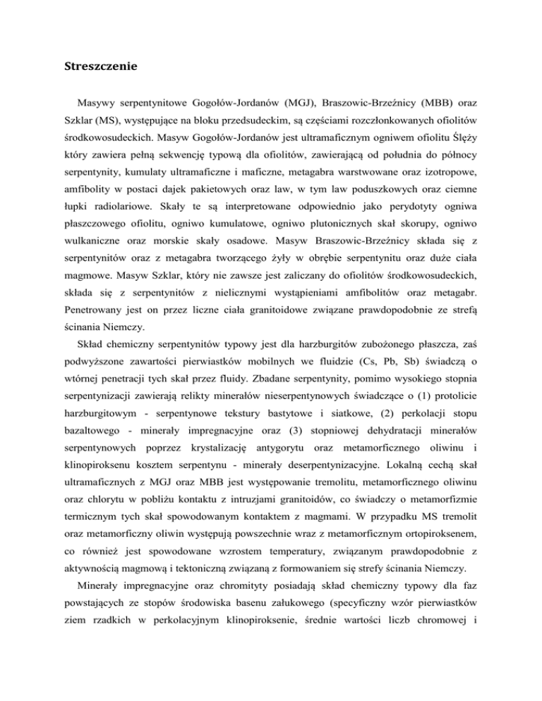 Streszczenie Masywy serpentynitowe Gogołów-Jordanów (MGJ), Braszowic-Brzeźnicy (MBB) oraz Szklar (MS), występujące na bloku przedsudeckim, są częściami rozczłonkowanych ofiolitów środkowosudeckich. Masyw Gogołów-Jordanów jest ultramaficznym ogniwem ofiolitu Ślęży który zawiera pełną sekwencję typową dla ofiolitów, zawierającą od południa do północy serpentynity, kumulaty ultramaficzne i maficzne, metagabra warstwowane oraz izotropowe, amfibolity w postaci dajek pakietowych oraz law, w tym law poduszkowych oraz ciemne łupki radiolariowe. Skały te są interpretowane odpowiednio jako perydotyty ogniwa płaszczowego ofiolitu, ogniwo kumulatowe, ogniwo plutonicznych skał skorupy, ogniwo wulkaniczne oraz morskie skały osadowe. Masyw Braszowic-Brzeźnicy składa się z serpentynitów oraz z metagabra tworzącego żyły w obrębie serpentynitu oraz duże ciała magmowe. Masyw Szklar, który nie zawsze jest zaliczany do ofiolitów środkowosudeckich, składa się z serpentynitów z nielicznymi wystąpieniami amfibolitów oraz metagabr. Penetrowany jest on przez liczne ciała granitoidowe związane prawdopodobnie ze strefą ścinania Niemczy. Skład chemiczny serpentynitów typowy jest dla harzburgitów zubożonego płaszcza, zaś podwyższone zawartości pierwiastków mobilnych we fluidzie (Cs, Pb, Sb) świadczą o wtórnej penetracji tych skał przez fluidy. Zbadane serpentynity, pomimo wysokiego stopnia serpentynizacji zawierają relikty minerałów nieserpentynowych świadczące o (1) protolicie harzburgitowym - serpentynowe tekstury bastytowe i siatkowe, (2) perkolacji stopu bazaltowego - minerały impregnacyjne oraz (3) stopniowej dehydratacji minerałów serpentynowych poprzez krystalizację antygorytu oraz metamorficznego oliwinu i klinopiroksenu kosztem serpentynu - minerały deserpentynizacyjne. Lokalną cechą skał ultramaficznych z MGJ oraz MBB jest występowanie tremolitu, metamorficznego oliwinu oraz chlorytu w pobliżu kontaktu z intruzjami granitoidów, co świadczy o metamorfizmie termicznym tych skał spowodowanym kontaktem z magmami. W przypadku MS tremolit oraz metamorficzny oliwin występują powszechnie wraz z metamorficznym ortopiroksenem, co również jest spowodowane wzrostem temperatury, związanym prawdopodobnie z aktywnością magmową i tektoniczną związaną z formowaniem się strefy ścinania Niemczy. Minerały impregnacyjne oraz chromityty posiadają skład chemiczny typowy dla faz powstających ze stopów środowiska basenu załukowego (specyficzny wzór pierwiastków ziem rzadkich w perkolacyjnym klinopiroksenie, średnie wartości liczb chromowej i magnezowej w chromicie, niskie zawartości platynowców oraz specyficzny skład pierwiastków śladowych w chromitycie), zatem perydotyty będące protolitem serpentynitów uformowane zostały w środowisku basenu załukowego. Tekstury serpentynitów oraz występujące w nich minerały deserpentynizacyjne wskazują na na następujące ich przemiany: (1) serpentynizacja niskotemperaturowa w warunkach metamorfizmu dna morskiego, (2) rekrystalizacja antygorytowa, (3) deserpentynizacja, (4) serpentynizacja antygorytowa. Serpentynizacja antygorytowa świadczy o tym, że progresywny metamorfizm serpentynitów był następnie zastąpiony przez metamorfizm retrogresywny. Niskie ciśnienia i temperatury metamorfizmu zbadanych serpentynitów sugerują, że miał on miejsce po włączeniu tych skał w tworzący się orogen.