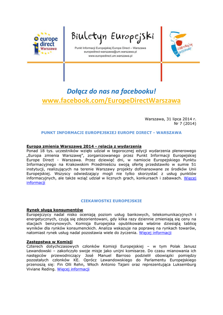 Dołącz do nas na facebooku! www.facebook.com/EuropeDirectWarszawa Warszawa, 31 lipca 2014 r. Nr 7 (2014) PUNKT INFORMACJI EUROPEJSKIEJ EUROPE DIRECT - WARSZAWA Europa zmienia Warszawę 2014 - relacja z wydarzenia Ponad 18 tys. uczestników wzięło udział w tegorocznej edycji wydarzenia plenerowego „Europa zmienia Warszawę”, zorganizowanego przez Punkt Informacji Europejskiej Europe Direct - Warszawa. Przez dziewięć dni, w namiocie Europejskiego Punktu Informacyjnego na Krakowskim Przedmieściu swoją ofertę przedstawiło w sumie 51 instytucji, realizujących na terenie Warszawy projekty dofinansowane ze środków Unii Europejskiej. Wszyscy odwiedzający mogli nie tylko skorzystać z usług punktów informacyjnych, ale także wziąć udział w licznych grach, konkursach i zabawach. Więcej informacji CIEKAWOSTKI EUROPEJSKIE Rynek sługą konsumentów Europejczycy nadal nisko oceniają poziom usług bankowych, telekomunikacyjnych i energetycznych, czują się zdezorientowani, gdy kilka razy dziennie zmieniają się ceny na stacjach benzynowych. Komisja Europejska opublikowała właśnie dziesiątą tablicę wyników dla rynków konsumenckich. Analiza wskazuje na poprawę na rynkach towarów, natomiast rynek usług nadal pozostawia wiele do życzenia. Więcej informacji Zastępstwa w Komisji Czterech dotychczasowych członków Komisji Europejskiej – w tym Polak Janusz Lewandowski – zakończyło swoje misje jako unijni komisarze. Do czasu mianowania ich następców przewodniczący José Manuel Barroso podzielił obowiązki pomiędzy pozostałych członków KE. Oprócz Lewandowskiego do Parlamentu Europejskiego przenoszą się: Fin Olli Rehn, Włoch Antonio Tajani oraz reprezentująca Luksemburg Viviane Reding. Więcej informacji Nowe budynki a środowisko Komisja Europejska przyjęła nowe wnioski ustawodawcze, które mają na celu zmniejszenie oddziaływania nowych i odnawianych budynków na środowisko. Stanie się tak dzięki efektywniejszemu wykorzystaniu zasobów i poprawie dostępności informacji na temat tego, jak nowe technologie oddziałują na środowisko. Więcej informacji Którą uczelnię wybrać? Działa już nowy rejestr europejskiego szkolnictwa wyższego (ETER). Zapewnia on łatwy dostęp do informacji na temat uniwersytetów w 36 państwach, w tym we wszystkich państwach członkowskich UE. W jednym miejscu udostępnione są informacje o ponad dwóch tysiącach instytucji, w których uczy się ponad 16 mln studentów. Sprawdzić można wielkość uczelni, liczbę studentów i wykładowców, wybór przedmiotów czy informacje o działalności badawczej oraz międzynarodowej. Więcej informacji Więcej recyklingu w UE Unijna gospodarka stanie się bardziej ekologiczna, a znaczenie recyklingu będzie wzrastać – Komisja Europejska uchwaliła wnioski, które pomogą w osiągnięciu tych celów. Zmiany dotyczące gospodarki odpadami pozwolą też stworzyć 580 tys. nowych miejsc pracy, zmniejszyć zapotrzebowanie na trudno dostępne zasoby i zwiększyć konkurencyjność Unii. Więcej informacji Ważne prawa konsumentów Ścisłe egzekwowanie praw konsumentów to korzyść także dla przedsiębiorstw – mówił w Rzymie komisarz ds. polityki konsumenckiej Neven Mimica. Przedstawiając swoje poglądy, zwrócił uwagę na to, że Komisja Europejska musi stworzyć ramy, które pozwolą zwalczyć powszechne naruszenia, które występują jednocześnie w kilku, a nawet we wszystkich państwach UE. Zmiany przełożą się na większą przejrzystość na rynku, wzmocnią konkurencję i zrównają szanse przedsiębiorców. Więcej informacji Partnerstwo dla innowacji Nowe metody leczenia cukrzycy i chorób oczu, uruchomienie produkcji pojazdów napędzanych wodorem – to tylko niektóre projekty, które powstaną dzięki partnerstwu badań naukowych między UE, sektorem prywatnym i państwami członkowskimi w ramach programu „Horyzont 2020”. Pierwsza runda finansowania zostanie przeznaczona na projekty, które podniosą poziom życia ludzi i zwiększą konkurencyjność europejskiego przemysłu. Więcej informacji Jednolita przestrzeń powietrzna Polska znalazła się wśród osiemnastu państw, które Komisja Europejska wezwała do usprawnienia swoich funkcjonalnych bloków przestrzeni powietrznej (FAB). Takie bloki odgrywają główną rolę w tworzeniu efektywniejszego, mniej kosztownego i mniej zanieczyszczającego systemu lotnictwa w Europie. Więcej informacji Miliard dla Warszawy Miliard złotych (240 mln euro) kredytu otrzyma Warszawa na modernizację infrastruktury od Europejskiego Banku Centralnego. Długoterminowa pożyczka banku Unii Europejskiej wesprze szeroki program inwestycyjny stolicy realizowany w latach 2014-2019, który zawiera projekty dotyczące transportu, edukacji, ochrony zdrowia, opieki społecznej, ale i przestrzeni publicznych i parków. Więcej informacji Hazard mniej szkodliwy Informacje o zagrożeniach wynikających z hazardu, uniemożliwienie dostępu osób nieletnich do stron internetowych z grami hazardowymi, proces rejestracji przed przystąpieniem do gry on-line – to główne zasady, jakie Komisja Europejska zaleca państwom członkowskim w sprawie internetowych usług hazardowych. Celem działań jest ochrona zdrowia graczy i minimalizowanie szkód gospodarczych spowodowanych uzależnieniem od gier. Więcej informacji Europosłowie za Junckerem Jean-Claude Juncker uzyskał poparcie Parlamentu Europejskiego jako przewodniczący nowej Komisji Europejskiej. Za kandydaturą byłego premiera Luksemburga opowiedziało się 422 eurodeputowanych, podczas gdy wymagana większość wnosiła 376 głosów. Przed głosowaniem Juncker zaprezentował dokument programowy "Nowy początek dla Europy: Mój program na rzecz zatrudnienia, wzrostu, sprawiedliwości oraz zmian demokratycznych". Więcej informacji Zdrowsze szkolne posiłki Posiłki oferowane w europejskich szkołach są coraz zdrowsze, a jadłospisy lepiej skomponowane. Dzieci m