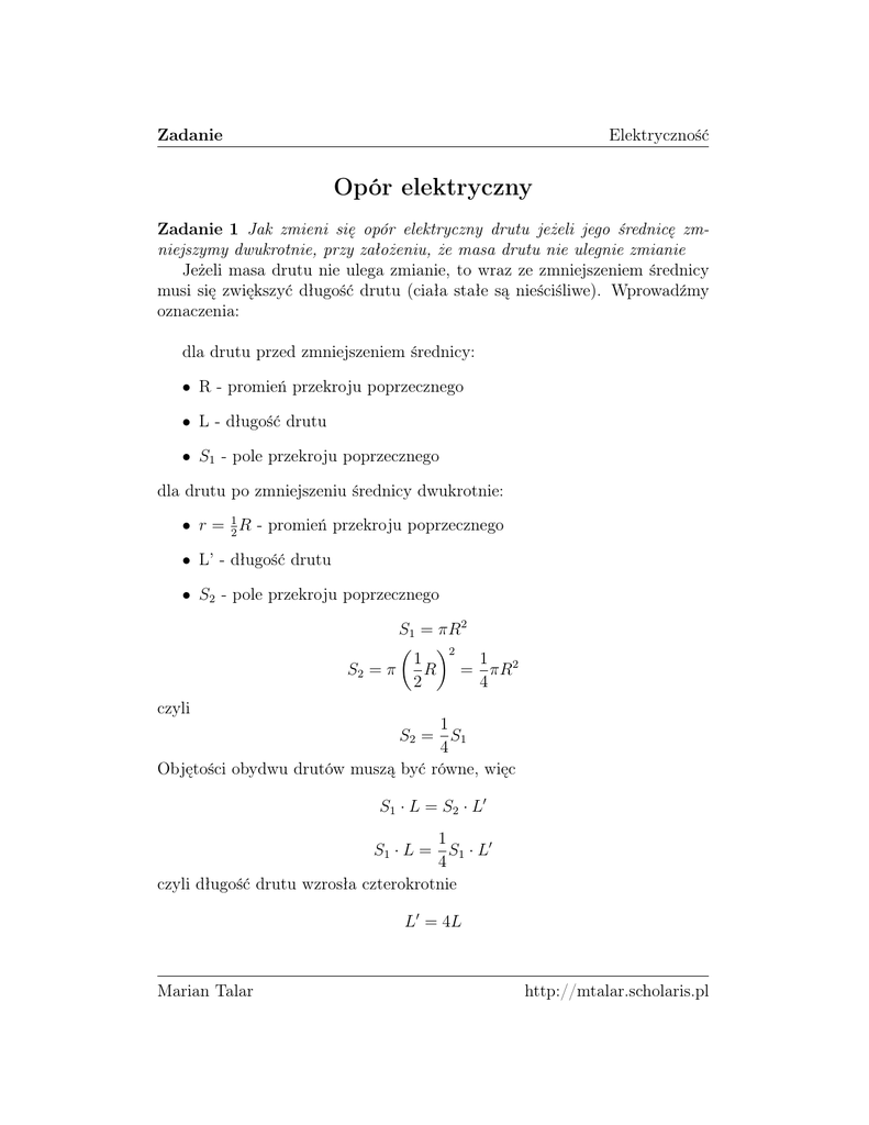 Zadanie Elektryczność Opór elektryczny Zadanie 1 Jak zmieni się opór elektryczny drutu jeżeli jego średnicę zmniejszymy dwukrotnie, przy założeniu, że masa drutu nie ulegnie zmianie Jeżeli masa drutu nie ulega zmianie, to wraz ze zmniejszeniem średnicy musi się zwiększyć długość drutu (ciała stałe są nieściśliwe). Wprowadźmy oznaczenia: dla drutu przed zmniejszeniem średnicy: • R - promień przekroju poprzecznego • L - długość drutu • S1 - pole przekroju poprzecznego dla drutu po zmniejszeniu średnicy dwukrotnie: • r = 21 R - promień przekroju poprzecznego • L’ - długość drutu • S2 - pole przekroju poprzecznego S1 = πR2 2 1 1 R = πR2 S2 = π 2 4 czyli 1 S2 = S1 4 Objętości obydwu drutów muszą być równe, więc S1 · L = S 2 · L 0 1 S1 · L = S 1 · L 0 4 czyli długość drutu wzrosła czterokrotnie L0 = 4L Marian Talar http://mtalar.scholaris.pl Zadanie Elektryczność Ostatecznie opór R1 drutu grubszego wynosi R1 = ρ L S1 oraz drutu cieńszego L0 4L L =ρ = 16ρ = 16R1 1 S2 S1 S1 4 Odpowiedź: opór drutu wzrośnie 16-krotnie R2 = ρ Opór zastępczy Zadanie 2 Oblicz opór zastępczy układu oporników przedstawionego na rysunku. Najpierw przedstawiamy połączenie oporników w bardziej poglądowy sposób. Można to zrobić w dwóch etapach, tak jak to przedstawiono na rysunkach. Jak widać oporniki są połączone równolegle. Stąd już łatwo obliczyć opór zastępczy. Marian Talar http://mtalar.scholaris.pl
