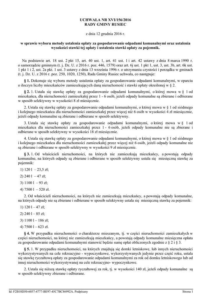 UCHWAŁA NR XVI/156/2016 RADY GMINY RUSIEC z dnia 12 grudnia 2016 r. w sprawie wyboru metody ustalenia opłaty za gospodarowanie odpadami komunalnymi oraz ustalenia wysokości stawki tej opłaty i ustalenia stawki opłaty za pojemnik. Na podstawie art. 18 ust. 2 pkt 15, art. 40 ust. 1, art. 41 ust. 1 i art. 42 ustawy z dnia 8 marca 1990 r. o samorządzie gminnym (t. j. Dz. U. z 2016 r. poz. 446, 1579) oraz art. 6j ust. 1 pkt 1, ust. 3, ust. 3b, art. 6k ust. 1 pkt 1 i 2, ust. 2a pkt. 1 ust. 3 ustawy z dnia 13 września 1996 r. o utrzymaniu czystości i porządku w gminach (t. j. Dz. U. z 2016 r. poz. 250, 1020, 1250), Rada Gminy Rusiec uchwala, co następuje: § 1. Dokonuje się wyboru metody ustalenia opłaty za gospodarowanie odpadami komunalnymi, w oparciu o iloczyn liczby mieszkańców zamieszkujących daną nieruchomość i stawki opłaty określonej w § 2. § 2. 1. Ustala się stawkę opłaty za gospodarowanie odpadami komunalnymi, o której mowa w § 1 od mieszkańca, dla nieruchomości zamieszkałej przez 1 - 6 osób, jeżeli odpady komunalne są zbierane i odbierane w sposób selektywny w wysokości 8 zł miesięcznie. 2. Ustala się stawkę opłaty za gospodarowanie odpadami komunalnymi, o której mowa w § 1 od siódmego i kolejnego mieszkańca dla nieruchomości zamieszkałej przez więcej niż 6 osób w wysokości 4 zł miesięcznie, jeżeli odpady komunalne są zbierane i odbierane w sposób selektywny. 3. Ustala się stawkę opłaty za gospodarowanie odpadami komunalnymi, o której mowa w § 1 od mieszkańca dla nieruchomości zamieszkałej przez 1 - 6 osób, jeżeli odpady komunalne nie są zbierane i odbierane w sposób selektywny w wysokości 18 zł miesięcznie. 4. Ustala się stawkę opłaty za gospodarowanie odpadami komunalnymi, o której mowa w § 1 od siódmego i kolejnego mieszkańca dla nieruchomości zamieszkałej przez więcej niż 6 osób, jeżeli odpady komunalne nie są zbierane i odbierane w sposób selektywny w wysokości 9 zł miesięcznie. § 3. 1. Od właścicieli nieruchomości, na których nie zamieszkują mieszkańcy, a powstają odpady komunalne, na których odpady są zbierane i odbierane w sposób selektywny ustala się miesięczną stawkę za pojemnik: 1) 120 l – 23,5 zł; 2) 240 l – 47 zł; 3) 1100 l – 93 zł; 4) 7500 l – 520 zł. 2. Od właścicieli nieruchomości, na których nie zamieszkują mieszkańcy, a powstają odpady komunalne, na których odpady nie są zbierane i odbierane w sposób selektywny ustala się miesięczną stawkę za pojemnik: 1) 120 l – 47 zł; 2) 240 l – 85 zł; 3) 1100 l – 186 zł; 4) 7500 l – 623 zł. § 4. W przypadku nieruchomości o charakterze mieszanym, tj. w części nieruchomości zamieszkałych w części nieruchomości, na której nie zamieszkują mieszkańcy, a powstają odpady komunalne miesięczna opłata za gospodarowanie odpadami komunalnymi stanowić będzie sumę opłat obliczonych zgodnie z § 2 i § 3. § 5. 1. W przypadku nieruchomości, na których znajdują się domki letniskowe, lub innych nieruchomości wykorzystywanych na cele rekreacyjno - wypoczynkowe, wykorzystywanych jedynie przez część roku, ustala się stawkę ryczałtową opłaty za gospodarowanie odpadami komunalnymi za rok od domku letniskowego lub od innej nieruchomości wykorzystywanej na cele rekreacyjno- wypoczynkowe. 2. Ustala się niższą stawkę opłaty ryczałtowej za rok, tj. w wysokości 140 zł, jeżeli odpady komunalne są w sposób selektywny zbierane i odbierane. Id: F2B18D50-6057-4777-BE97-45C7BC86992A. Podpisany Strona 1 3. Ustala się wyższą stawkę opłaty ryczałtowej za rok, tj. w wysokości 281 zł, jeżeli odpady komunalne nie są w sposób selektywny zbierane i odbierane. § 6. Traci moc uchwała nr IV/32/2015 Rady Gminy Rusiec z dnia 3 marca 2015 r. w sprawie wyboru metody ustalenia opłaty za gospodarowanie odpadami komunalnymi oraz ustalenia wysokości stawki tej opłaty i ustalenia stawki opłaty za pojemnik. § 7. Wykonanie uchwały powierza się Wójtowi Gminy Rusiec. § 8. Uchwała wchodzi w życie po upływie 14 dni od dnia ogłoszenia w Dzienniku Urzędowym Województwa Łódzkiego, z mocą obowiązującą od 1 stycznia 2017 r. Przewodniczący Rady Gminy Rusiec Bartłomiej Bieniek Id: F2B18D50-6057-4777-BE97-45C7BC86992A. Podpisany Strona 2