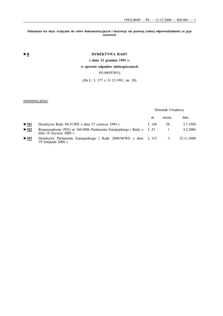 1991L0689 — PL — 12.12.2008 — 003.001 — 1 Dokument ten służy wyłącznie do celów dokumentacyjnych i instytucje nie ponoszą żadnej odpowiedzialności za jego zawartość ►B DYREKTYWA RADY z dnia 12 grudnia 1991 r. w sprawie odpadów niebezpiecznych (91/689/EWG) (Dz.U. L 377 z 31.12.1991, str. 20) zmieniona przez: Dziennik Urzędowy ►M1 ►M2 ►M3 Dyrektywa Rady 94/31/WE z dnia 27 czerwca 1994 r. Rozporządzenie (WE) nr 166/2006 Parlamentu Europejskiego i Rady z dnia 18 stycznia 2006 r. Dyrektywa Parlamentu Europejskiego i Rady 2008/98/WE z dnia 19 listopada 2008 r. nr strona data L 168 L 33 28 1 2.7.1994 4.2.2006 L 312 3 22.11.2008 1991L0689 — PL — 12.12.2008 — 003.001 — 2 ▼B DYREKTYWA RADY z dnia 12 grudnia 1991 r. w sprawie odpadów niebezpiecznych (91/689/EWG) RADA WSPÓLNOT EUROPEJSKICH, uwzględniając Traktat ustanawiający Europejską Wspólnotę Gospodarczą, w szczególności jego art. 130s, uwzględniając wniosek Komisji (1), uwzględniając opinię Parlamentu Europejskiego (2), uwzględniając opinię Komitetu Ekonomiczno-Społecznego (3), a także mając na uwadze, co następuje: dyrektywa Rady 78/319/EWG z dnia 20 marca 1978 r. w sprawie odpadów toksycznych i niebezpiecznych (4) ustanowiła zasady wspólnotowe w sprawie unieszkodliwiania odpadów niebezpiecznych; w celu uwzględnienia doświadczenia zyskanego przy wykonywaniu tej dyrektywy przez Państwa Członkowskie konieczna jest zmiana zasad i zastąpienie dyrektywy 78/319/EWG niniejszą dyrektywą; rezolucja Rady z dnia 7 maja 1990 r. w sprawie polityki gospodarowania odpadami (5) i program działań Wspólnot Europejskich w zakresie środowiska, który był przedmiotem rezolucji Rady Wspólnot Europejskich i przedstawicieli rządów Państw Członkowskich zebranych w Radzie z dnia 19 października 1987 r. w sprawie kontynuacji i wprowadzania w życie polityki i programu działań Wspólnoty Europejskiej w zakresie środowiska (na lata 1987—1992) (6) przewidują środki wspólnotowe mające na celu poprawę warunków, w jakich odpady niebezpieczne są unieszkodliwiane i zagospodarowywane; ogólne zasady stosujące się do gospodarowania odpadami, które są przewidziane w dyrektywie Rady 75/442/EWG z dnia 15 lipca 1975 r. w sprawie odpadów (7), zmienionej dyrektywą Rady 91/156/EWG (8), także znajdują zastosowanie do gospodarowania odpadami niebezpiecznymi; prawidłowe gospodarowanie odpadami niebezpiecznymi wymaga dodatkowych, bardziej rygorystycznych zasad, aby uwzględnić szczególny charakter takich odpadów; konieczne jest, w celu poprawy skuteczności gospodarowania odpadami niebezpiecznymi we Wspólnocie, używanie precyzyjnej i jednolitej definicji odpadów niebezpiecznych, opartej na doświadczeniu; konieczne jest zapewnienie, by unieszkodliwianie i odzysk odpadów niebezpiecznych były kontrolowane w możliwie najpełniejszy sposób; dostosowanie przepisów niniejszej dyrektywy do postępu naukowego i technicznego musi nastąpić możliwie szybko; Komitet ustanowiony dyrektywą 75/442/EWG musi być także upoważniony do dostosowania przepisów niniejszej dyrektywy do takiego postępu, PRZYJMUJE NINIEJSZĄ DYREKTYWĘ: (1) (2) (3) (4) (5) (6) (7) (8) Dz.U. Dz.U. Dz.U. Dz.U. Dz.U. Dz.U. Dz.U. Dz.U. C 295 z 19.11.1988, str. 8 oraz Dz.U. C 42 z 22.2.1990, str. 19. C 158 z 26.6.1989, str. 238. C 56 z 6.3.1989, str. 2. L 84 z 31.3.1978, str. 43. C 122 z 18.5.1990, str. 2. C 328 z 7.12.1987, str. 1. L 194 z 25.7.1975, str. 39. L 78 z 26.3.1991, str. 32. 1991L0689 — PL — 12.12.2008 — 003.001 — 3 ▼B Artykuł 1 1. Celem niniejszej dyrektywy, przyjętej na mocy art. 2 ust. 2 dyrektywy 75/442/EWG, jest zbliżenie ustawodawstw Państw Członkowskich w sprawie kontrolowanego gospodarowania odpadami niebezpiecznymi. 2. Z zastrzeżeniem przepisów niniejszej dyrektywy, dyrektywa 75/442/EWG stosuje się do odpadów niebezpiecznych. 3. Definicja „odpadów” i inne terminy użyte w niniejszej dyrektywie są definicjami z dyrektywy 75/442/EWG. ▼M3 4. Do celów niniejszej dyrektywy „odpady niebezpieczne” oznaczają: — odpady zaklasyfikowane jako odpady niebezpieczne zawarte w wykazie ustanowionym decyzją Komisji 2000/532/WE (1) na podstawie załącznika I i II do niniejszej dyrektywy. Odpady te muszą mieć co najmniej jedną z właściwości wymienionych w załączniku III. W wykazie tym uwzględnia się pochodzenie i skład odpadów oraz, w razie potrzeby, dopuszczalne wartości stężenia. Wykaz ten jest poddawany okresowemu przeglądowi i, w razie konieczności, zmieniany. Środki te mające na celu zmianę elementów innych niż istotne niniejszej dyrektywy, poprzez jej uzupełnienie, przyjmuje się zgodnie z procedurą regulacyjną połączoną z kontrolą, o której mowa w art. 18 ust. 4 dyrektywy 2006/12/WE Parlamentu Europejskiego i Rady z dnia 5 kwietnia 2006 r. w sprawie odpadów (2). — wszelkie inne odpady, uznawane przez państwo członkowskie za wykazujące którąkolwiek z właściwości wymienionych w załączniku III. Takie przypadki należy zgłaszać Komisji i wprowadzać zmiany w celu dostosowania wykazu. Środki te mające na celu zmianę elementów innych niż istotne niniejszej dyrektywy, poprzez jej uzupełnienie, przyjmuje się zgodnie z procedurą regulacyjną połączoną z kontrolą, o której mowa w art. 18 ust. 4 dyrektywy 2006/12/WE. ▼B 5. Odpady z gospodarstw domowych są wyłączone z przepisów niniejszej dyrektywy. Rada ustanawia, na wniosek Komisji, szczegółowe zasady uwzględniające szczególny charakter odpadów z gospodarstw domowych nie później niż do końca 1992 r. Artykuł 2 1. Państwa Członkowskie podejmują konieczne działania w celu zapewnienia, aby odpady były rejestrowane i identyfikowane w każdym miejscu, gdzie odbywa się zwałowanie (zrzut) odpadów niebezpiecznych. 2. Państwa Członkowskie podejmują konieczne działania w celu zapewnienia, aby zakład lub przedsiębiorstwo, które unieszkodliwia, odzyskuje,