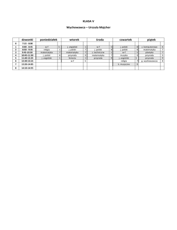KLASA V Wychowawca – Urszula Majcher dzwonki poniedziałek