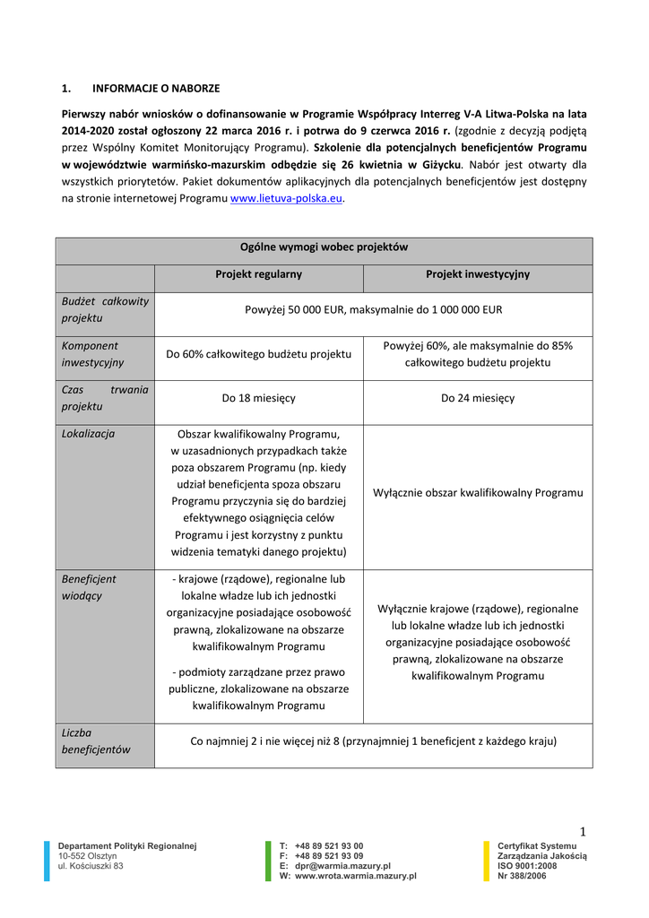 1. INFORMACJE O NABORZE Pierwszy nabór wniosków o dofinansowanie w Programie Współpracy Interreg V-A Litwa-Polska na lata 2014-2020 został ogłoszony 22 marca 2016 r. i potrwa do 9 czerwca 2016 r. (zgodnie z decyzją podjętą przez Wspólny Komitet Monitorujący Programu). Szkolenie dla potencjalnych beneficjentów Programu w województwie warmińsko-mazurskim odbędzie się 26 kwietnia w Giżycku. Nabór jest otwarty dla wszystkich priorytetów. Pakiet dokumentów aplikacyjnych dla potencjalnych beneficjentów jest dostępny na stronie internetowej Programu www.lietuva-polska.eu. Ogólne wymogi wobec projektów Projekt regularny Budżet całkowity projektu Komponent inwestycyjny Powyżej 50 000 EUR, maksymalnie do 1 000 000 EUR Do 60% całkowitego budżetu projektu Powyżej 60%, ale maksymalnie do 85% całkowitego budżetu projektu Do 18 miesięcy Do 24 miesięcy Obszar kwalifikowalny Programu, w uzasadnionych przypadkach także poza obszarem Programu (np. kiedy udział beneficjenta spoza obszaru Programu przyczynia się do bardziej efektywnego osiągnięcia celów Programu i jest korzystny z punktu widzenia tematyki danego projektu) Wyłącznie obszar kwalifikowalny Programu Czas trwania projektu Lokalizacja Beneficjent wiodący - krajowe (rządowe), regionalne lub lokalne władze lub ich jednostki organizacyjne posiadające osobowość prawną, zlokalizowane na obszarze kwalifikowalnym Programu - podmioty zarządzane przez prawo publiczne, zlokalizowane na obszarze kwalifikowalnym Programu Liczba beneficjentów Projekt inwestycyjny Wyłącznie krajowe (rządowe), regionalne lub lokalne władze lub ich jednostki organizacyjne posiadające osobowość prawną, zlokalizowane na obszarze kwalifikowalnym Programu Co najmniej 2 i nie więcej niż 8 (przynajmniej 1 beneficjent z każdego kraju) 1 Departament Polityki Regionalnej 10-552 Olsztyn ul. Kościuszki 83 T: F: E: W: +48 89 521 93 00 +48 89 521 93 09 [email protected] www.wrota.warmia.mazury.pl Certyfikat Systemu Zarządzania Jakością ISO 9001:2008 Nr 388/2006 2. OBSZAR Obszar Programu obejmuje jednostki terytorialne NUTS 3 – na Litwie obwody: mariampolski, olicki, tauroski, kowieński, wileński (bez miasta Wilna); w Polsce podregion: ełcki (powiaty ełcki, giżycki, gołdapski, olecki, piski oraz węgorzewski) oraz na podregiony suwalski i białostocki w województwie podlaskim. Po polskiej stronie granicy obszar kwalifikowany uległ zmniejszeniu w porównaniu do okresu 2007-2013 – wyłączono podregiony łomżyński i olsztyński. 3. BENEFICJENCI Katalog beneficjentów Programu obejmuje: • władze krajowe, regionalne i lokalne oraz ich jednostki organizacyjne posiadające osobowość prawną, • stowarzyszenia utworzone przez władze regionalne lub lokalne, • podmioty prawa publicznego, • stowarzyszenia utworzone przez podmioty prawa publicznego, • organizacje pozarządowe oraz inne podmioty posiadające osobowość prawną, nie mające charakteru przemysłowego ani komercyjnego. Przykładowi beneficjenci: JST (gminy, powiaty, miasta), publiczne szkoły i uniwersytety, urzędy pracy, centra informacji turystycznej, muzea, publiczne szpitale i instytucje medyczne, centra sportowe, centra kultury, euroregiony, fundacje itp. Przedsięwzięcia w ramach Programu muszą obejmować beneficjentów z obu krajów (każdy projekt musi być wdrażany przez co najmniej dwóch beneficjentów – jednego z Polski i jednego z Litwy, z których jeden będzie tzw. beneficjentem wiodącym). Ta sama instytucja może pełnić rolę beneficjenta wiodącego wyłącznie w jednym zatwierdzonym projekcie. 4. BUDŻET Łączny budżet Programu to 62 533 982 EUR, w tym wsparcie z Europejskiego Funduszu Rozwoju Regionalnego wynosi 53 153 883 EUR (85% budżetu), a wkład narodowy 9 380 099 EUR (15% budżetu). Nie określono wysokości alokacji przeznaczonej na dofinansowanie projektów w ramach I naboru. Poziom dofinansowania projektów z EFRR będzie wynosił do 85% kosztów kwalifikowanych (pozostałe 15% to wkład własny). Nie przewiduje się płatności zaliczkowych. Oś priorytetowa Alokacja w EUR Oś priorytetowa 1: Ochrona środowiska i promowanie efektywnego gospodarowania zasobami 20 010 873 Oś priorytetowa 2: Promowanie trwałego zatrudnienia o wysokiej jakości oraz wspieranie mobilności pracowników 14 539 151 Oś priorytetowa 3. Promowanie włączenia społecznego, walka z ubóstwem 9 692 768 2 Departament Polityki Regionalnej 10-552 Olsztyn ul. Kościuszki 83 T: F: E: W: +48 89 521 93 00 +48 89 521 93 09 [email protected] www.wrota.warmia.mazury.pl Certyfikat Systemu Zarządzania Jakością ISO 9001:2008 Nr 388/2006 i wszelką dyskryminacją Oś priorytetowa 4: Wzmacnianie zdolności instytucjonalnych instytucji publicznych oraz sprawna administracja publiczna 14 539 151 Oś priorytetowa 5: Pomoc Techniczna 3 752 039 5. PARTNERSTWO Każdy projekt musi zapewnić co najmniej 3 z 4 możliwych typów współpracy: • wspólne przygotowanie (obowiązkowe), • wspólna realizacja (obowiązkowa), • wspólny personel i/lub wspólne finansowanie (do wyboru). Przed złożeniem wniosku o dofinansowanie partnerzy muszą podpisać Porozumienie Partnerskie, (wzór dokumentu jest dostępny na stronie Programu), zawierające precyzyjnie rozdzielone zadania, funkcje, zakres odpowiedzialności oraz podział wskaźników. Porozumienie musi być załączone do formularza aplikacyjnego jako aneks. 3 Departament Polityki Regionalnej 10-552 Olsztyn ul. Kościuszki 83 T: F: E: W: +48 89 521 93 00 +48 89 521 93 09 [email protected] www.wrota.warmia.mazury.pl Certyfikat Systemu Zarządzania Jakością ISO 9001:2008 Nr 388/2006 6. ZAKRES WSPARCIA PROGRAMU Ogólnym celem Programu jest wspieranie inteligentnego, trwałego wzrostu gospodarczego sprzyjającego włączeniu społecznemu na obszarze przygranicznym poprzez współpracę transgraniczną. Oś priorytetowa Cel szczegółowy 1: Ochrona środowiska i 1.1: Zwiększenie promowanie efektywnego z