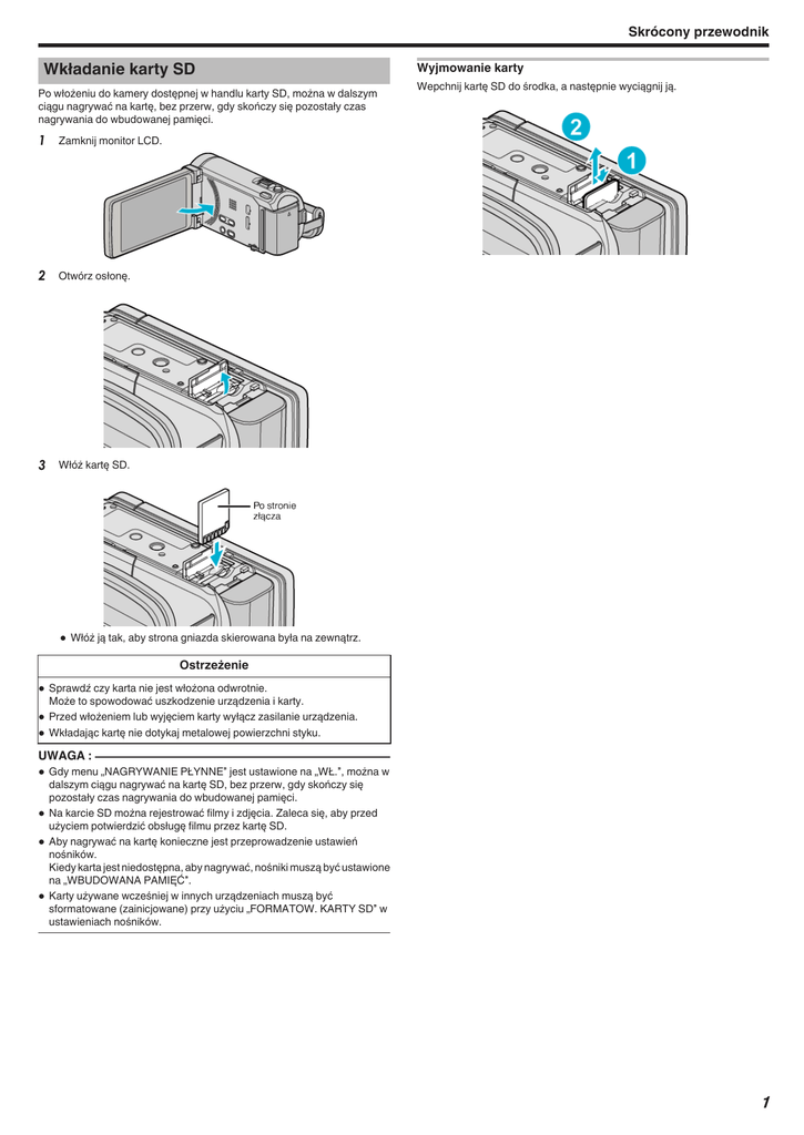 Skrócony przewodnik Wkładanie karty SD Po włożeniu do kamery dostępnej w handlu karty SD, można w dalszym ciągu nagrywać na kartę, bez przerw, gdy skończy się pozostały czas nagrywania do wbudowanej pamięci. Zamknij monitor LCD. 2 Otwórz osłonę. 3 Włóż kartę SD. Wepchnij kartę SD do środka, a następnie wyciągnij ją. . . . . 1 Wyjmowanie karty 0 Włóż ją tak, aby strona gniazda skierowana była na zewnątrz. Ostrzeżenie 0 0 0 Sprawdź czy karta nie jest włożona odwrotnie. Może to spowodować uszkodzenie urządzenia i karty. Przed włożeniem lub wyjęciem karty wyłącz zasilanie urządzenia. Wkładając kartę nie dotykaj metalowej powierzchni styku. UWAGA : 0 0 0 0 Gdy menu „NAGRYWANIE PŁYNNE” jest ustawione na „WŁ.”, można w dalszym ciągu nagrywać na kartę SD, bez przerw, gdy skończy się pozostały czas nagrywania do wbudowanej pamięci. Na karcie SD można rejestrować filmy i zdjęcia. Zaleca się, aby przed użyciem potwierdzić obsługę filmu przez kartę SD. Aby nagrywać na kartę konieczne jest przeprowadzenie ustawień nośników. Kiedy karta jest niedostępna, aby nagrywać, nośniki muszą być ustawione na „WBUDOWANA PAMIĘĆ”. Karty używane wcześniej w innych urządzeniach muszą być sformatowane (zainicjowane) przy użyciu „FORMATOW. KARTY SD” w ustawieniach nośników. 1