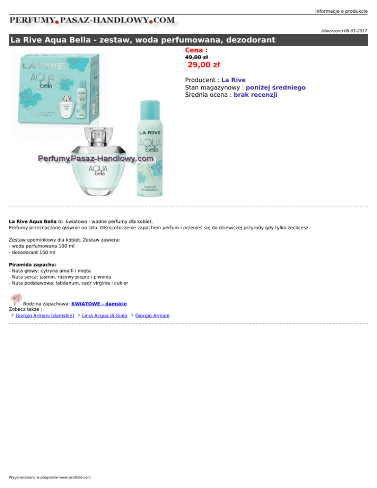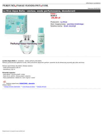 Informacje o produkcie Utworzono 08-03-2017 La Rive Aqua Bella - zestaw, woda perfumowana, dezodorant Cena : 49,00 zł 29,00 zł Producent : La Rive Stan magazynowy : poniżej średniego Średnia ocena : brak recenzji La Rive Aqua Bella to kwiatowo - wodne perfumy dla kobiet. Perfumy przeznaczone głównie na lato. Olśnij otoczenie zapachem perfum i przenieś się do dziewiczej przyrody gdy tylko zechcesz. Zestaw upominkowy dla kobiet. Zestaw zawiera: - woda perfumowana 100 ml - dezodorant 150 ml Piramida zapachu: - Nuta głowy: cytryna amalfi i mięta - Nuta serca: jaśmin, różowy pieprz i piwonia - Nuta podstawowa: labdanum, cedr virginia i cukier Rodzina zapachowa: KWIATOWE - damskie Zobacz także : Giorgio Armani [damskie] Linia Acqua di Gioia Wygenerowano w programie www.oscGold.com Giorgio Armani