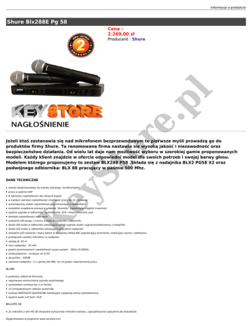 Informacje o produkcie Shure Blx288E Pg 58 Cena : 2.269,00 zł or e. pl Producent : Shure St Jeżeli ktoś zastanawia się nad mikrofonem bezprzewodowym to pierwsze myśli prowadzą go do produktów firmy Shure. Ta renomowana firma nastawia się wysoką jakość i niezawodność oraz bezpieczeństwo działania. Od wielu lat daje nam możliwość wyboru w szerokiej gamie proponowanych modeli. Każdy klient znajdzie w ofercie odpowiedni model dla swoich potrzeb i swojej barwy głosu. Modelem którego proponujemy to zestaw BLX288 P58 .Składa się z nadajnika BLX2 PG58 X2 oraz podwójnego odbiornika: BLX 88 pracujący w paśmie 500 Mhz. DANE TECHNICZNE zestaw bezprzewodowy do wokalu solowego i konferansjerki ● praca w paśmie UHF ● 8 zakresów częstotliwości dla różnych krajów ● w każdym zakresie częstotliwości możliwość pracy do 12 zestawów ● automatyczny wybór częstotliwości i synchronizacji z nadajnikiem ● wszystkie urządzenia pracują w układzie "diversity" zapewniając ciągłość transmisji ● wyjście sygnału w odbiorniku - symetryczne: XLR i niesymetryczne: jack ● blokada częstotliwości roboczych ● wskaźnik LED grupy i numeru kanału w nadajniku i odbiorniku ● dioda LED audio w odbiorniku wskazująca odbiór sygnału audio i sygnał przesterowany z nadajnika ● dioda LED ready w odbiorniku wskazująca załączenie nadajnika ● wskaźnik LED zasilania i stanu baterii w nadajniku Układ ARC poprawiający brzmienie, redukujący szumy i zakłócenia ● przełącznik czułości mikrofonu w nadajniku ● zasięg ok. 91 m ● moc nadajnika - 10 mW ● pasmo przenoszonych częstotliwości przez system – 50Hz-15.000Hz ● zniekształcenia - mniejsze niż 0,5% ● dynamika – 100dB ● zasilanie nadajnika - 2 x ogniwo AA (R6)- do 14 godzin nieprzerwanej pracy K ey ● BLX88 ● podwójny odbiornik Diversity ● regulowane wzmocnienie sygnału wejściowego ● wyświetlacz numeryczny z nr kanału ● 12 kompatybilnych radiowo systemów, ● funkcja ONETOUCH QUICKSCAN lokalizujące najlepszą wolną częstotliwoscią ● wyjście audio 1/4''Jack i XLR BXL2/PG 58 ● 2x mikrofon z serii PG 58 niezwykle wytrzymały mikrofon wokalny, zaprojektowany specjalnie dla wokalistów Wygenerowano w programie www.oscGold.com charakterystyka kardioidalna ● rodzaj mikrofonu-dynamiczny ● pasmo przenoszenia 60Hz-15kHz ● wskaźnik zasilania i stanu baterii Led ● regulowana kontrola wzmocnienia ● szybkie i łatwe dopasowanie częstotliwości ● baterie AA w zestawie zapewniające do 14h ciągłej pracy ● zakres pracy do 100m (w lini wzroku) K ey St or e. pl ●
