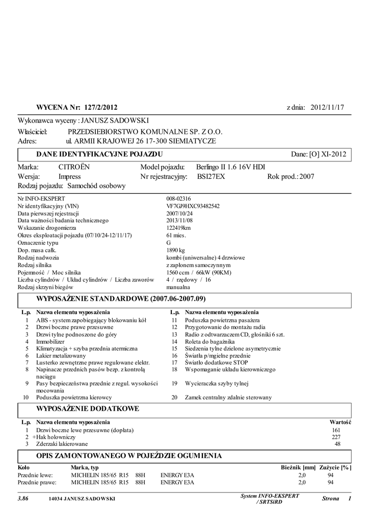 WYCENA Nr: 127/2/2012 z dnia: 2012/11/17 Wykonawca wyceny : JANUSZ SADOWSKI Właściciel: PRZEDSIEBIORSTWO KOMUNALNE SP. Z O.O. Adres: ul. ARMII KRAJOWEJ 26 17-300 SIEMIATYCZE DANE IDENTYFIKACYJNE POJAZDU Marka: CITROËN Wersja: Impress Rodzaj pojazdu: Samochód osobowy Dane: [O] XI-2012 Model pojazdu: Nr rejestracyjny: Nr INFO-EKSPERT Nr identyfikacyjny (VIN) Data pierwszej rejestracji Data ważności badania technicznego Wskazanie drogomierza Okres eksploatacji pojazdu (07/10/24-12/11/17) Oznaczenie typu Dop. masa całk. Rodzaj nadwozia Rodzaj silnika Pojemność / Moc silnika Liczba cylindrów / Układ cylindrów / Liczba zaworów Rodzaj skrzyni biegów Berlingo II 1.6 16V HDI BSI27EX Rok prod.: 2007 008-02316 VF7GJ9HXC93482542 2007/10/24 2013/11/08 122419km 61 mies. G 1890 kg kombi (uniwersalne) 4 drzwiowe z zapłonem samoczynnym 1560 ccm / 66kW (90KM) 4 / rzędowy / 16 manualna WYPOSAŻENIE STANDARDOWE (2007.06-2007.09) L.p. 1 2 3 4 5 6 7 8 9 10 Nazwa elementu wyposażenia ABS - system zapobiegający blokowaniu kół Drzwi boczne prawe przesuwne Drzwi tylne podnoszone do góry Immobilizer Klimatyzacja + szyba przednia atermiczna Lakier metalizowany Lusterko zewnętrzne prawe regulowane elektr. Napinacze przednich pasów bezp. z kontrolą naciągu Pasy bezpieczeństwa przednie z regul. wysokości mocowania Poduszka powietrzna kierowcy L.p. 11 12 13 14 15 16 17 18 Nazwa elementu wyposażenia Poduszka powietrzna pasażera Przygotowanie do montażu radia Radio z odtwarzaczem CD, głośniki 6 szt. Roleta do bagażnika Siedzenia tylne dzielone asymetrycznie Światła p/mgielne przednie Światło dodatkowe STOP Wspomaganie układu kierowniczego 19 Wycieraczka szyby tylnej 20 Zamek centralny zdalnie sterowany WYPOSAŻENIE DODATKOWE L.p. Nazwa elementu wyposażenia 1 Drzwi boczne lewe przesuwne (dopłata) 2 +Hak holowniczy 3 Zderzaki lakierowane Wartość 161 227 48 OPIS ZAMONTOWANEGO W POJEŹDZIE OGUMIENIA Koło Przednie lewe: Przednie prawe: 3.86 Marka, typ MICHELIN 185/65 R15 MICHELIN 185/65 R15 14034 JANUSZ SADO WSKI 88H 88H ENERGY E3A ENERGY E3A Bieżnik [mm] Zużycie [% ] 2,0 94 2,0 94 System INFO-EKSPERT / SRTSiRD Strona 1 127/2/2012 Tylne lewe: Tylne prawe: MICHELIN 185/65 R15 MICHELIN 185/65 R15 88H 88H ENERGY E3A ENERGY E3A 2,0 2,0 94 94 KOREKTY WARTOŚĆ BAZOWA NETTO (66 mies.) .................................... KOREKTA ZA WYPOSAŻENIE DODATKOWE .............................. KOREKTA ZA PIERWSZĄ REJESTRACJĘ ................................... KOREKTA ZA PRZEBIEG ................................................ KOREKTA ZA OGUMIENIE .............................................. KOREKTY RÓŻNE ...................................................... W tym: [%] Wartość Szczególny charakter eksploatacji -5,0 14 390 PLN 436 PLN 560 PLN - 256 PLN - 595 PLN - 756 PLN - 756 Wartość rynkowa netto wyżej zidentyfikowanego pojazdu, określona na dzień wykonania opinii wynosi: 13800 PLN (słownie: trzynaście tysięcy osiemset złotych) Wartość określono na podstawie: - notowań wartości rynkowych z katalogu 'Pojazdy Samochodowe - Wartości Rynkowe XI-2012 ' zaakceptowanych przez wykonawcę opinii, - korekt mających wpływ na wartość pojazdu 3.86 14034 JANUSZ SADO WSKI System INFO-EKSPERT / SRTSiRD Strona 2