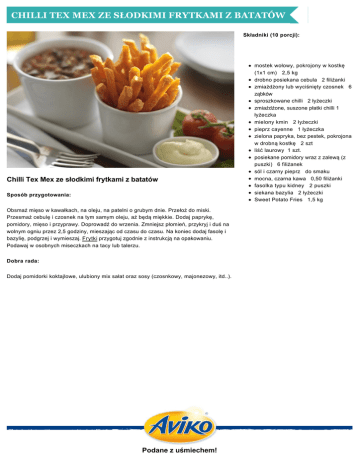 CHILLI TEX MEX ZE SŁODKIMI FRYTKAMI Z BATATÓW Składniki (10 porcji): mostek wołowy, pokrojony w kostkę (1x1 cm) 2,5 kg drobno posiekana cebula 2 filiżanki zmiażdżony lub wyciśnięty czosnek 6 ząbków sproszkowane chilli 2 łyżeczki zmiażdżone, suszone płatki chilli 1 łyżeczka mielony kmin 2 łyżeczki pieprz cayenne 1 łyżeczka zielona papryka, bez pestek, pokrojona w drobną kostkę 2 szt liść laurowy 1 szt. posiekane pomidory wraz z zalewą (z puszki) 6 filiżanek sól i czarny pieprz do smaku mocna, czarna kawa 0,50 filiżanki fasolka typu kidney 2 puszki siekana bazylia 2 łyżeczki Sweet Potato Fries 1,5 kg Chilli Tex Mex ze słodkimi frytkami z batatów Sposób przygotowania: Obsmaż mięso w kawałkach, na oleju, na patelni o grubym dnie. Przełoż do miski. Przesmaż cebulę i czosnek na tym samym oleju, aż będą miękkie. Dodaj paprykę, pomidory, mięso i przyprawy. Doprowadź do wrzenia. Zmniejsz płomień, przykryj i duś na wolnym ogniu przez 2,5 godziny, mieszając od czasu do czasu. Na koniec dodaj fasolę i bazylię, podgrzej i wymieszaj. Frytki przygotuj zgodnie z instrukcją na opakowaniu. Podawaj w osobnych miseczkach na tacy lub talerzu. Dobra rada: Dodaj pomidorki koktajlowe, ulubiony mix sałat oraz sosy (czosnkowy, majonezowy, itd..). Podane z uśmiechem!