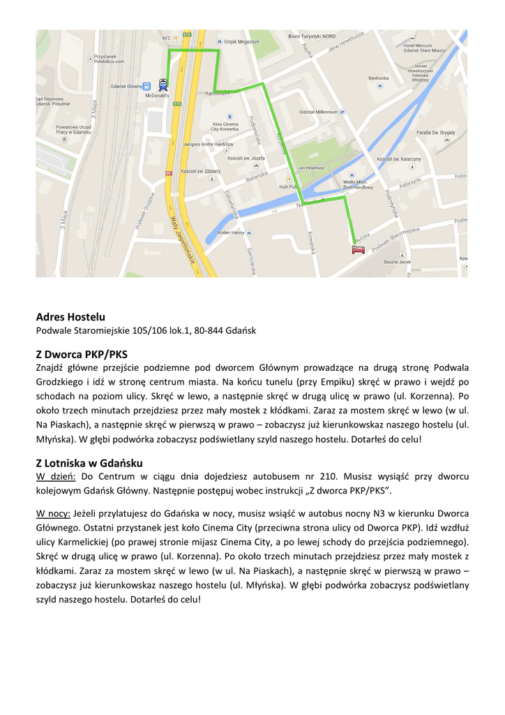 Adres Hostelu Podwale Staromiejskie 105/106 lok.1, 80-844 Gdańsk Z Dworca PKP/PKS Znajdź główne przejście podziemne pod dworcem Głównym prowadzące na drugą stronę Podwala Grodzkiego i idź w stronę centrum miasta. Na końcu tunelu (przy Empiku) skręć w prawo i wejdź po schodach na poziom ulicy. Skręć w lewo, a następnie skręć w drugą ulicę w prawo (ul. Korzenna). Po około trzech minutach przejdziesz przez mały mostek z kłódkami. Zaraz za mostem skręć w lewo (w ul. Na Piaskach), a następnie skręć w pierwszą w prawo – zobaczysz już kierunkowskaz naszego hostelu (ul. Młyńska). W głębi podwórka zobaczysz podświetlany szyld naszego hostelu. Dotarłeś do celu! Z Lotniska w Gdańsku W dzień: Do Centrum w ciągu dnia dojedziesz autobusem nr 210. Musisz wysiąść przy dworcu kolejowym Gdańsk Główny. Następnie postępuj wobec instrukcji „Z dworca PKP/PKS”. W nocy: Jeżeli przylatujesz do Gdańska w nocy, musisz wsiąść w autobus nocny N3 w kierunku Dworca Głównego. Ostatni przystanek jest koło Cinema City (przeciwna strona ulicy od Dworca PKP). Idź wzdłuż ulicy Karmelickiej (po prawej stronie mijasz Cinema City, a po lewej schody do przejścia podziemnego). Skręć w drugą ulicę w prawo (ul. Korzenna). Po około trzech minutach przejdziesz przez mały mostek z kłódkami. Zaraz za mostem skręć w lewo (w ul. Na Piaskach), a następnie skręć w pierwszą w prawo – zobaczysz już kierunkowskaz naszego hostelu (ul. Młyńska). W głębi podwórka zobaczysz podświetlany szyld naszego hostelu. Dotarłeś do celu!