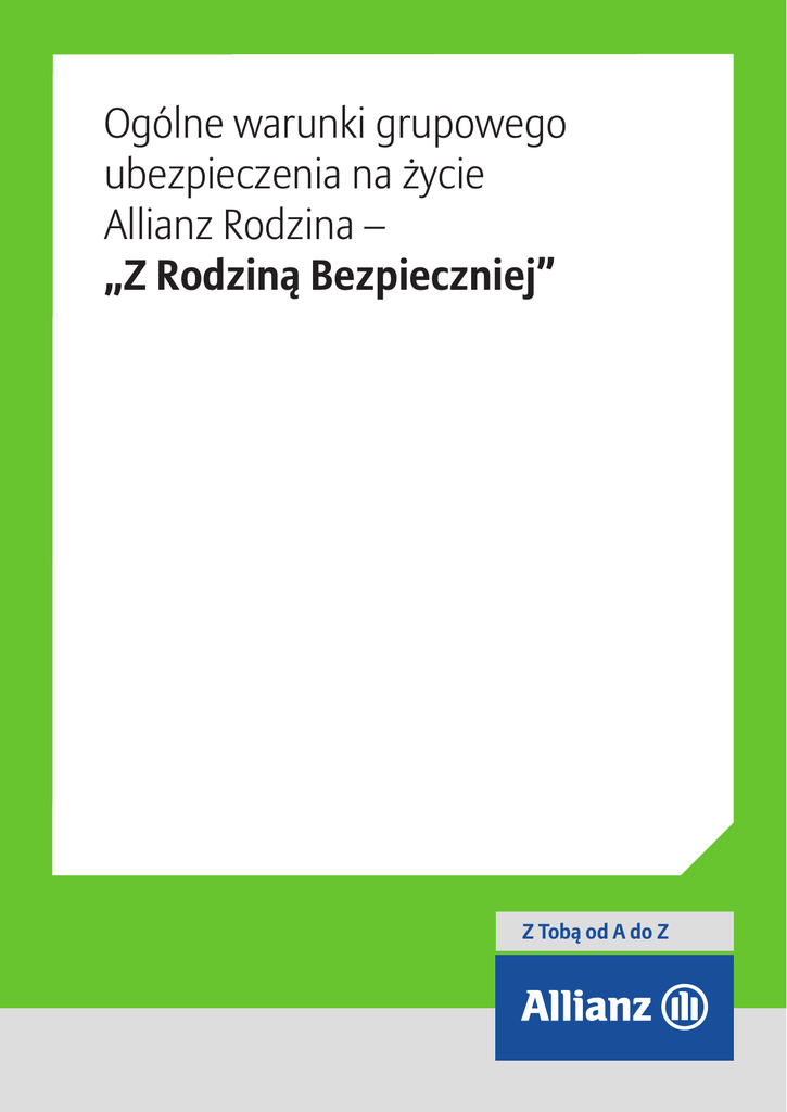 Ogólne warunki grupowego ubezpieczenia na życie Allianz Rodzina – „Z Rodziną Bezpieczniej” Z Tobą od A do Z Spis treści Ogólne warunki grupowego ubezpieczenia na życie Allianz Rodzina – „Z Rodziną Bezpieczniej” (indeks ZRB01) . . . . . . . . . . . . . . . . . . . . . 1 Umowa dodatkowa ubezpieczenia zgonu Ubezpieczonego w następstwie wypadku . . . . . . . . . . . . . . . . . . . . . . . . . . . . . . . . . . . . . . . . . . . . . . 9 Umowa dodatkowa ubezpieczenia zgonu Ubezpieczonego w następstwie wypadku przy pracy . . . . . . . . . . . . . . . . . . . . . . . . . . . . . . . . . . . 10 Umowa dodatkowa ubezpieczenia zgonu Ubezpieczonego w następstwie wypadku komunikac yjnego . . . . . . . . . . . . . . . . . . . . . . . . . . . . 11 Umowa dodatkowa ubezpieczenia zgonu Ubezpieczonego w następstwie wypadku komunikac yjnego przy pracy . . . . . . . . . . . . . . . . . . 12 Umowa dodatkowa ubezpieczenia zgonu Ubezpieczonego w następstwie zawału serca lub udaru mózgu . . . . . . . . . . . . . . . . . . . . . . . . . 13 Umowa dodatkowa ubezpieczenia wystąpienia trwałego uszczerbku na zdrowiu Ubezpieczonego w następstwie wypadku – pełna ochrona . . . . . . . . . . . . . . . . . . . . . . . . . . . . . . . . . . . . . . . . . . . . . . . . . . . . . . . . . . . . . . . . . . . . . . . . . . . . . . . . . . . . . . . . . . . . . . . . . . . . . . . . . . 14 Umowa dodatkowa ubezpieczenia wystąpienia u Ubezpieczonego poważnego zachorowania . . . . . . . . . . . . . . . . . . . . . . . . . . . . . . . . . . . . 16 Umowa dodatkowa ubezpieczenia leczenia Ubezpieczonego w szpitalu . . . . . . . . . . . . . . . . . . . . . . . . . . . . . . . . . . . . . . . . . . . . . . . . . . . . . . . . 19 Umowa dodatkowa ubezpieczenia leczenia Ubezpieczonego w szpitalu w następstwie wypadku . . . . . . . . . . . . . . . . . . . . . . . . . . . . . . . . . 20 Umowa dodatkowa ubezpieczenia leczenia Ubezpieczonego w szpitalu w następstwie wypadku przy pracy . . . . . . . . . . . . . . . . . . . . . . . 21 Umowa dodatkowa ubezpieczenia leczenia Ubezpieczonego w szpitalu – pełna ochrona . . . . . . . . . . . . . . . . . . . . . . . . . . . . . . . . . . . . . . . . . 22 Umowa dodatkowa ubezpieczenia leczenia operacyjnego Ubezpieczonego . . . . . . . . . . . . . . . . . . . . . . . . . . . . . . . . . . . . . . . . . . . . . . . . . . . . . 23 Załącznik do umowy dodatkowej ubezpieczenia leczenia operacyjnego Ubezpieczonego – kategorie trudności leczenia operacyjnego . . . . . . . . . . . . . . . . . . . . . . . . . . . . . . . . . . . . . . . . . . . . . . . . . . . . . . . . . . . . . . . . . . . . . . . . . . . . . . . . . . . . . . . . . . . . . . . . . . . . . . . . . . . 24 Umowa dodatkowa ubezpieczenia świadczeń opiekuńczych dla Ubezpieczonego oraz jego Rodziny . . . . . . . . . . . . . . . . . . . . . . . . . . . . . . . 25 Umowa dodatkowa ubezpieczenia zgonu współmałżonka Ubezpieczonego . . . . . . . . . . . . . . . . . . . . . . . . . . . . . . . . . . . . . . . . . . . . . . . . . . . . . 28 Umowa dodatkowa ubezpieczenia zgonu współmałżonka Ubezpieczonego w następstwie wypadku . . . . . . . . . . . . . . . . . . . . . . . . . . . . . 29 Umowa dodatkowa ubezpieczenia wystąpienia u współmałżonka Ubezpieczonego poważnego zachorowania . . . . . . . . . . . . . . . . . . . . . 30 Umowa dodatkowa ubezpieczenia zgonu rodzica Ubezpieczonego lub rodzica współmałżonka Ubezpieczonego . . . . . . . . . . . . . . . . . . . 33 Umowa dodatkowa ubezpieczenia urodzenia się dziecka Ubezpieczonemu . . . . . . . . . . . . . . . . . . . . . . . . . . . . . . . . . . . . . . . . . . . . . . . . . . . . . 34 Umowa dodatkowa ubezpieczenia zgonu dziecka Ubezpieczonego i urodzenia się martwego dziecka . . . . . . . . . . . . . . . . . . . . . . . . . . . . . 35 Umowa dodatkowa ubezpieczenia osierocenia dziecka przez Ubezpieczonego . . . . . . . . . . . . . . . . . . . . . . . . . . . . . . . . . . . . . . . . . . . . . . . . . . 36 Umowa dodatkowa ubezpieczenia wystąpienia u dziecka Ubezpieczonego poważnego zachorowania . . . . . . . . . . . . . . . . . . . . . . . . . . . . 37 Umowa dodatkowa ubezpieczenia inwalidztwa Ubezpieczonego . . . . . . . . . . . . . . . . . . . . . . . . . . . . . . . . . . . . . . . . . . . . . . . . . . . . . . . . . . . . . . . 39 Umowa dodatkowa ubezpieczenia wystąpienia u Ubezpieczonego, w następstwie wypadku przy pracy, zachorowania na przewlekłe wirusowe zapalenie wątroby typu B albo C, lub zakażenie wirusem HIV pomimo przejścia leczenia antyretrowirusowego . . . . . . . . . . . . . . . . . . . . . . . . . . . . . . . . . . . . . . . . . . . . . . . . . . . . . . . . . . . . . . . . . . . . . . . . . . . . . . . . . . . . . . . . . . . . . . . . . . . 40 § 1. Postanowienia ogólne 1. Nin iejsze ogólne war unk i ubezpieczen ia (o.w.u.) stosuje się w umowach grupowego ubezpieczen ia na życie zaw ieranych przez TU Allianz Życie Polska S.A., zwane dalej Allianz Życie, z Ubezpieczając ym i, na rzecz Ubezpieczonych. 2. Użyte w nin iejszych o.w.u. określen ia oznaczają: 1) akt przemoc y – skierowan ie czynności fiz ycznej bezpośredn io prze ciwko Ubezpieczonemu lub odpow iedn io Współubezpieczonemu, co zniewala go do poddan ia się wol i używającego przemoc y i określonego zachowan ia się, lub przec iwko rzeczy posiadanej przez Ubezpieczo nego lub odpow iedn io Współubezpieczonego, przez co swoboda wol i Ubezpieczonego lub odpow iedn io Współubezpieczonego – w zak resie posiadan ia rzeczy czy władan ia nią lub kor zystan ia z niej – zostaje ogran iczona; 2) akt terror u – nielegalne akcje organ izowane z pobudek ideolog icznych lub pol it ycznych, indyw idua lne lub grupowe, skierowane przeciwko osobom lub obiektom w celu wprowad zen ia chaosu, zastraszen ia lud ności i dezorgan izacji życia publicznego przy użyciu przemoc y oraz skierowane przeciw społeczeństwu z zam iarem jego zastraszen ia dla 
